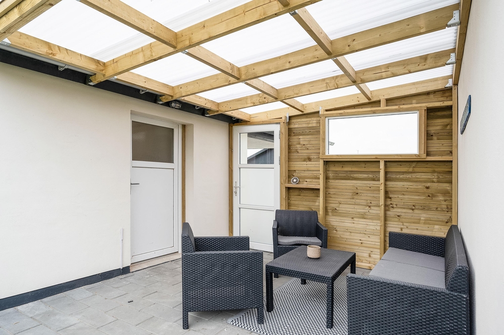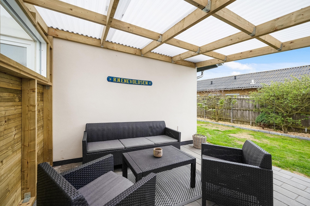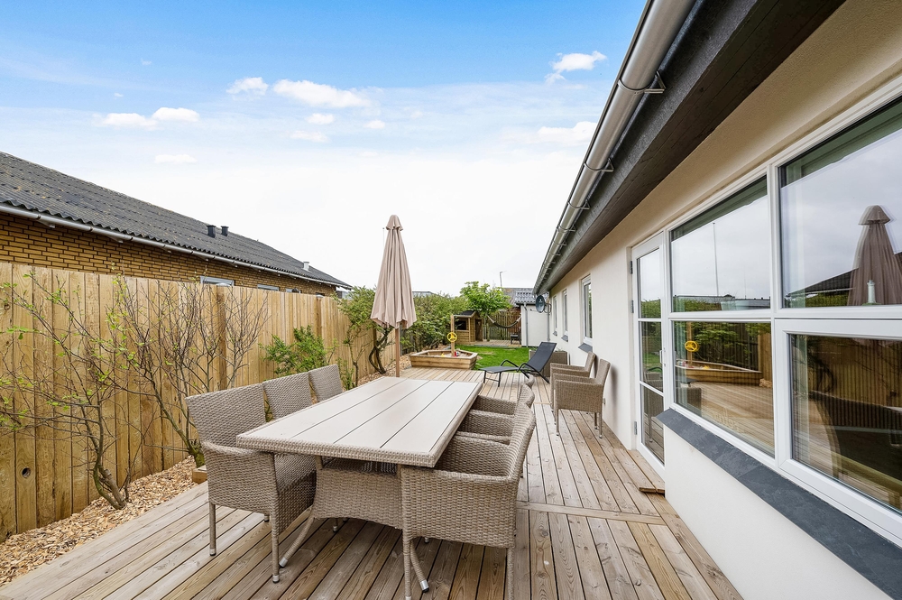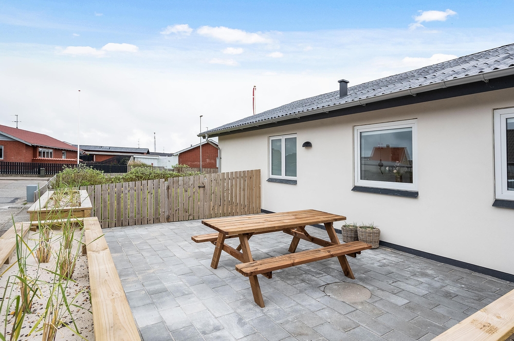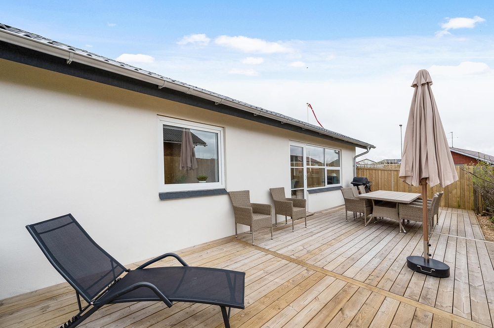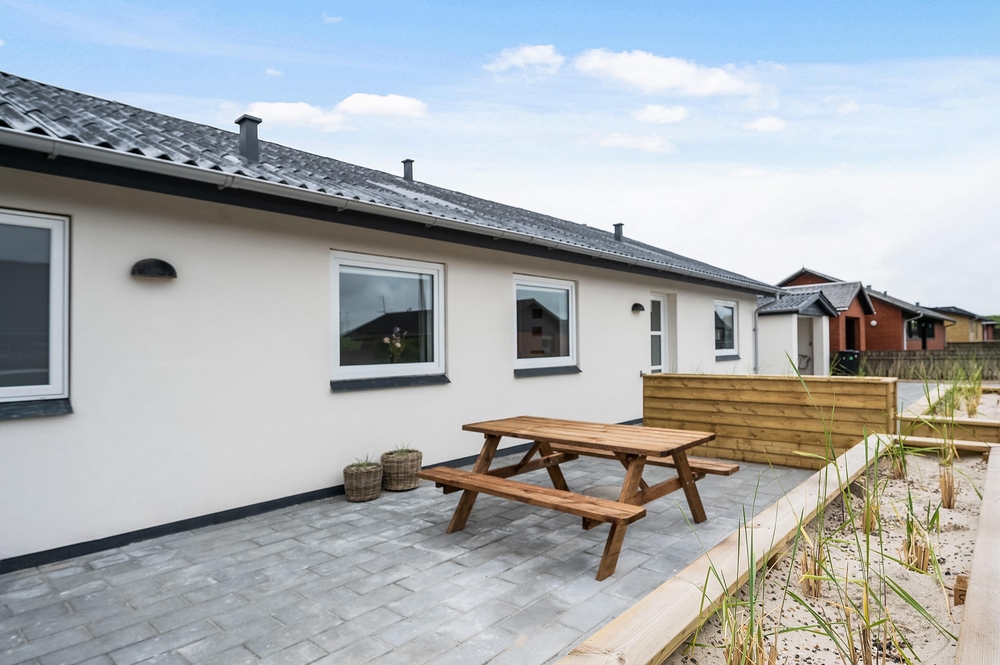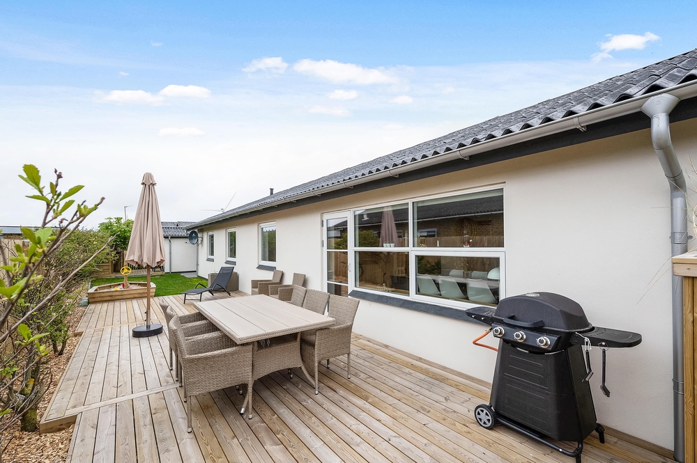 På terrassen er der også lagt op til mange hyggelige timer for hele familien om aftenen. Afslut dagene med en skøn middag på grillen med et godt glas vin til. Bagefter kan I gå den korte tur på blot 200 meter til Vesterhavet, hvor I kan opleve en helt fantastisk solnedgang.
