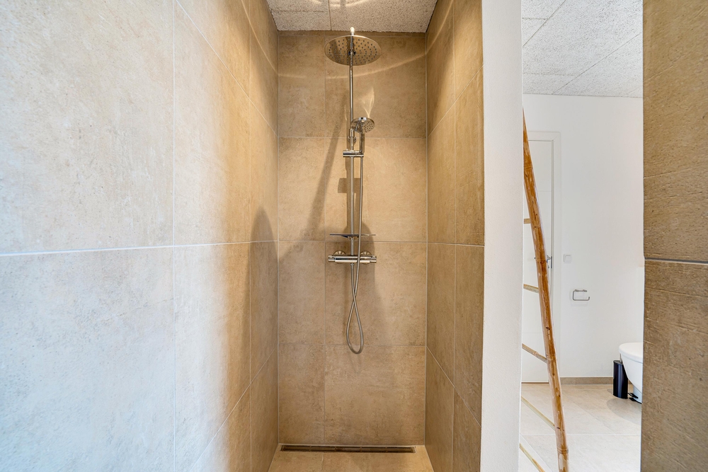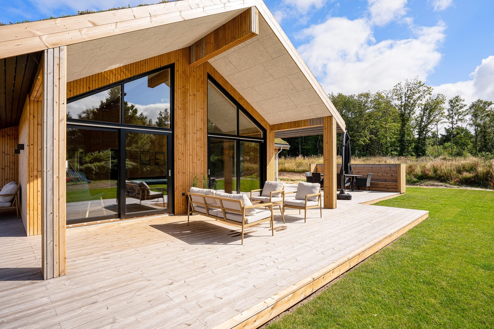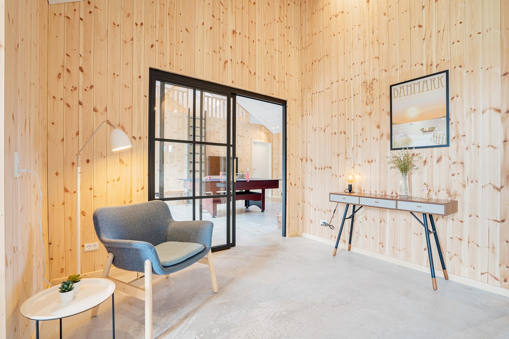 Det 172 kvadratmeter store aktivitetshus blev bygget i 2021, og her er der 4 soverum, som alle er udstyret med dobbeltsenge. Oppe på den hyggelige hems er der enkeltsenge. Hele sommerhuset har gulvvarme, så I skal ikke være bekymret for, at I kommer til at fryse fødderne.
