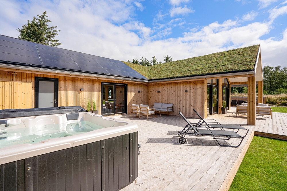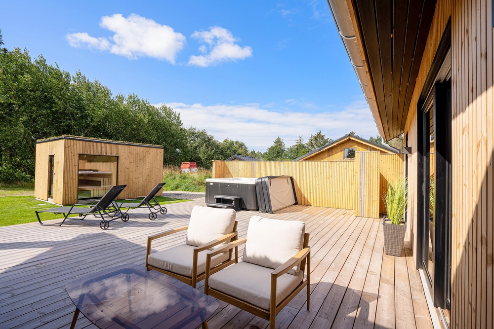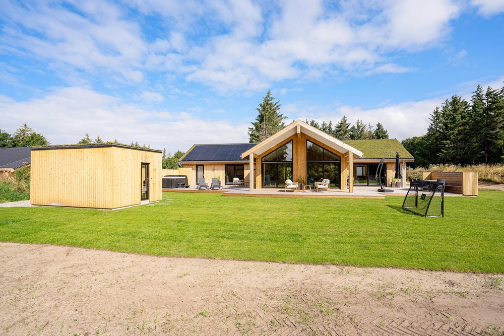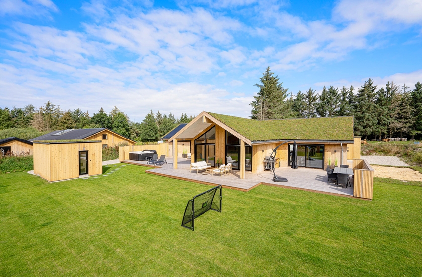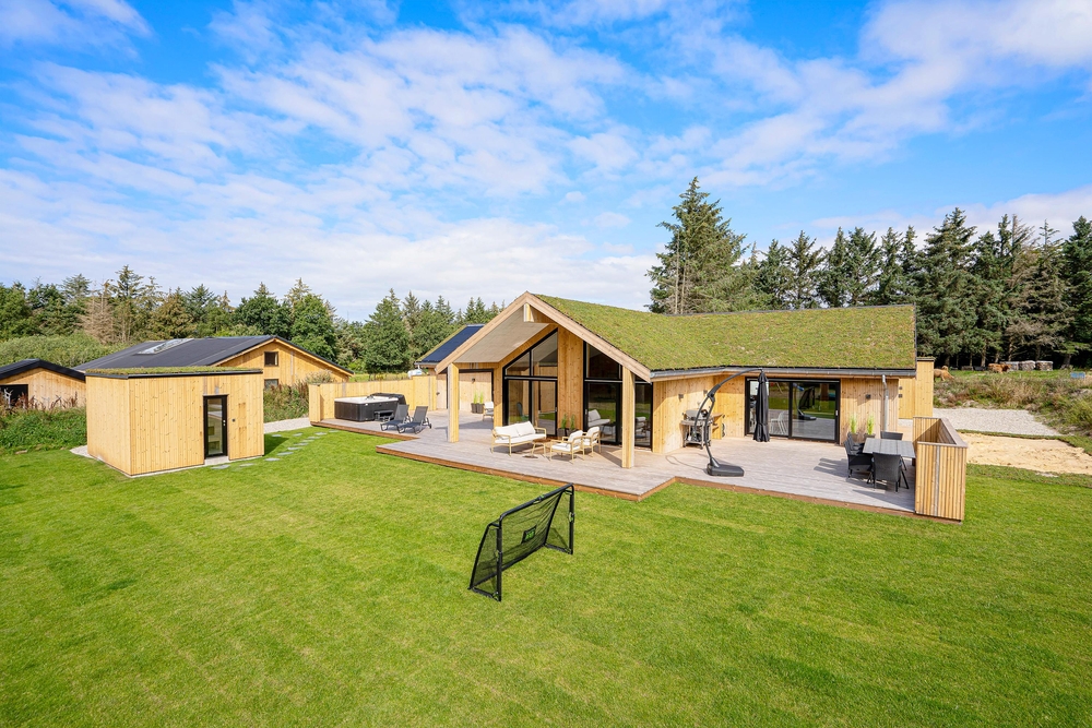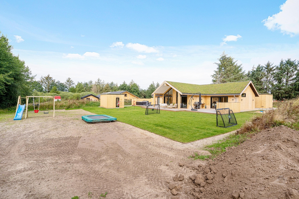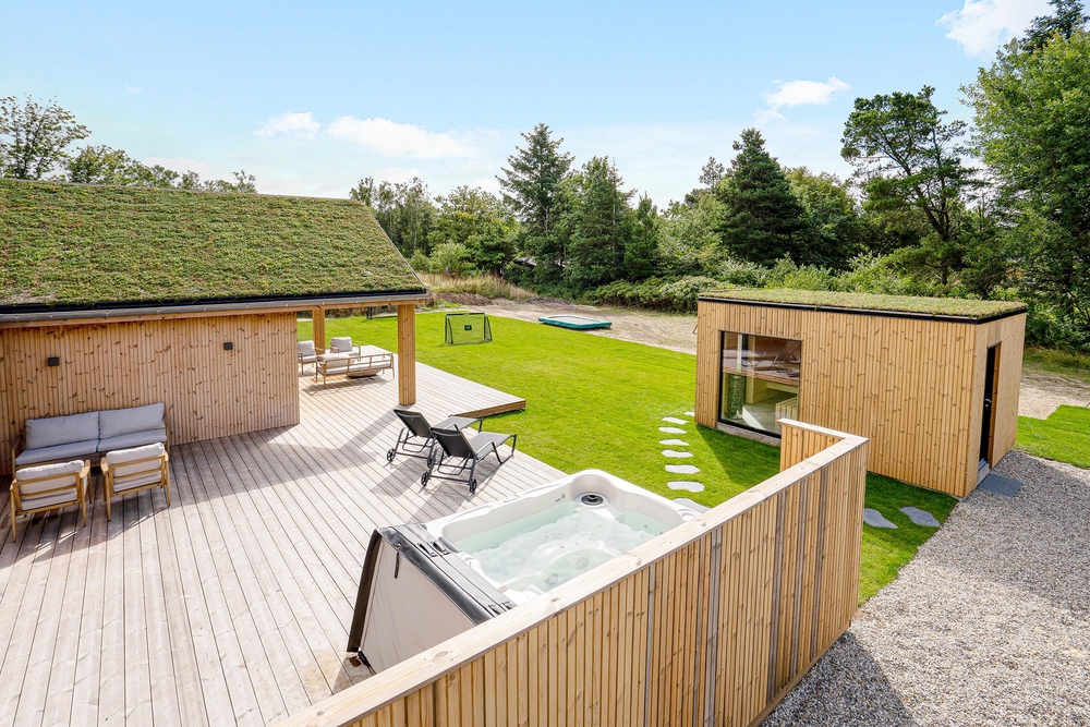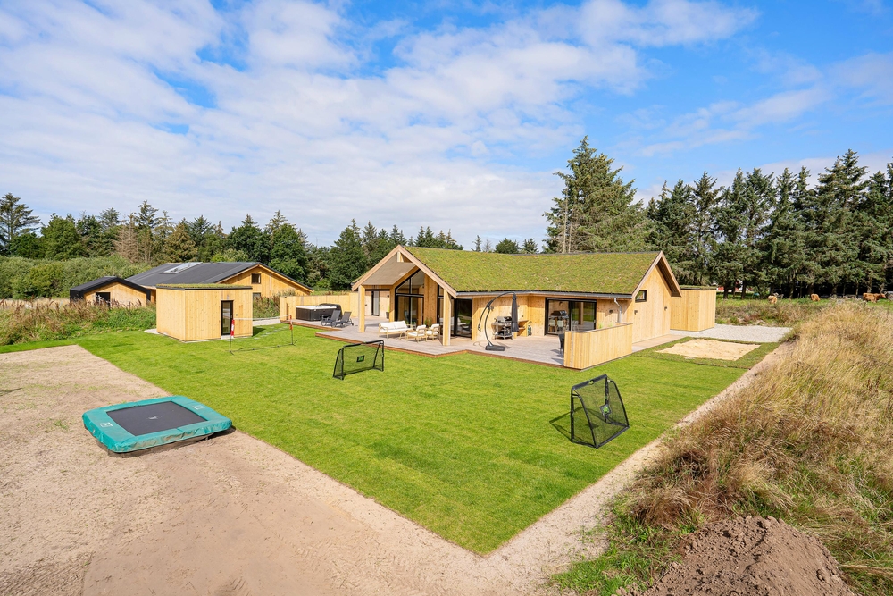 På Strandgodsvej 15 i Henne ligger dette fantastiske sommerhus, som blev opført i 2021, med plads til 10 personer og 2 hunde. Den store naturgrund har både udendørsspa, en lækker udesauna, udendørs bruser og udekøkken, mens I indenfor finder et spændende aktivitetsrum. I hele sommerhuset er der gulvvarme, og der er tilmed en hyggelig hems.