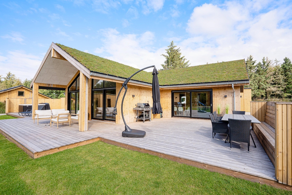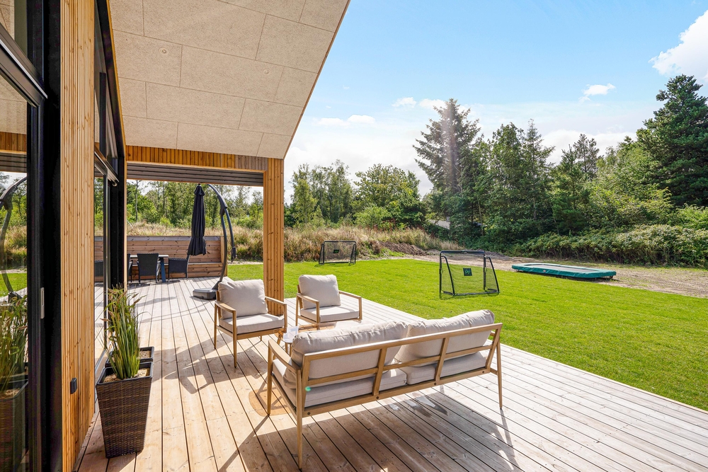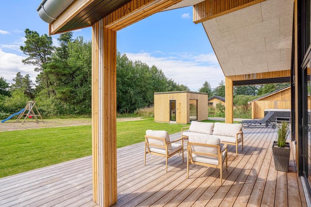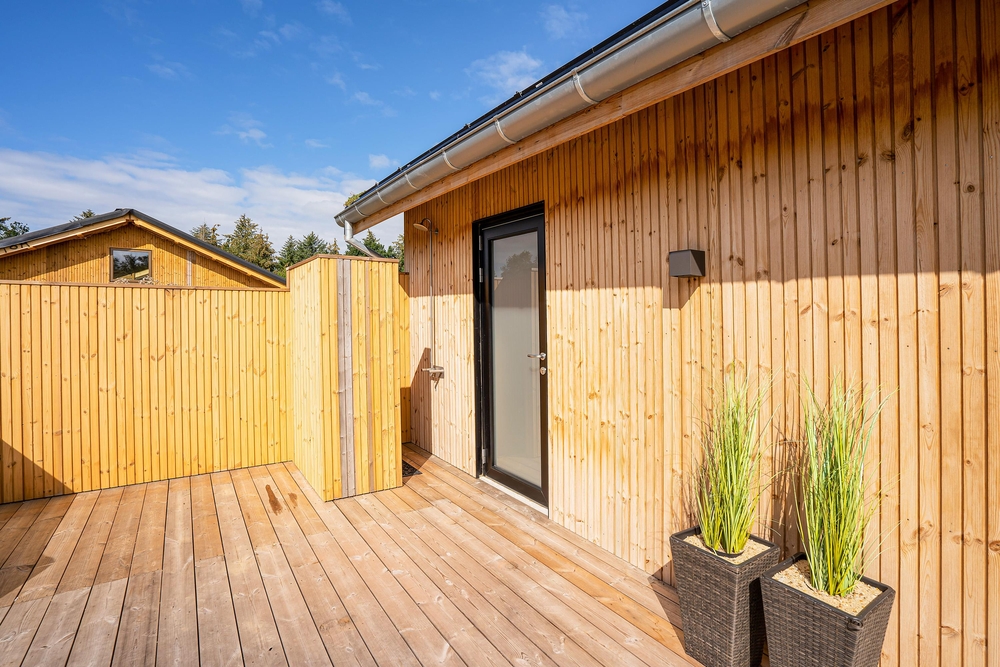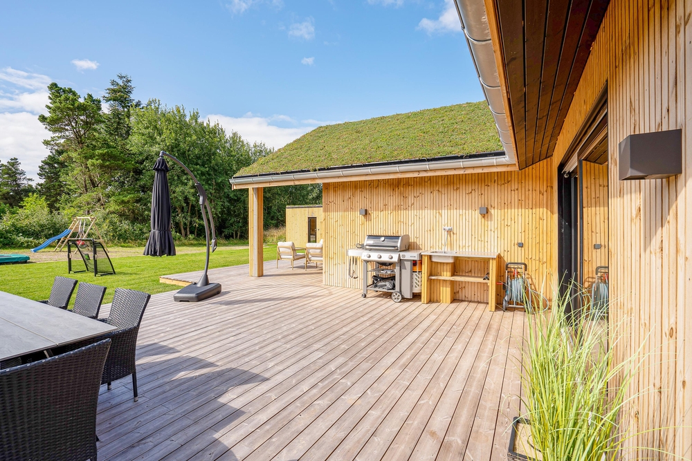I sommerhusets baghave finder I terrassen og udekøkkenet. Her kan I lave mad under åben himmel og benytte jer af sommerhusets grill. Der er både havemøbler og solvogne, så I kan slappe af i solen ? eller finde et sted i læ. En udendørs bruser* sørger for, at I kan få et forfriskende skyl under åben himmel.