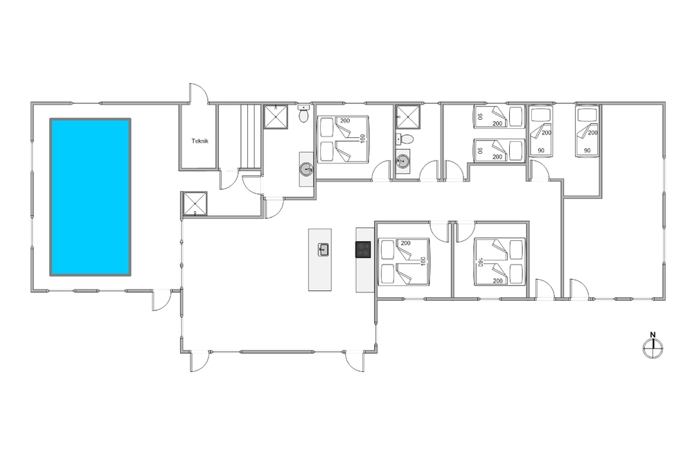 Sommerhuset rummer hele fem soveværelser, de tre af dem med behagelige dobbeltsenge 160 x 200. De fire enkeltsenge er 90 cm brede.