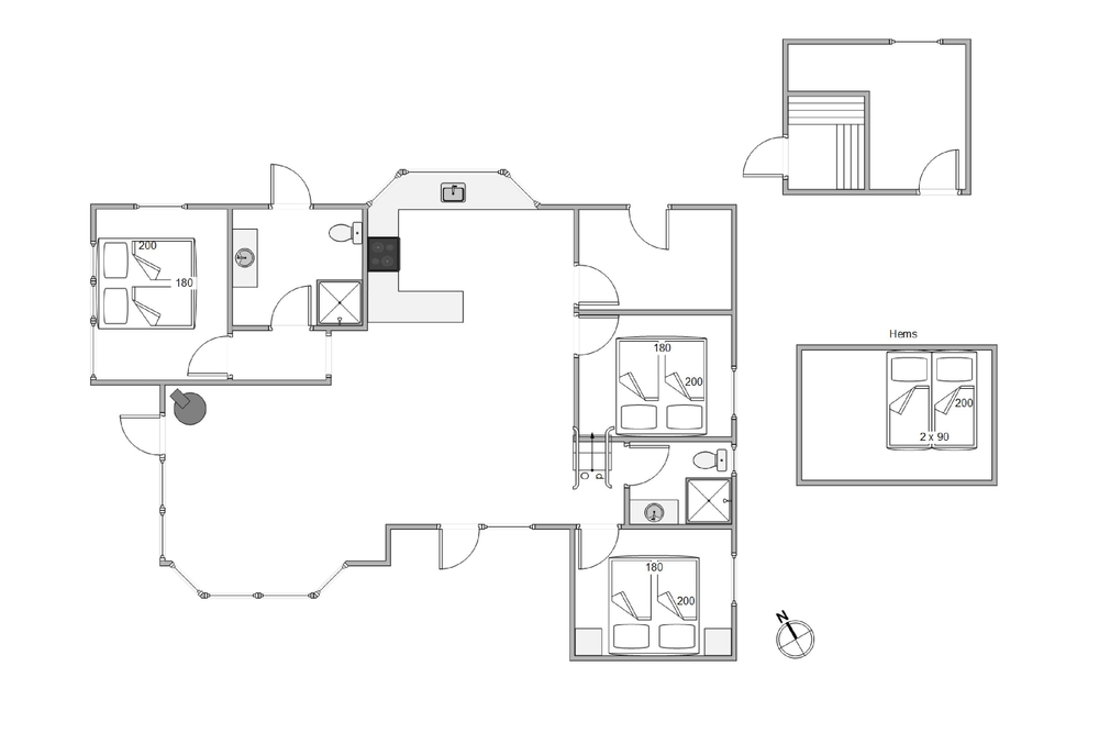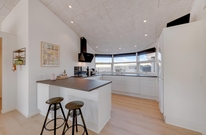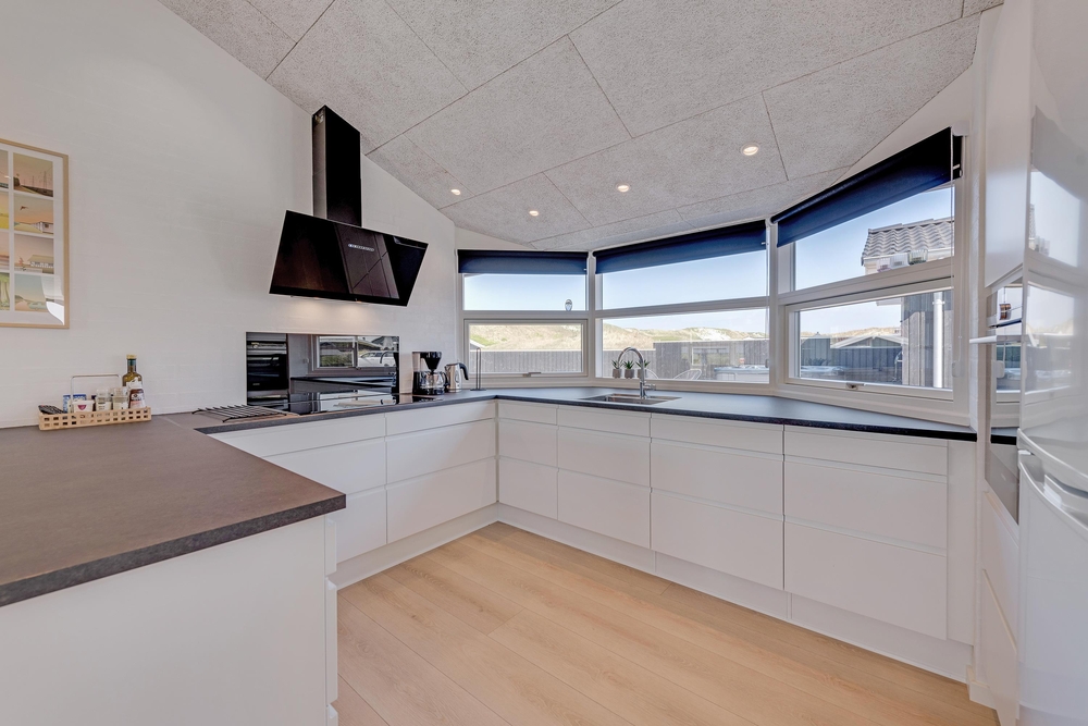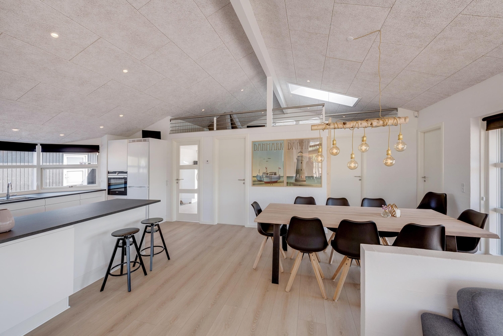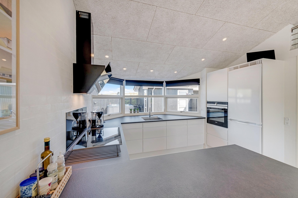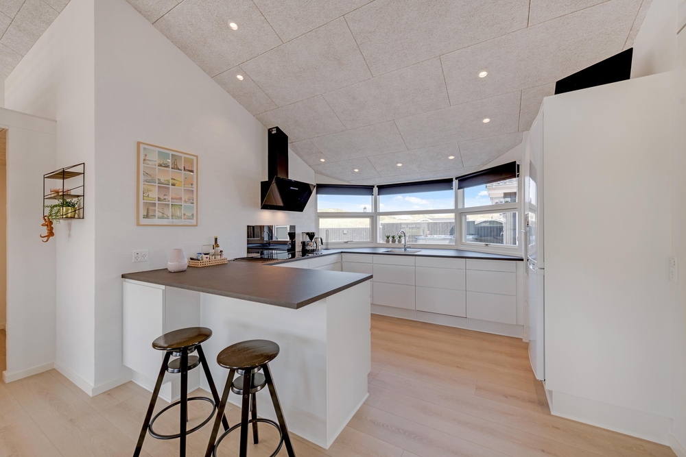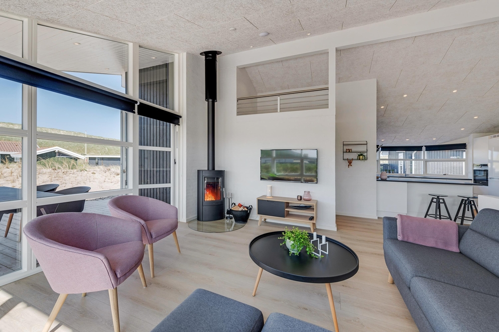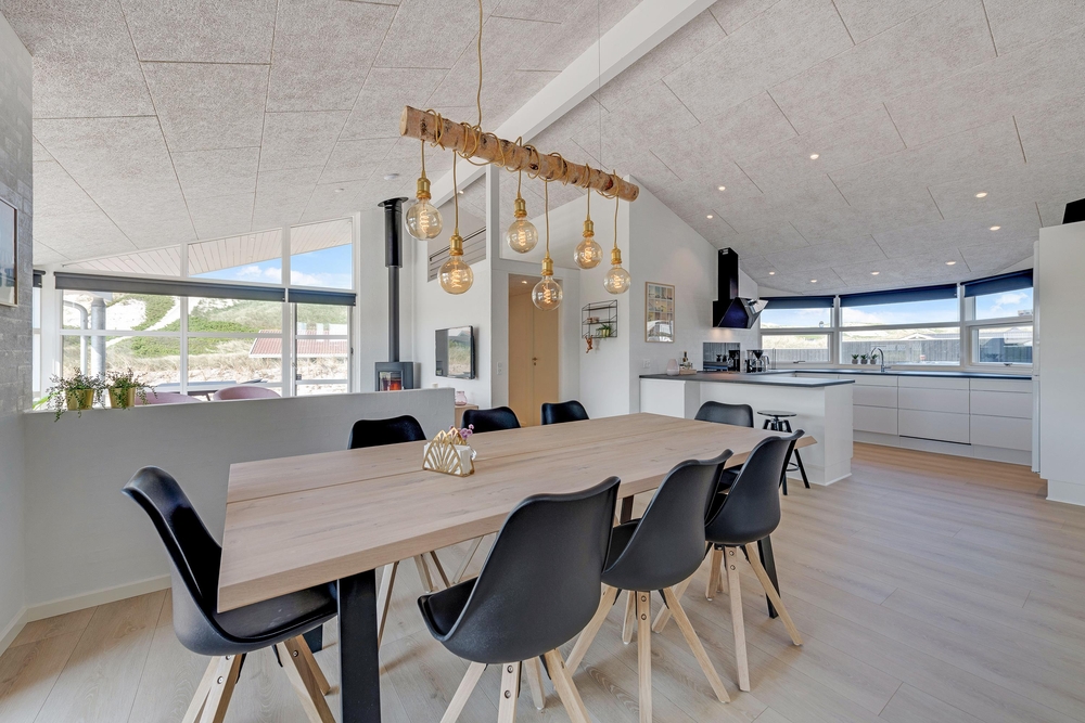 Husets centrum er det store opholdsrum, hvor køkken og stue er slået sammen. Her sørger store vinduesfronter for at åbne op og invitere solens lys såvel som de naturskønne omgivelser indenfor. Den klassiske brændeovn er selvfølgelig på plads, så I får en god varme hele året rundt.
