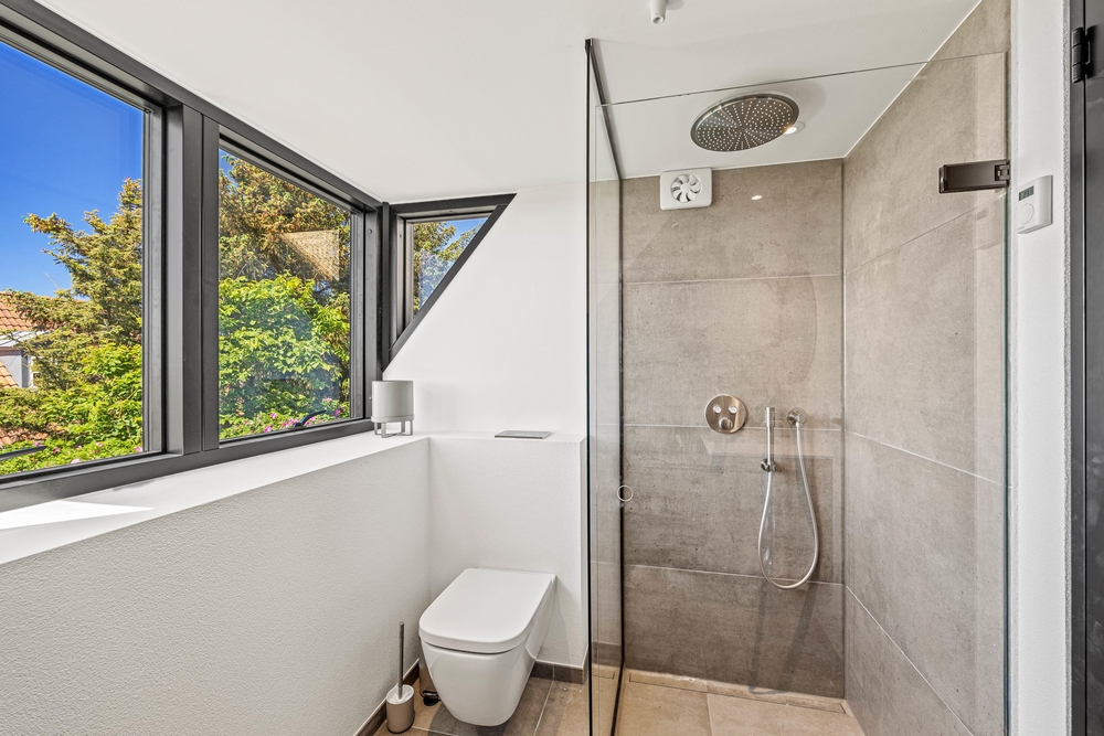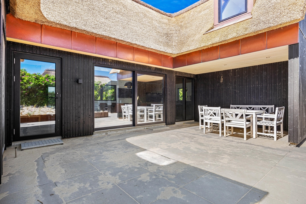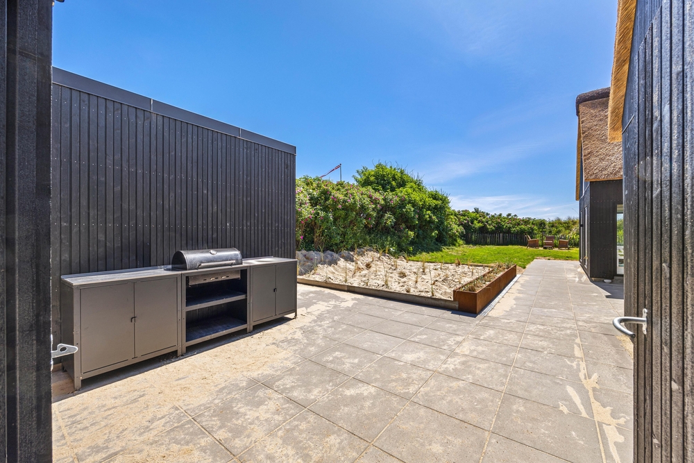 En betonmur giver læ på af en stor og delvist overdækket terrasse, hvor havemøbler og liggestole står klar til jer, så I kan nyde alle solskinstimerne. Bliver det for meget af det gode, er der også mulighed for at finde en god plads i skyggen.