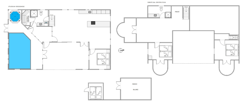 Efter en lang dag med masser af vand og sjov, står de 4 soveværelser klar til jer. Alle soveværelser er udstyret med komfortable dobbeltsenge og er særdeles hyggeligt indrettet. Et soveværelse ligger i stueetagen, yderligere to på 1. salg og det 4 i et lille hyggeligt anneks. I alt er der to fuldt udstyrede badeværelser. Et af dem ligger i stueetagen, og det andet ligger ovenpå.