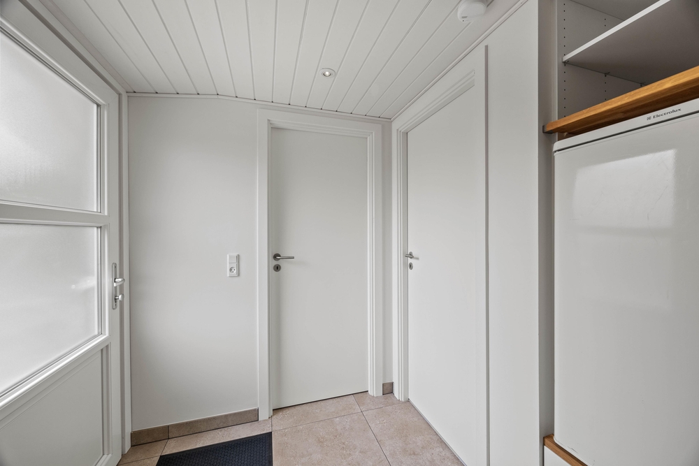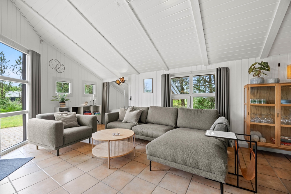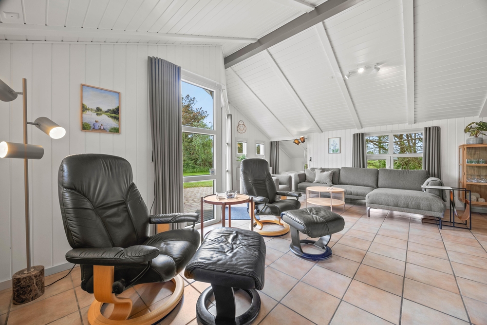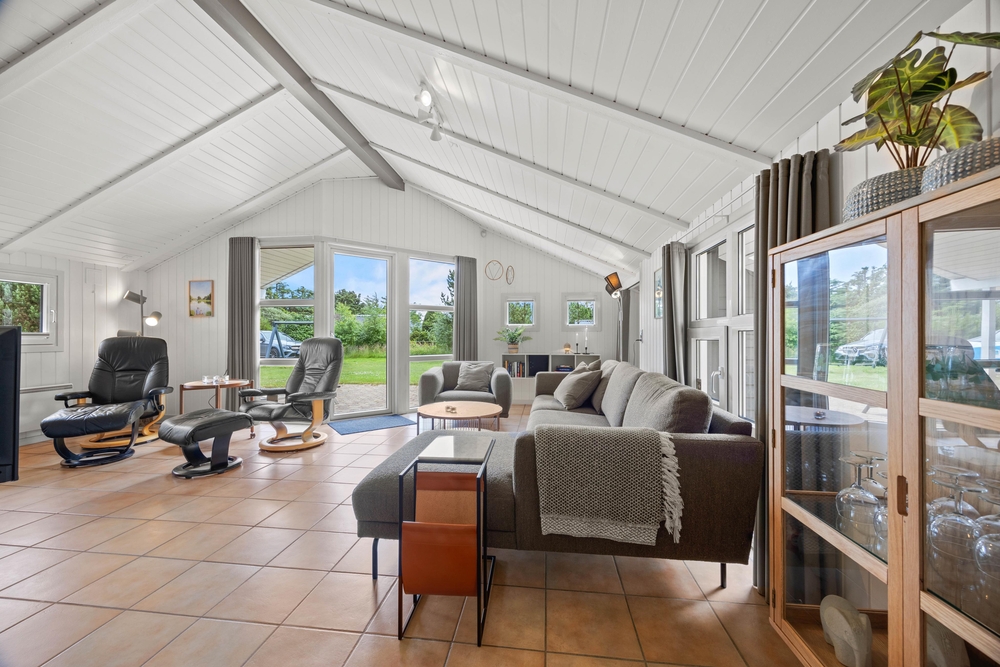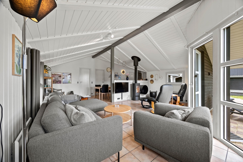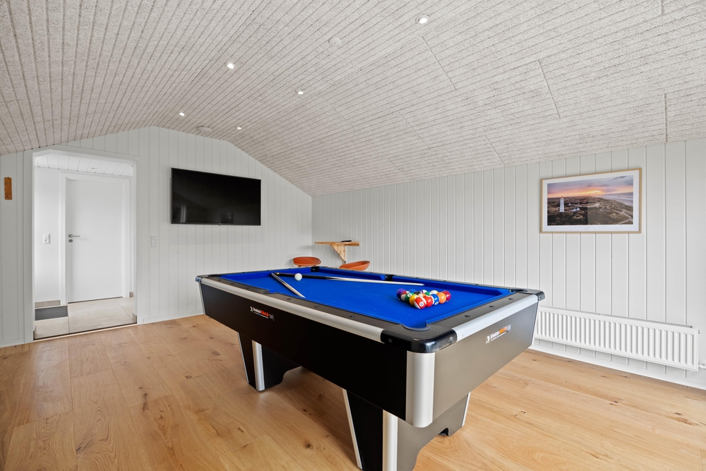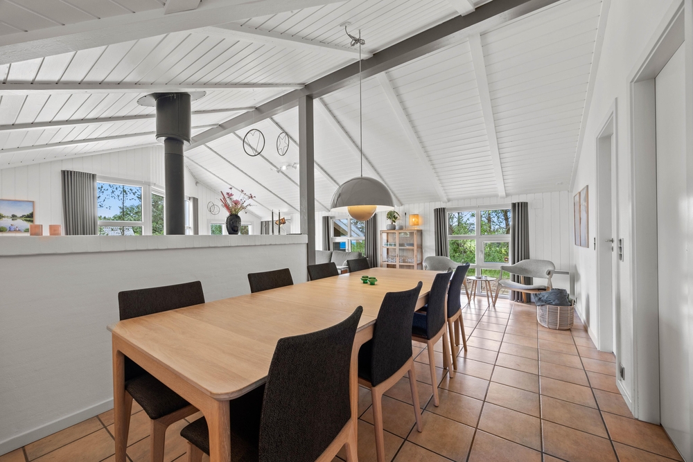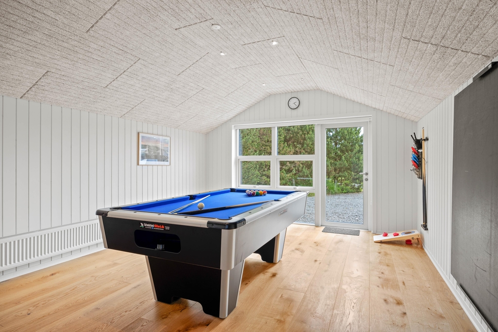 I Strandparken 9 føler man sig velkommen straks, man træder ind i det hyggelige sommerhus. Den lyse indretning, god plads på de 150 veldisponerede m2 og det fine lysindfald fra vinduespartierne sætter feriestemningen i top. Her er ideelt til den aktive familie og venner, som holder af at dyrke både aktiviteter og afslapning sammen. I stuen kan I hygge jer sammen foran brændeovnen ? se en film, eller nyde udsigten over terrassen og plænegrunden. I det åbne køkken er alt, hvad I har brug for til at forkæle hinanden med hjemmelavede måltider. Lystfiskerne iblandt jer vil glædes over den separate fryser på 200 liter. De aktive kan tage sig et spil billard eller bordtennis før middagen.