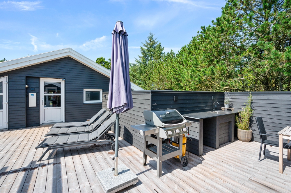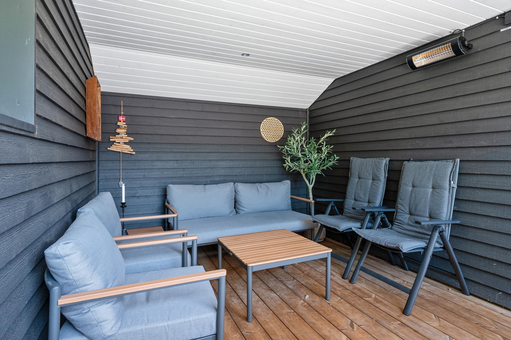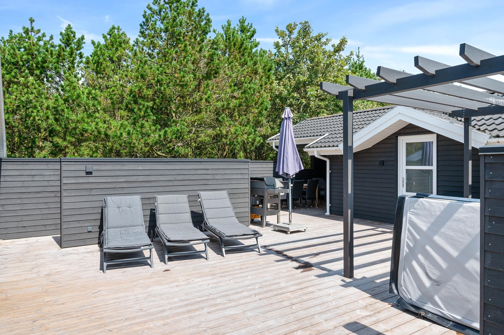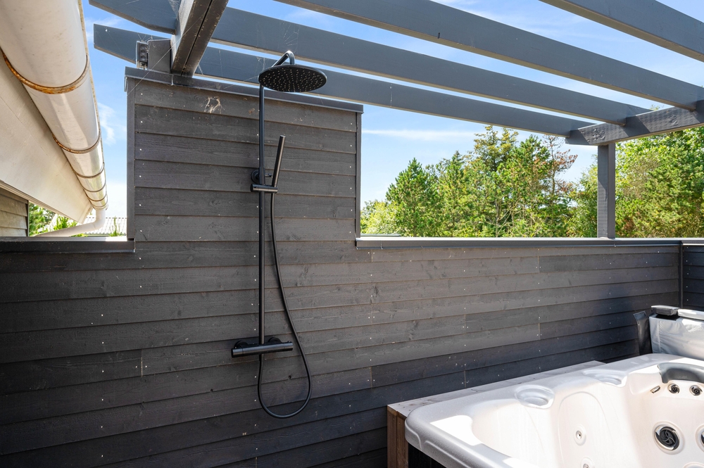 Den ugenerte, 2.100 m2 store plænegrund er omgivet af træer, så I kan færdes frit. Imellem sommerhuset og annekset er et hyggeligt terrassemiljø, og rundt om sommerhuset er både åben-, afskærmet- og overdækket terrasse, så I kan finde en god krog i al slags vejr. Komfortable terrassemøbler og terrassevarmer indbyder til at nyde både dags- og aftentimer der. Benyt jer af den lækre udespa og udebruser, og lad børnene gynge og lege i sandkassen. Udebruseren kan benyttes fra 1. april til 31. oktober.