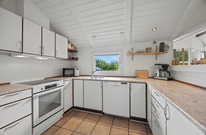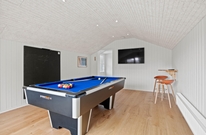 I Strandparken 9 føler man sig velkommen straks, man træder ind i det hyggelige sommerhus. Den lyse indretning, god plads på de 150 veldisponerede m2 og det fine lysindfald fra vinduespartierne sætter feriestemningen i top. Her er idéelt til den aktive familie og venner, som holder af at dyrke både aktiviteter og afslapning sammen. I stuen kan I hygge jer sammen foran brændeovnen ? se en film, eller nyde udsigten over terrassen og plænegrunden. I det åbne køkken er alt, hvad I har brug for til at forkæle hinanden med hjemmelavede måltider. Lystfiskerne iblandt jer vil glædes over den separate fryser på 200 liter. De aktive kan tage sig et spil billard eller bordtennis før middagen.