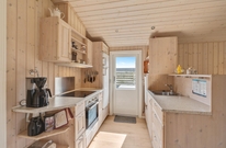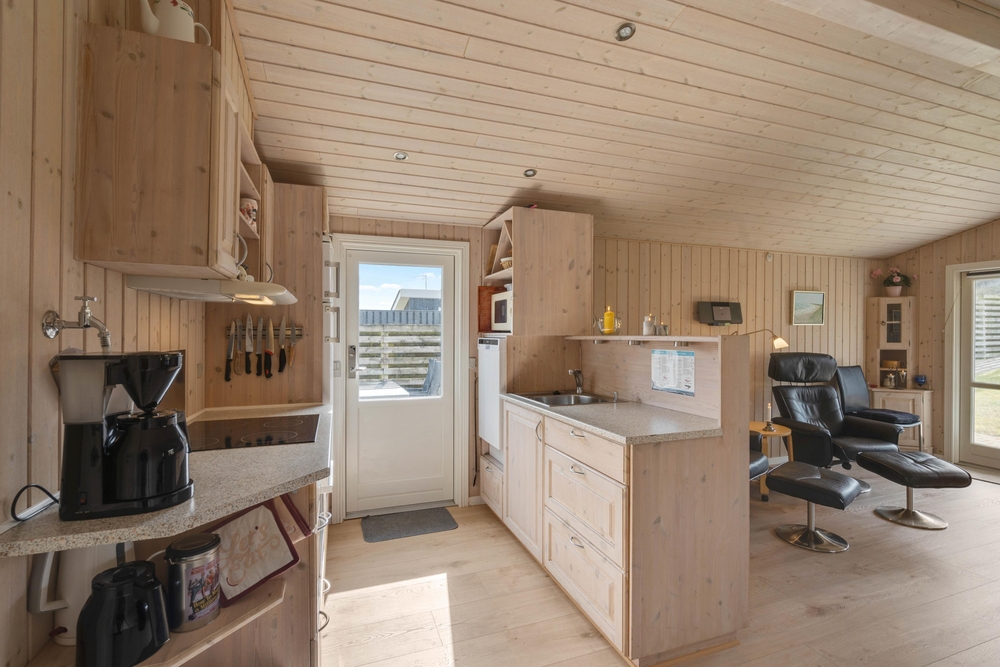 Sommerhusets hjerte er alrummet, der forener køkken, stue og spiseplads. Her kan I være sammen om madlavning, spil og film ? og er der nogle af jer, der står for madlavningen, mens andre ser film, kan I stadig nyde hinanden selskab. I alrummet sørger brændeovnen for at fuldende den hyggelige feriestemning med sin knitren i baggrunden og varme.