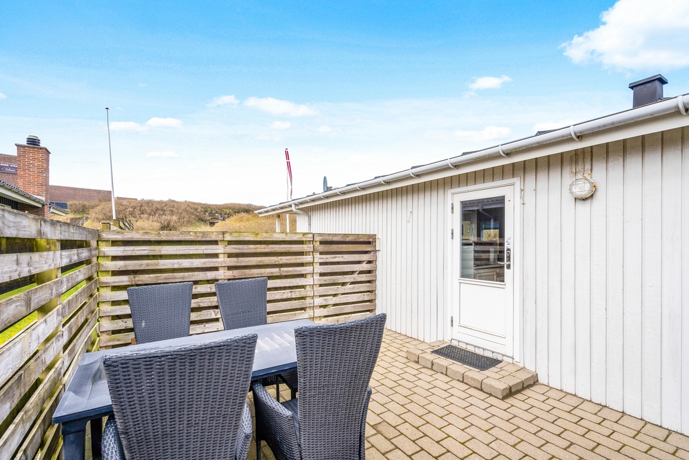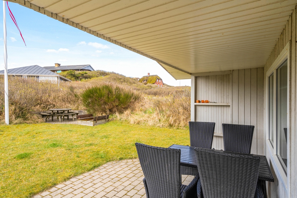 Til sommerhuset er der et skønt udeområde, hvor det er oplagt at tilbringe de varme feriedage. Her kan I blandt andet finde jer til rette og slappe af i havemøbler og liggestole på terrassen med lyden af brændingen i baggrunden. Terrassen er delvist overdækket, og derfor har I også mulighed for at sidde i skygge, hvis I skulle få brug for det.
