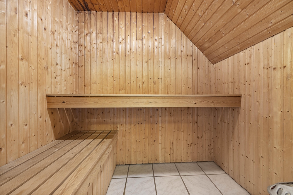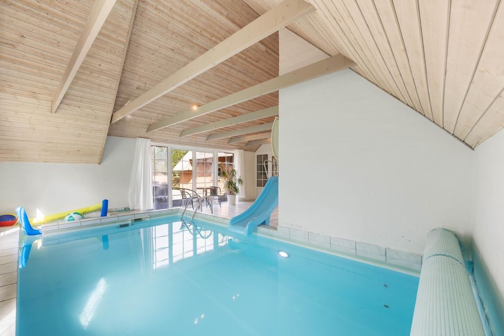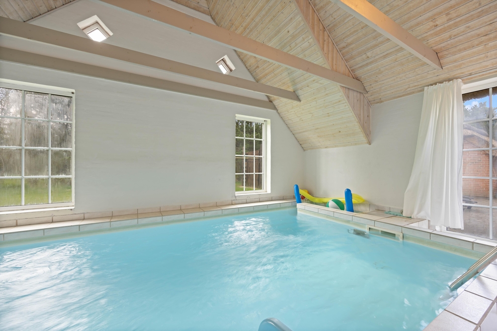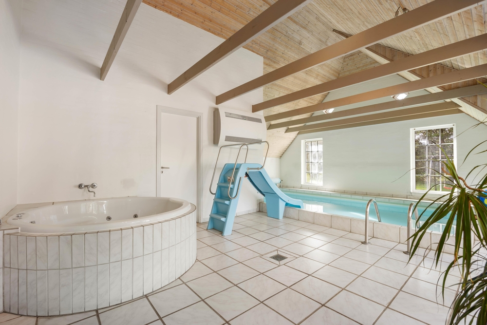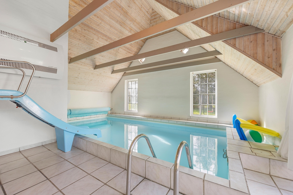 I sommerhuset er der lagt op til sjove vandaktiviteter med både pool, spabad og sauna. Vandet i den 18 m² store pool bliver opvarmet med en energibesparende varmepumpe. Poolen har svømmetræner, der er en rutsjebane til børnene og god plads at boltre sig på. Det er et kæmpe plus dette feriehus har badeværelse i forbindelse med poolen, som sikrer det våde badetøj, bliver i pool rummet. Ligeså skal ingen rende med våde fødder igennem huset, når der er toilet lige ved.