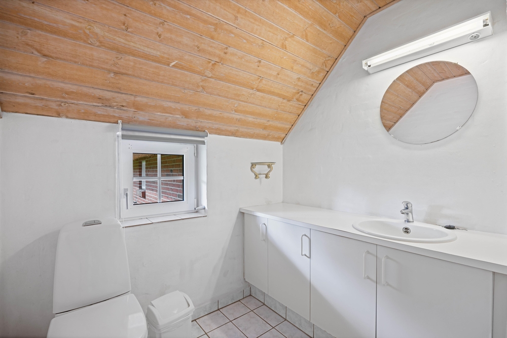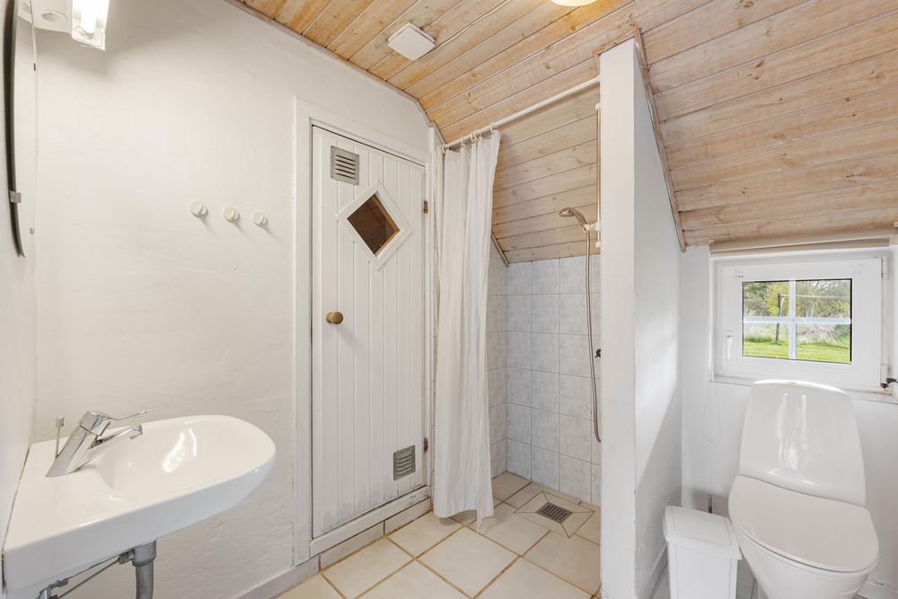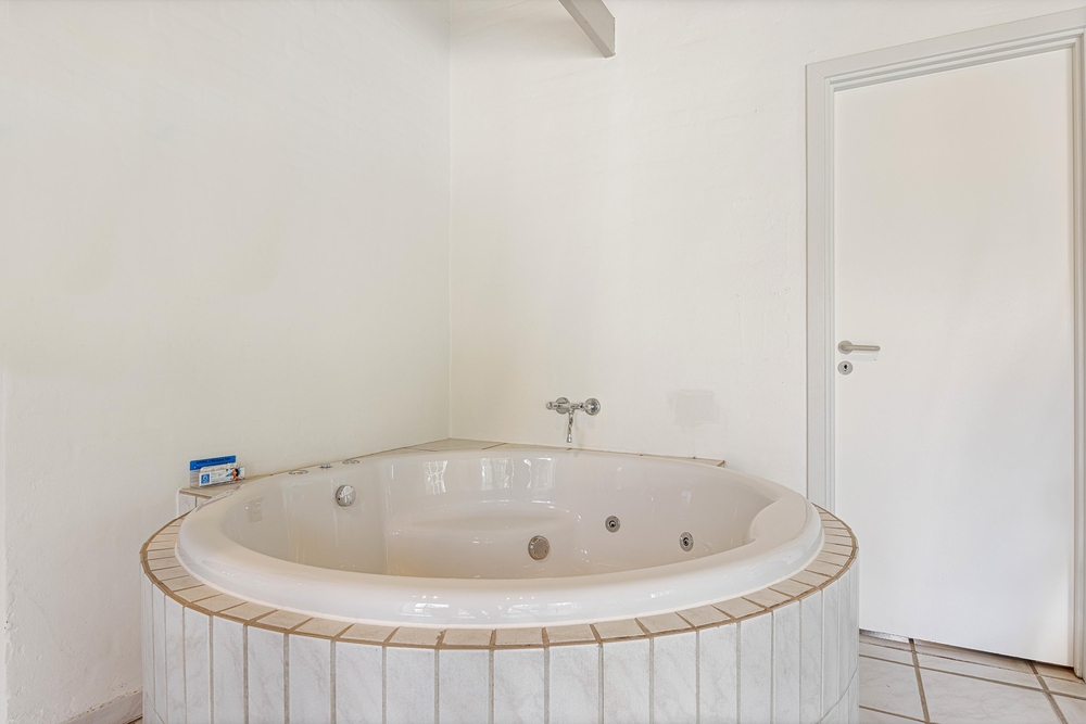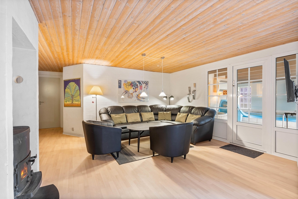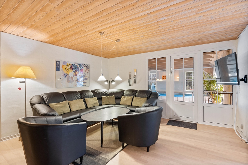 I sommerhuset er der lagt op til sjove vandaktiviteter med både pool, spabad og sauna. Vandet i den 18 m² store pool bliver opvarmet med en energibesparende varmepumpe. Poolen har svømmetræner, der er en rutsjebane til børnene og god plads at boltre sig på. Det er et kæmpe plus dette feriehus har badeværelse i forbindelse med poolen, som sikrer det våde badetøj, bliver i pool rummet. Ligeså skal ingen rende med våde fødder igennem huset, når der er toilet lige ved.