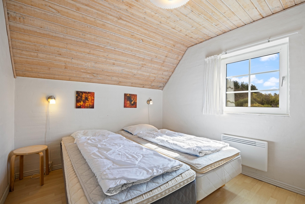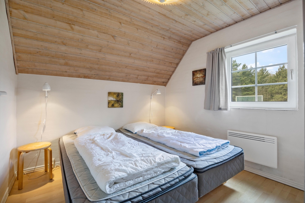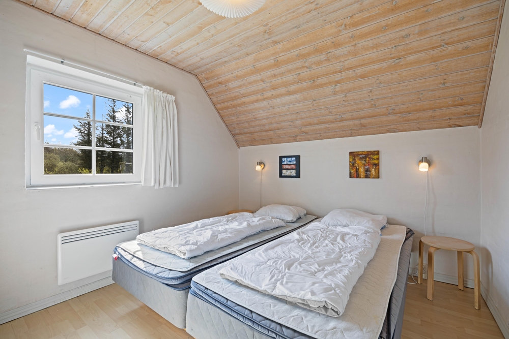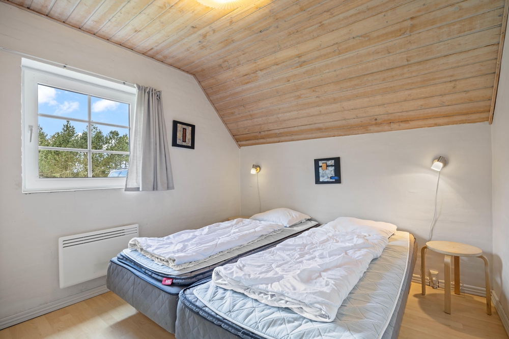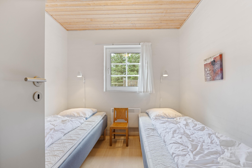 Der er 6 lyse soverum, fordelt i 2 afdelinger. I hver afdeling er der 3 soveværelser og et badeværelse. Så der er mulighed for at indlogere sig efter alder og behov, evt. til flere generationer, som er afsted sammen. Der er også både en barneseng og højstol i feriehuset.