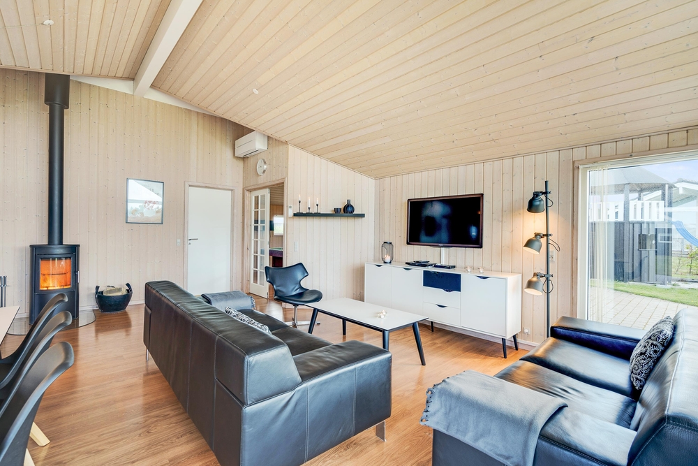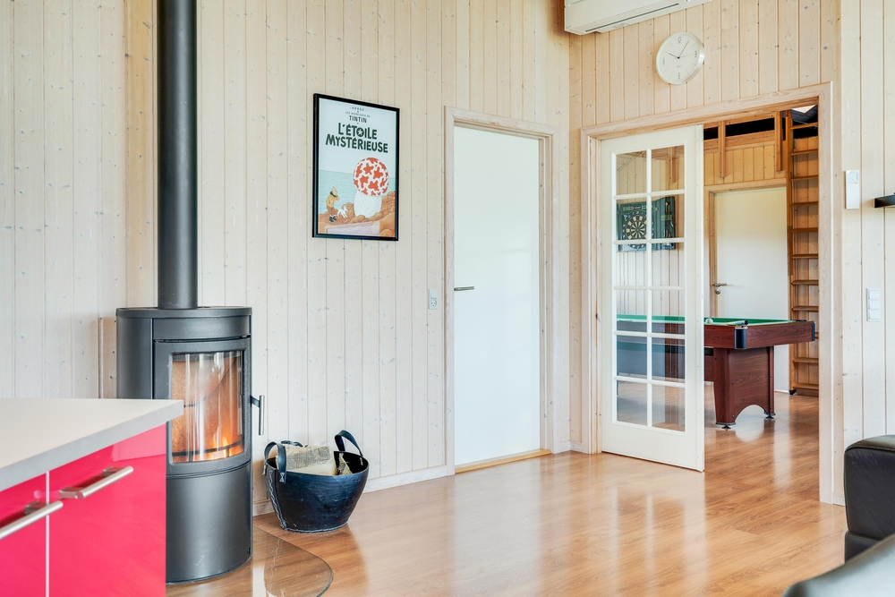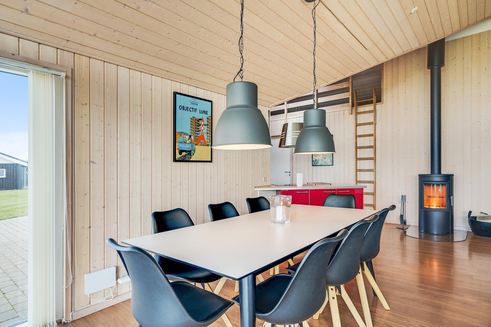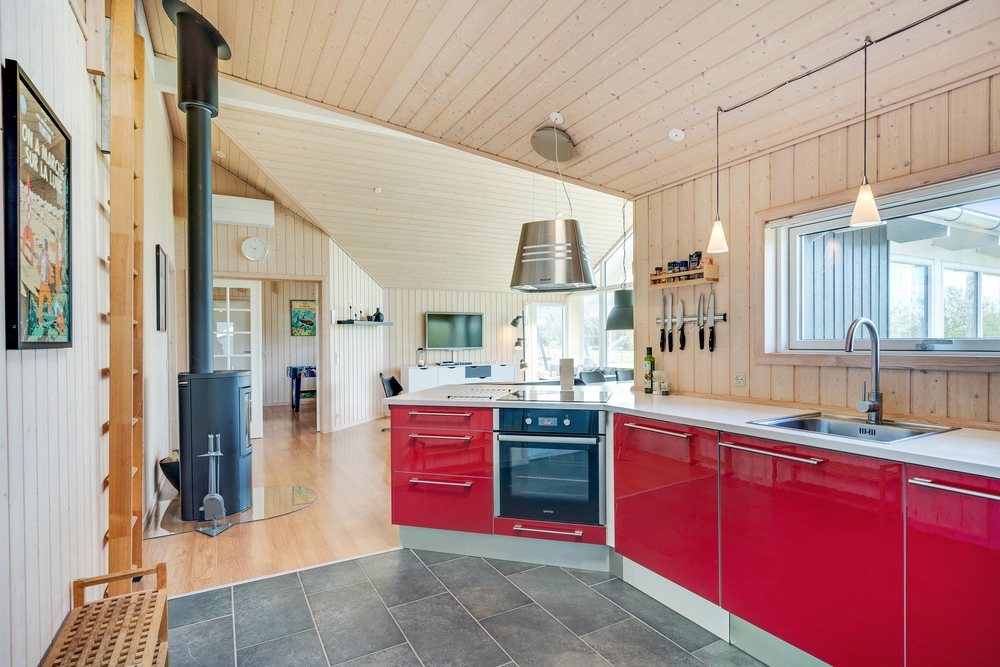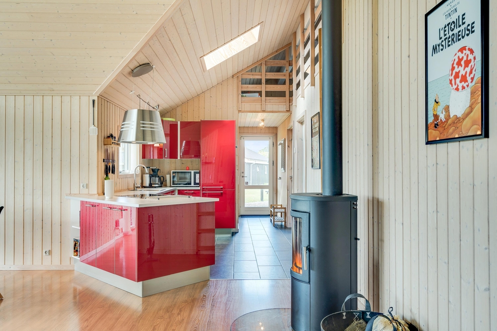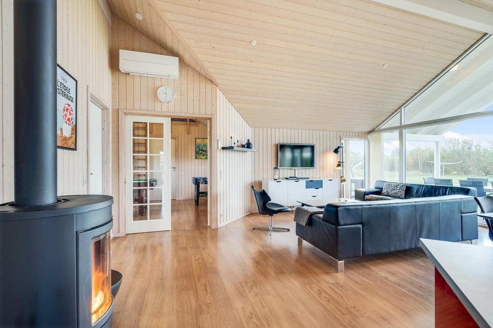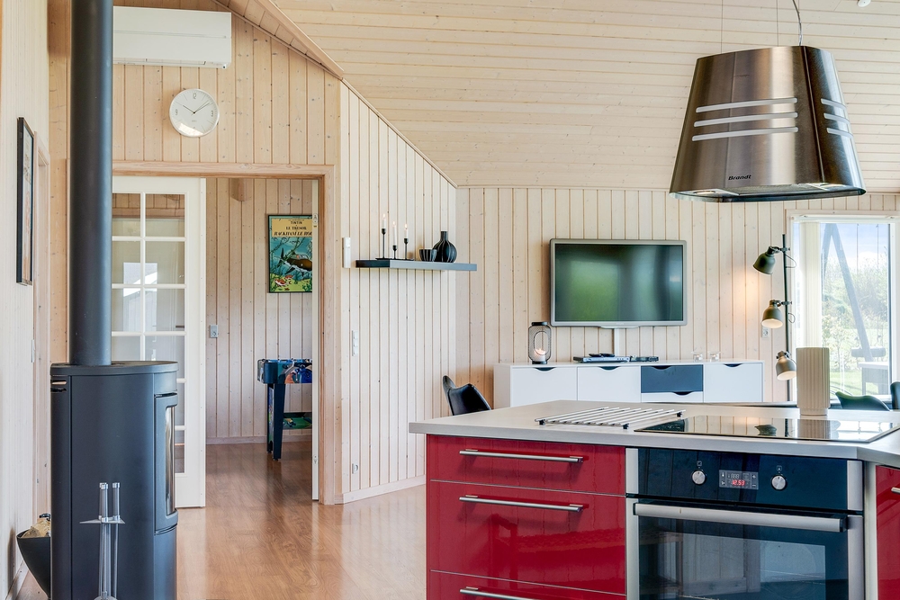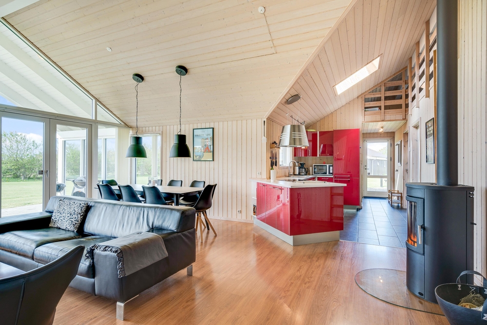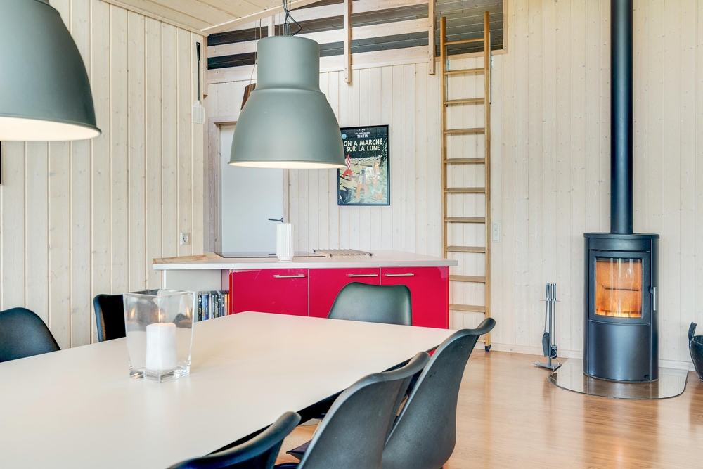 Når I træder indenfor i sommerhuset, vil I straks bemærke den lyse indretning og de store vinduer, der lukker masser af naturligt lys ind. Det åbne køkkenalrum gør det nemt at holde samtalen kørende mellem køkkenet og de bløde møbler i stuen. Her kan I også lune jer ved den hyggelige brændeovn, der skaber den helt rigtige sommerhusatmosfære.