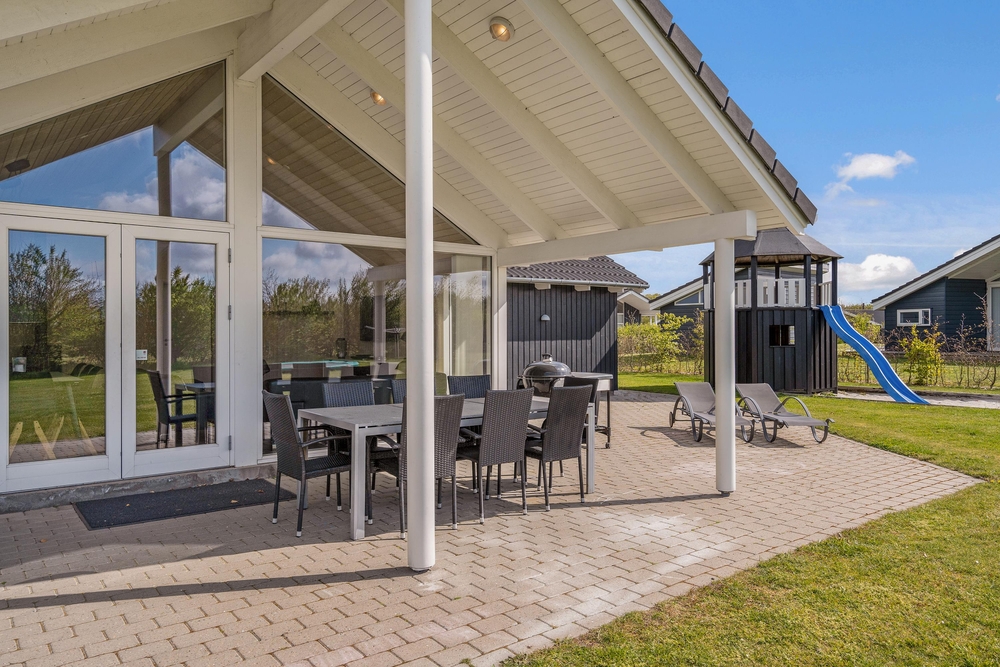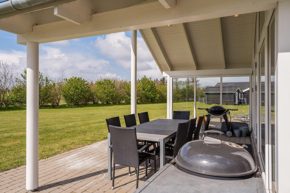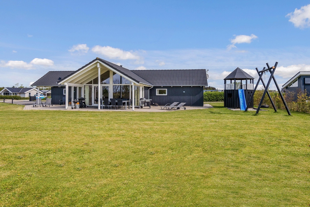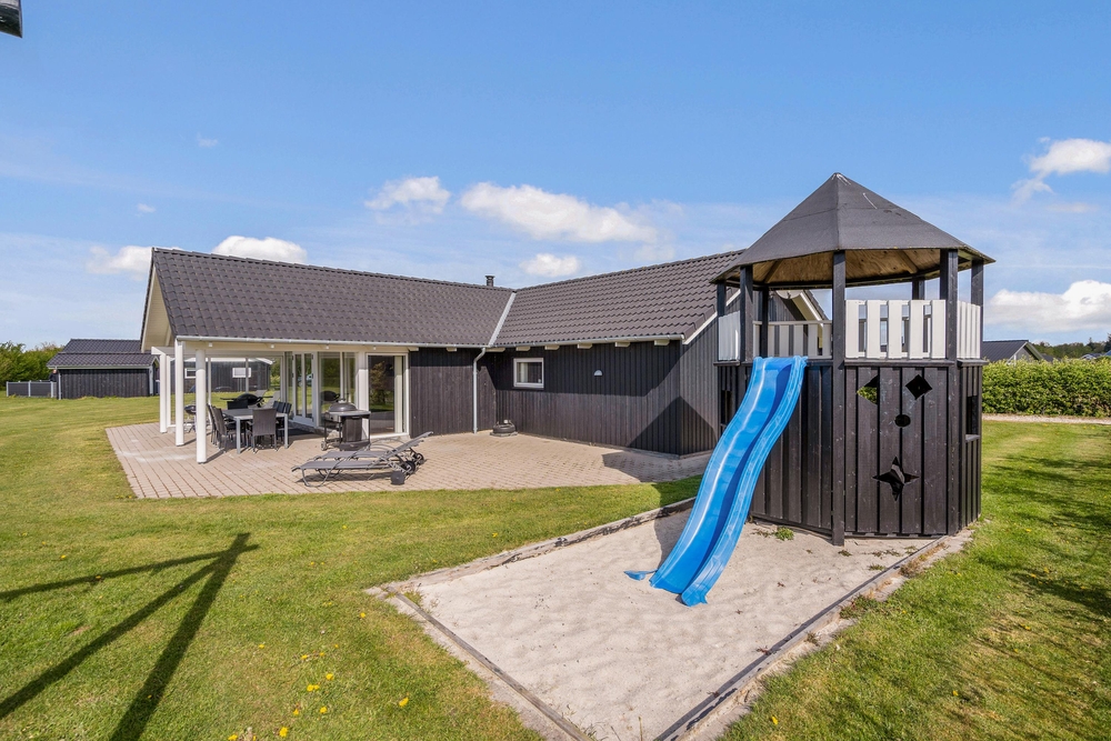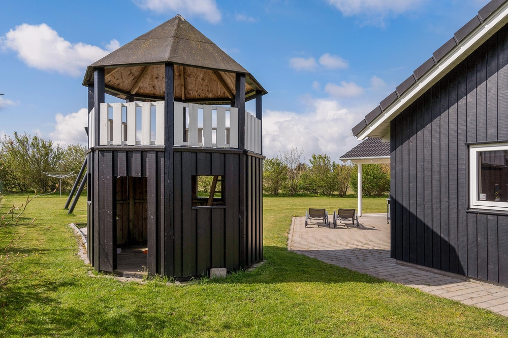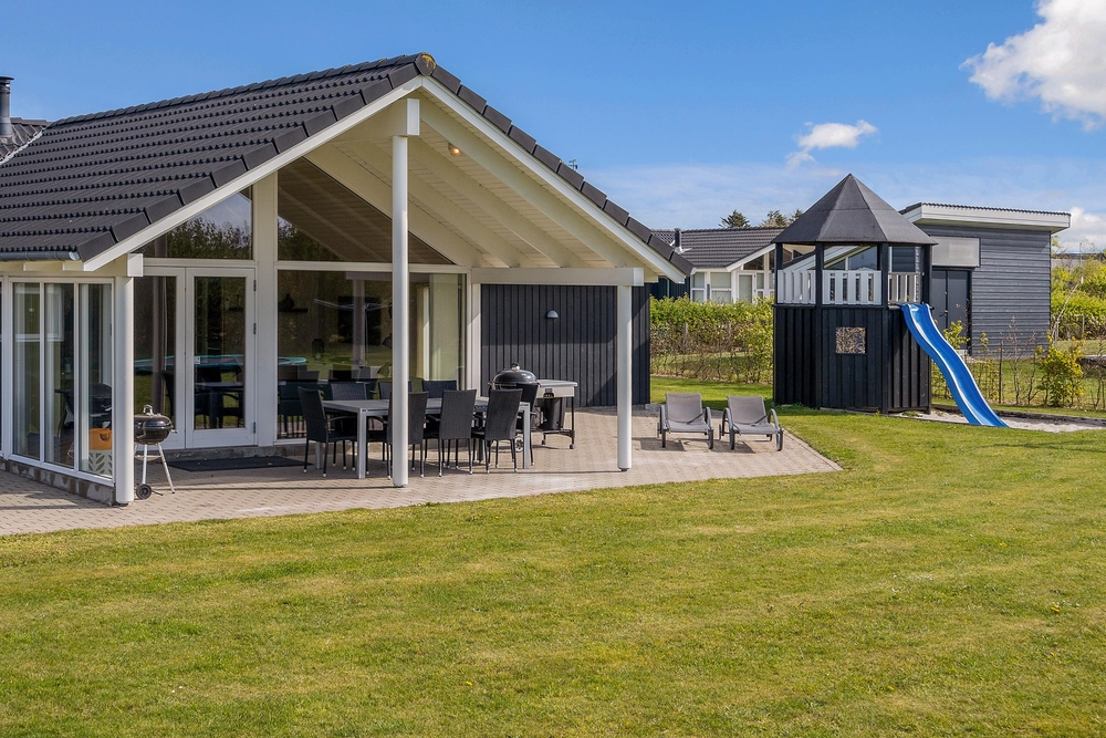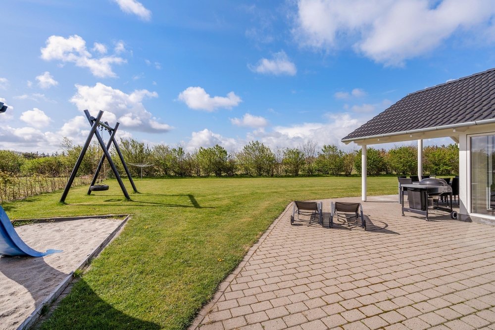 Fra stuen træder I ud på den overdækkede terrasse, hvor I kan nyde morgenkaffen i rolige omgivelser. Terrassen er stor og indbydende med komfortable møbler, der sikrer masser af afslapning og hyggelige grillmåltider. Mens de voksne nyder solen i solvognene med en spændende krimi, kan børnene more sig på gyngerne, på trampolinen eller slippe fantasien fri i legetårnet.