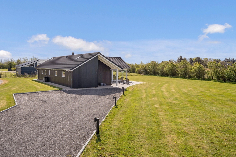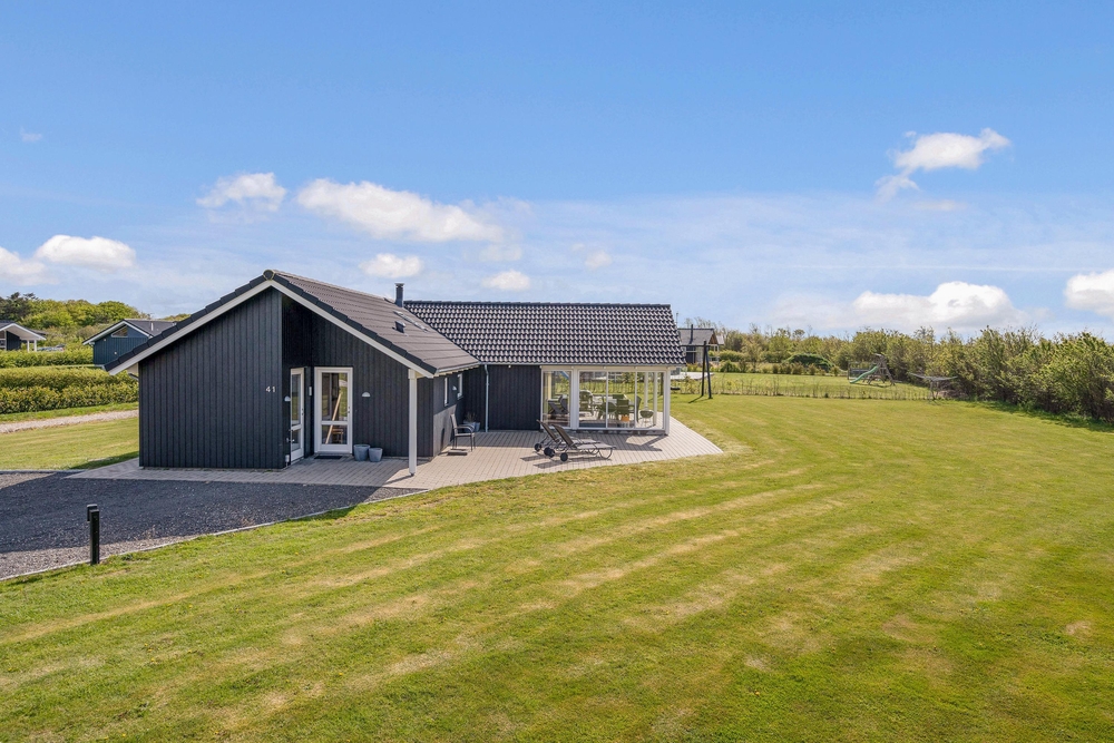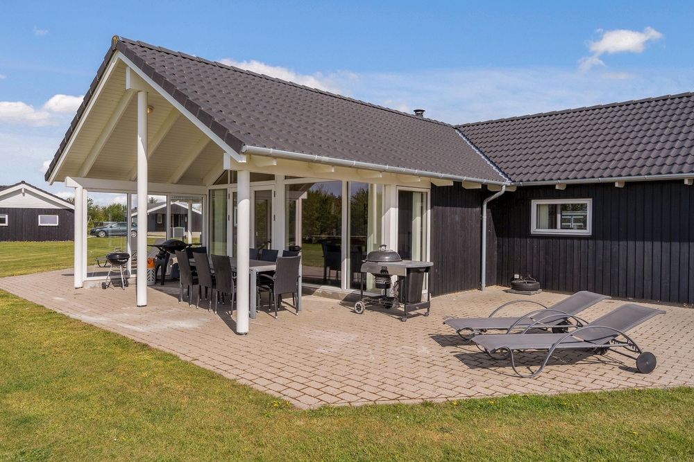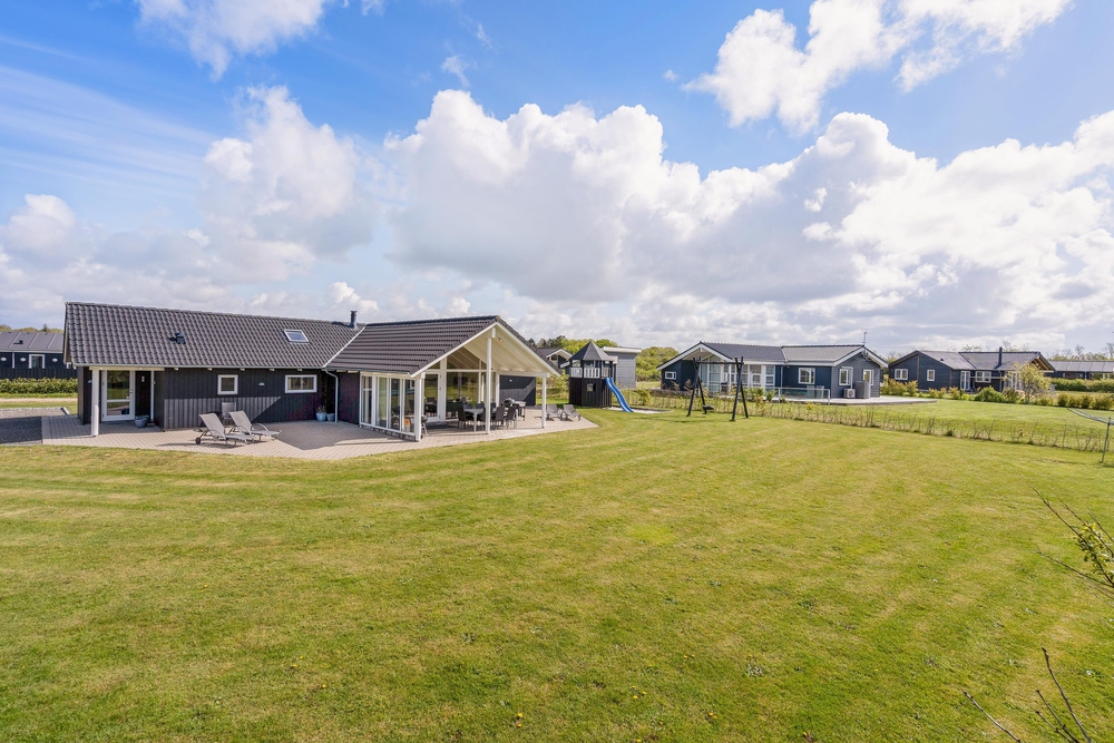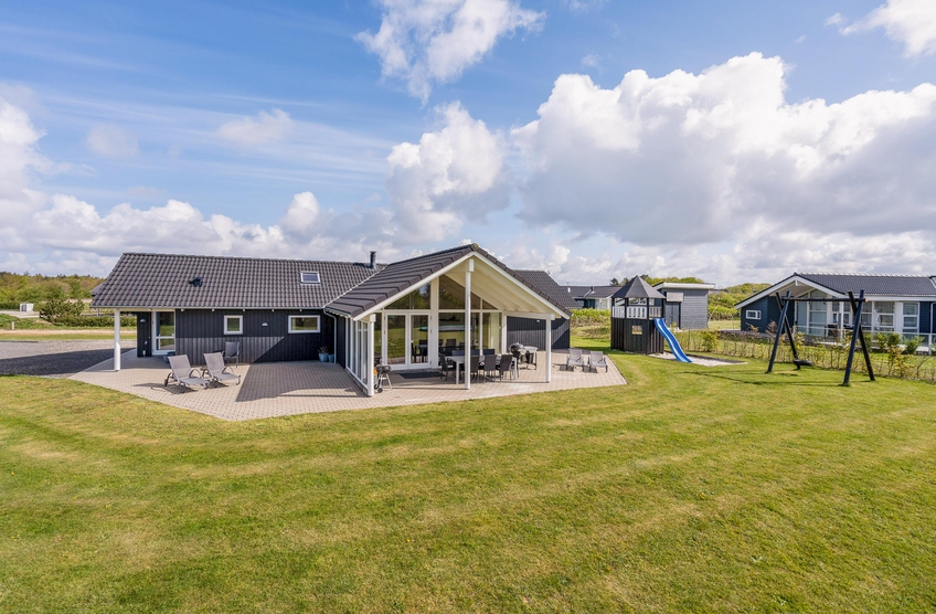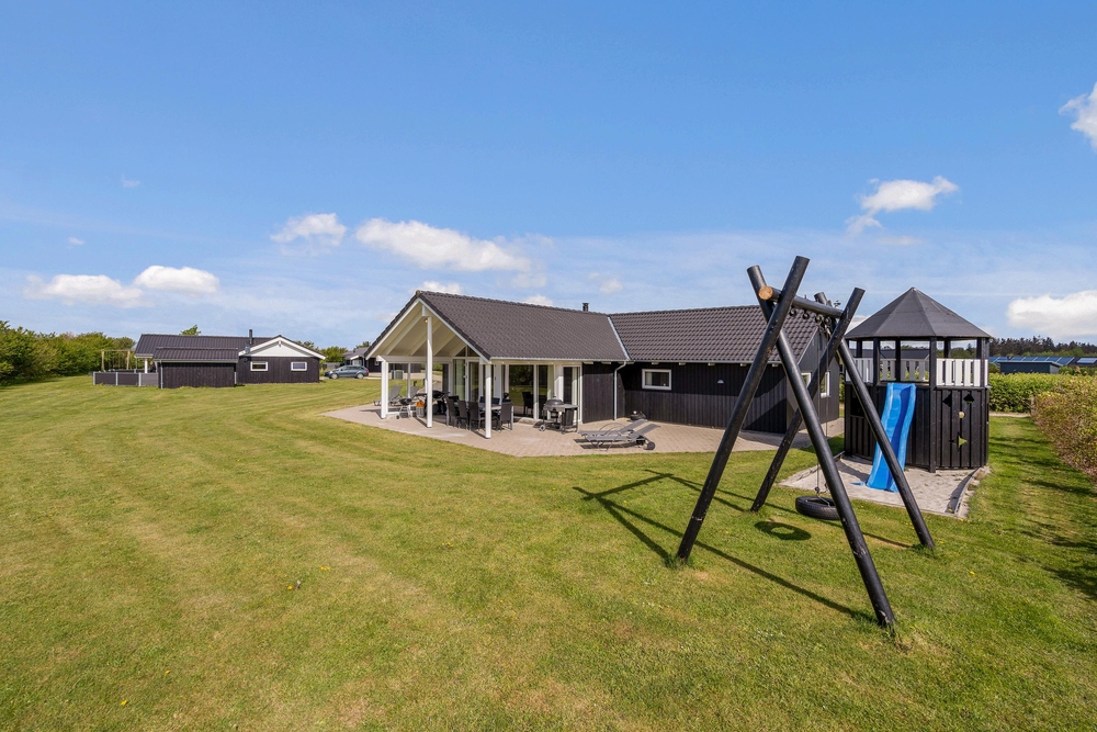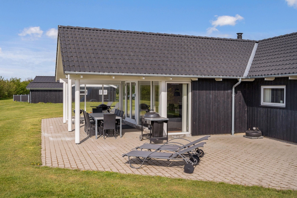Fra stuen træder I ud på den overdækkede terrasse, hvor I kan nyde morgenkaffen i rolige omgivelser. Terrassen er stor og indbydende med komfortable møbler, der sikrer masser af afslapning og hyggelige grillmåltider. Mens de voksne nyder solen i solvognene med en spændende krimi, kan børnene more sig på gyngerne, på trampolinen eller slippe fantasien fri i legetårnet.