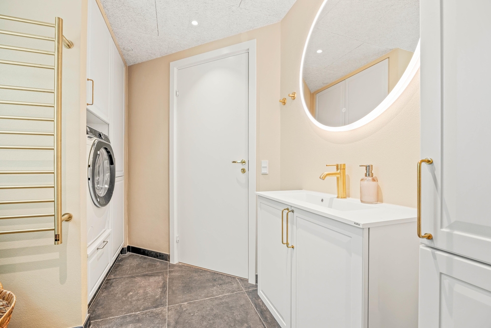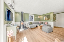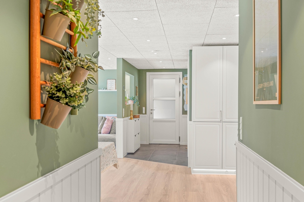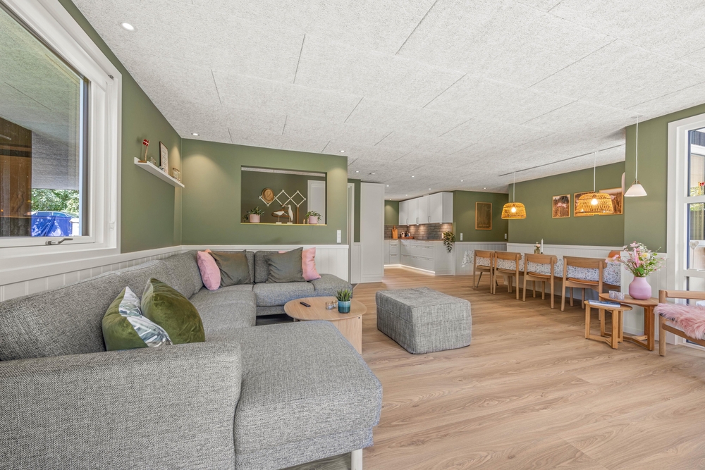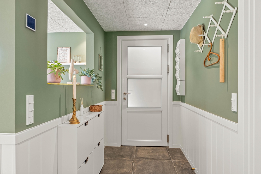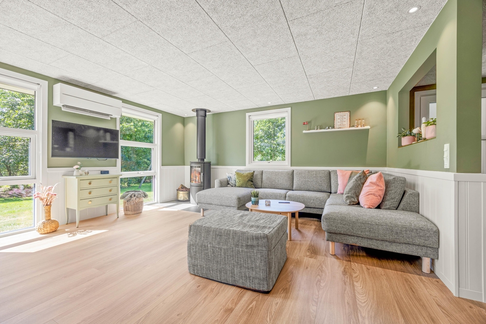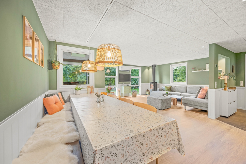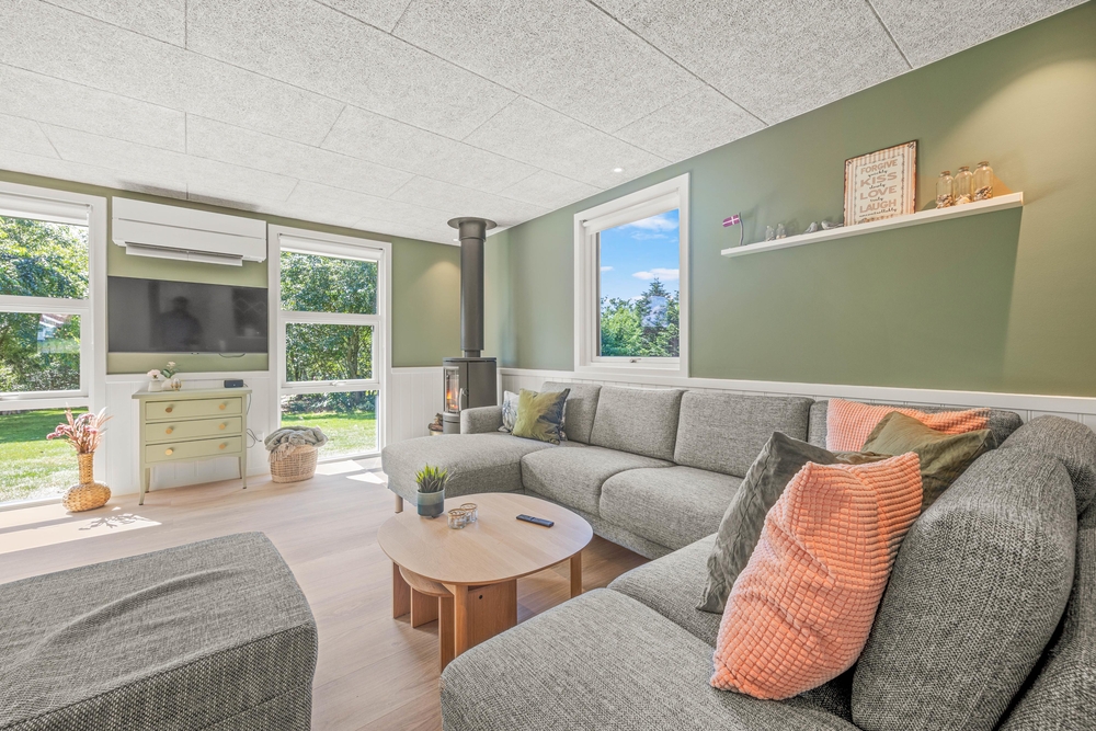 Indenfor vil I opleve en hjemlig og indbydende atmosfære, hvor alt er indrettet til at sikre jeres komfort. Det veludstyrede køkken har alle nødvendigheder, herunder en opvaskemaskine samt en kombineret vaskemaskine og tørretumbler, der gør dagligdagen lettere. Den energibesparende luft til luft varmepumpen sørger for at holde en stabil og behagelig temperatur hele året rundt. I den hyggelige stue kan I finde ro og afslapning foran brændeovnen eller underholdning med Chromecast, perfekte rammer for hyggelige aftener.
