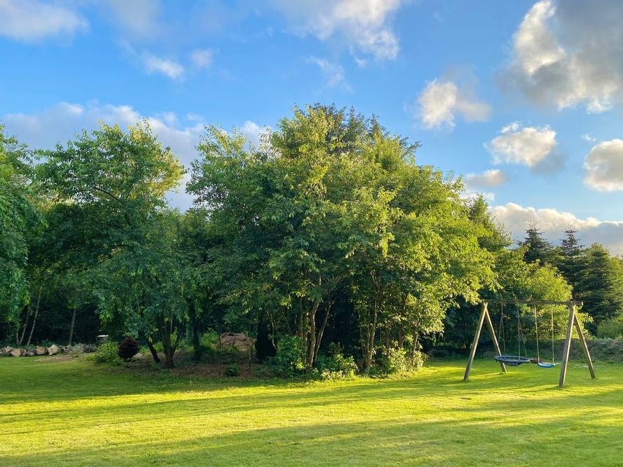 Den rummelige 1953m2 grund omkring sommerhuset byder på en dejlig plæne med gynge til børnene samt både en åben og en overdækket terrasse med havemøbler. De varierede terrasseområder er ideelle til grillmiddage, solbadning eller bare afslapning med en god bog.