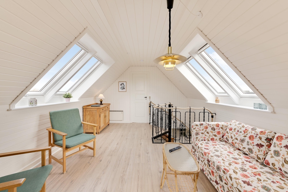 I stueetagen ligger det ene af de to soveværelser og her har I den hyggelige fjernsynsstue med brændeovnen. Men skal der rigtigt slappes af på en tidlig forårsdag eller en regnfuld efterårsdag, så er 1. salen det perfekte sted. Her kan I trække jer tilbage med en bog eller strikketøjet ? eller bare sidde med en kop te, drømme lidt, hyggesnakke og nyde lysindfaldet og udsigten.