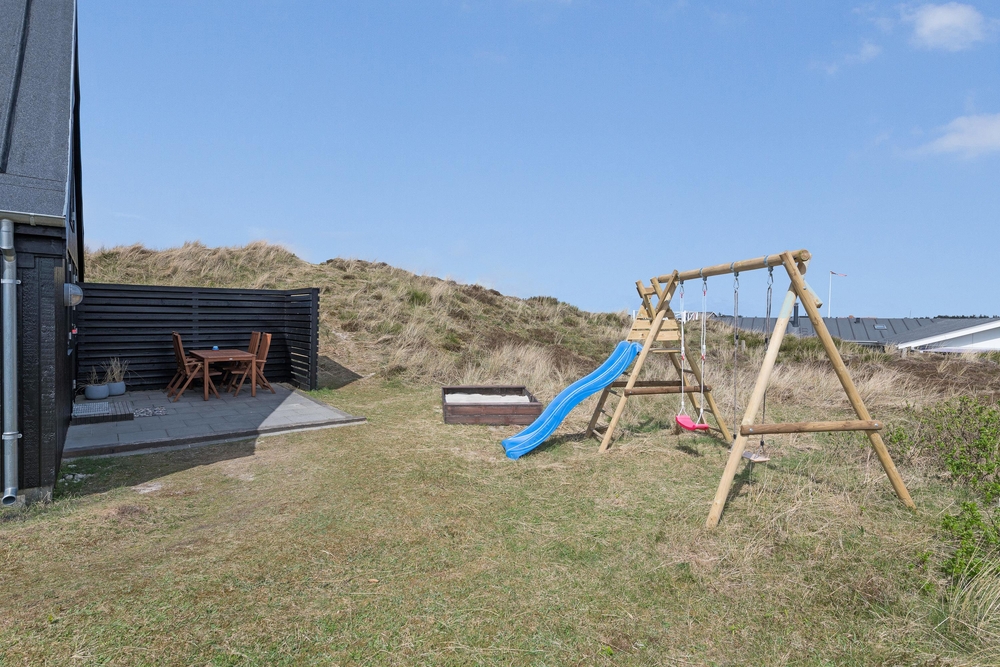 Blæst og rusk er intet problem på Ternevej 12, på grund af den store lukket og delvist overdækket terrasse.For børnene er der både sandkasse og gyngestativ, så de heller ikke keder sig når mor og far ligger og hviler på liggestolene.