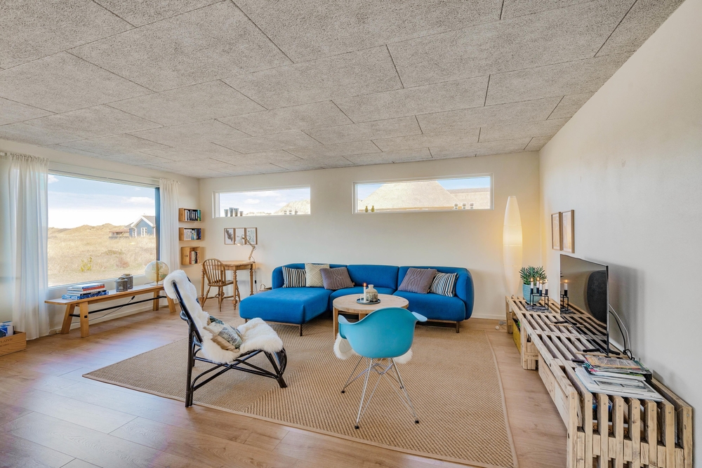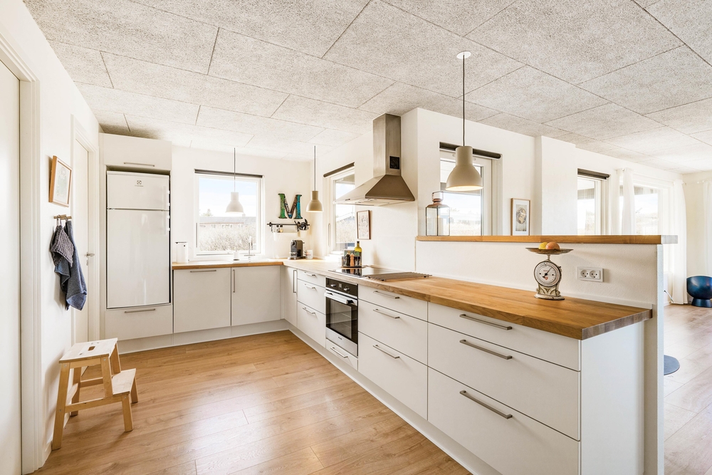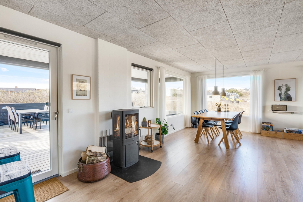 Så snart I træder indenfor, bliver I mødt af den flotte og moderne indretning, hvor der er blevet kræset for detaljerne. De store vinduespartier giver et skønt lysindfald, og idet køkken og stue er i åben forlængelse, skabes der rummelighed med plads til alle. I stuen kan familien samles til en god film eller serie, som kan streames via sommerhusets Chromecast. Og hvis I vil skrue ekstra op for feriehyggen, kan I tænde op i brændeovnen, hvor dens knitrende lyde kan høres i baggrunden.