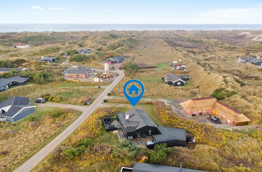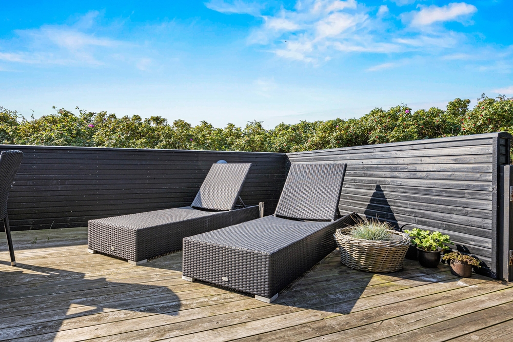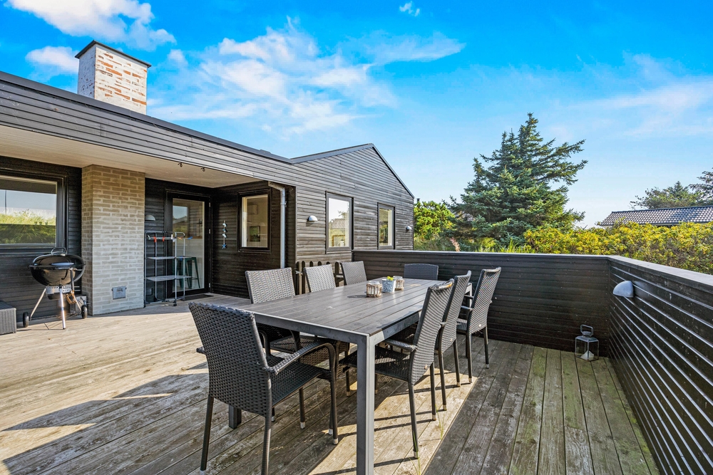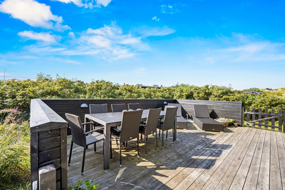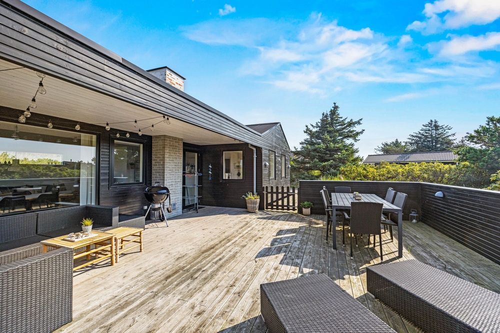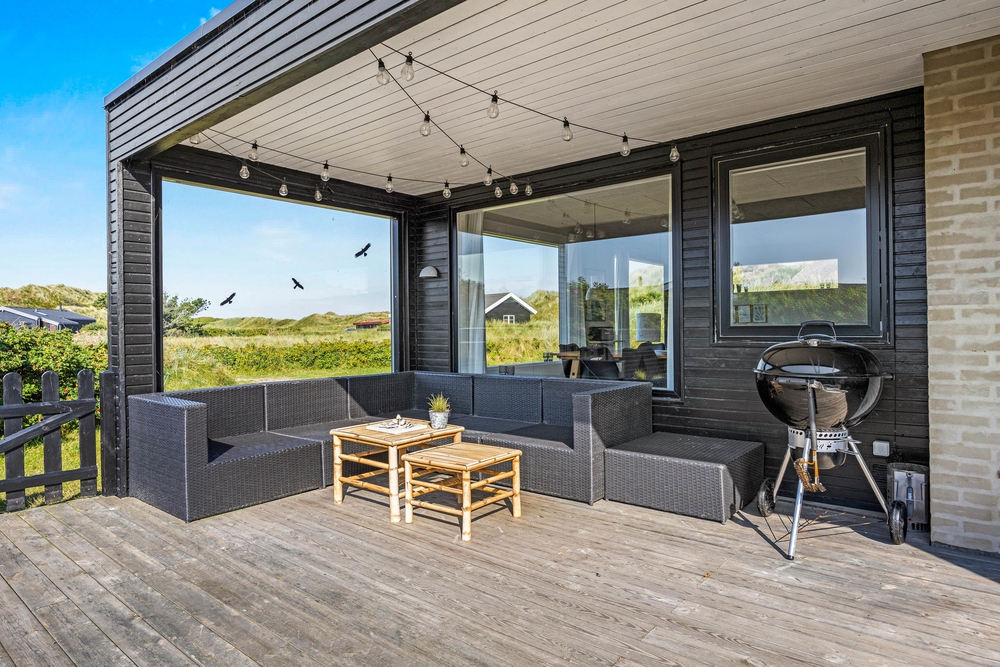 Dette skønne sommerhus befinder sig blot 600 meter fra stranden. Det kræver derfor kun en meget kort gåtur, og så kan I allerede hoppe i bølgen blå. På terrassen kan I hive liggestolene frem og nyde solen eller tænde op i grillen. Terrassen er også afskærmet og lukket, så I kan både sidde i skygge og læ. Og hvis I ønsker det, kan jeres bil stå i læ under carporten.
