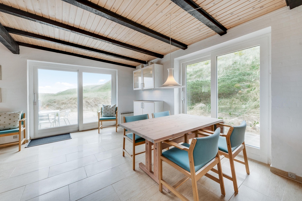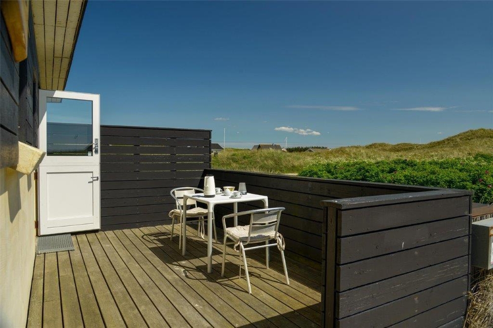 Rundt om sommerhuset finder I to skønne terrasser; en østvendt, så I kan nyde morgenkaffen udenfor, og en vestvendt, så I kan følge solen hele dagen. Begge terrasser er afskærmede og udstyret med havemøbler. Udsigten til klitlandskabet er helt fantastisk, og beliggenheden er dejlig ugeneret.