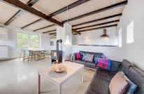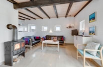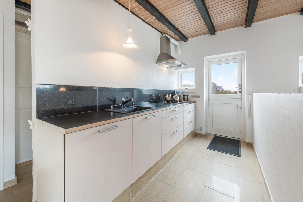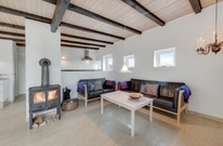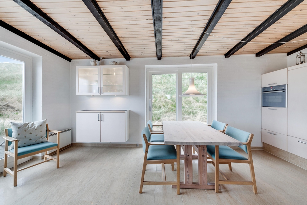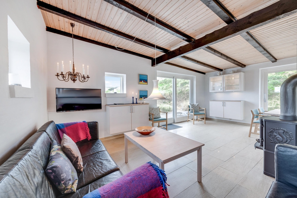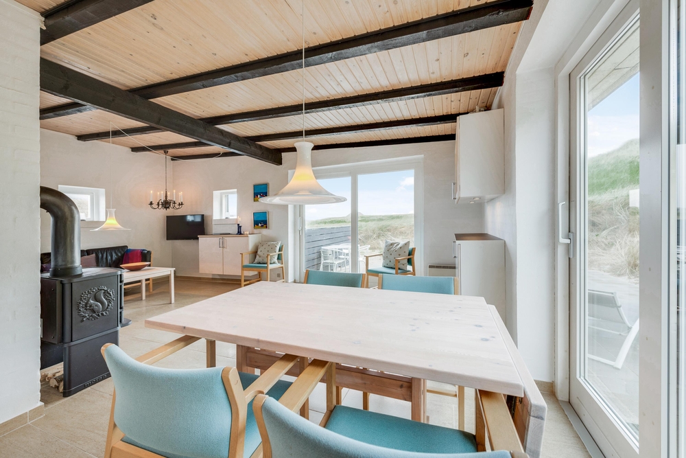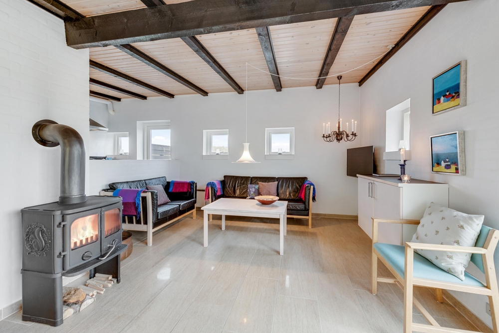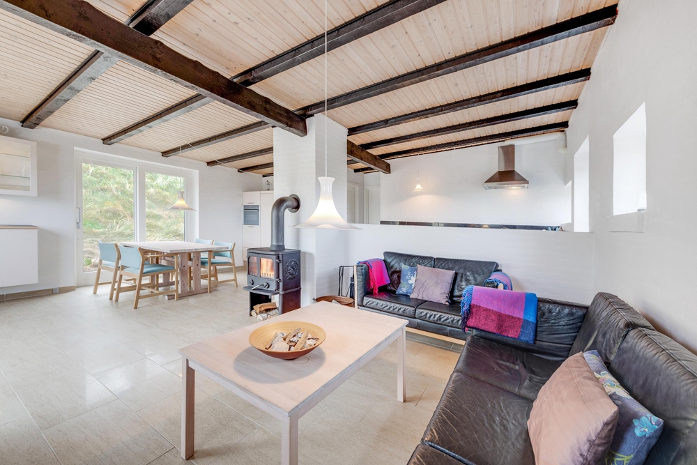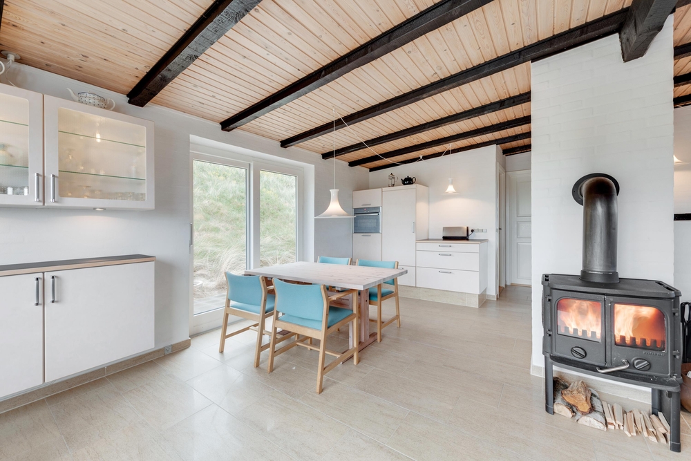 Sommerhusets hjerte er opholdsrummet med stue, spiseafdeling og køkken, der blandt andet er udstyret med opvaskemaskine, integreret emhætte i kogepladen og integreret airfryer i ovnen. Brændeovnen spreder en hyggelig feriestemning og varme på de blæsende og regnfulde dage.