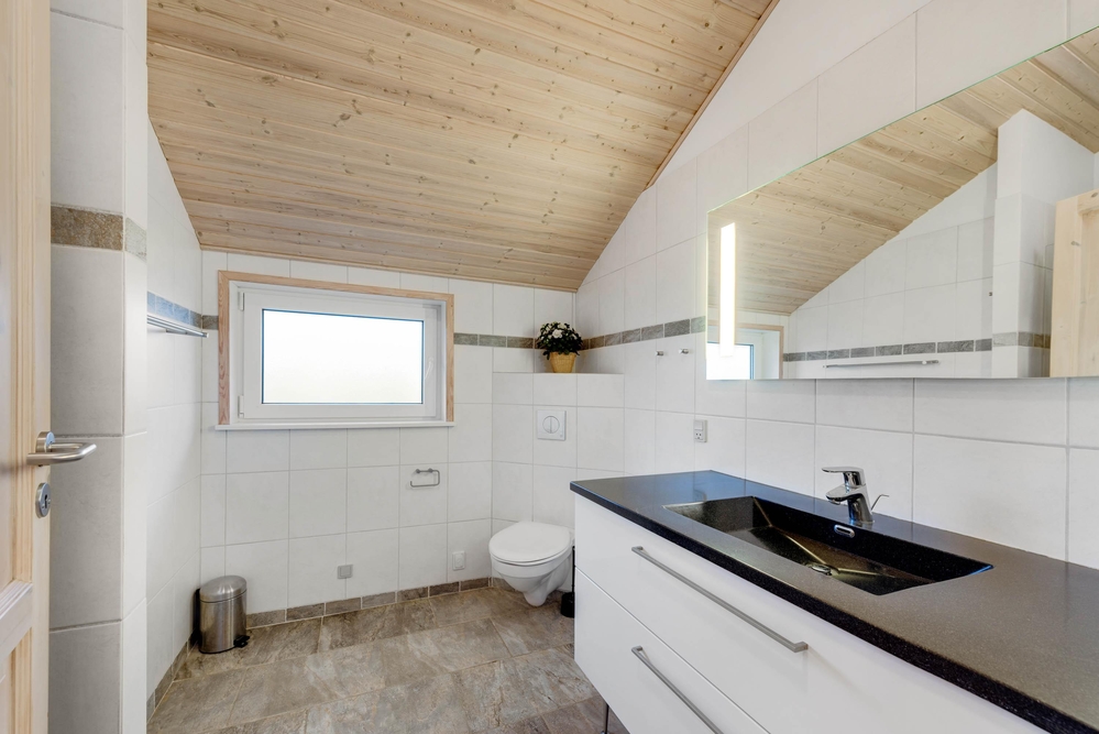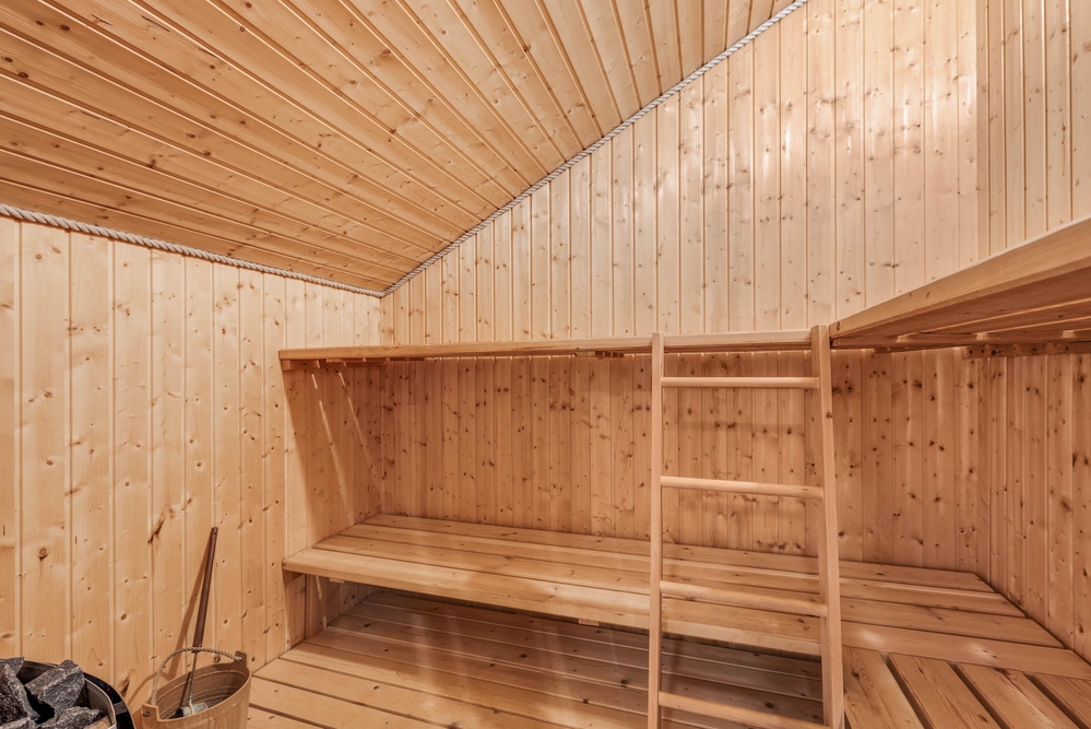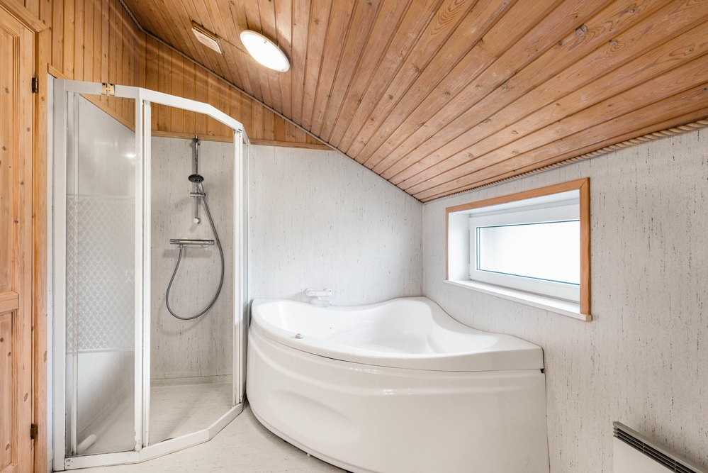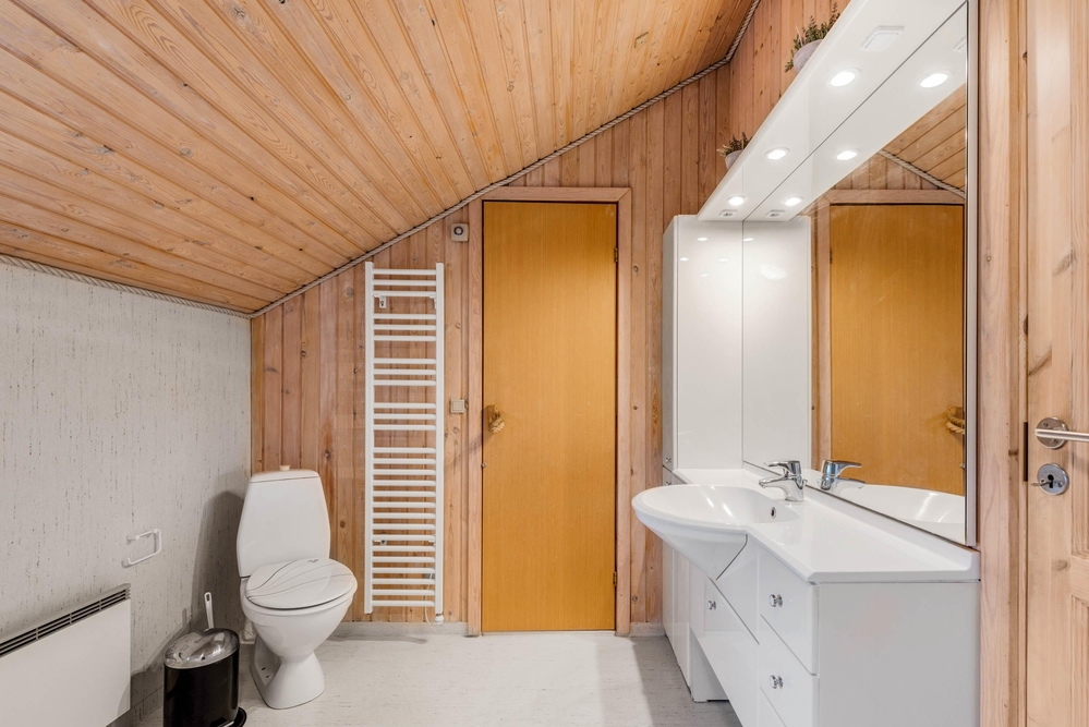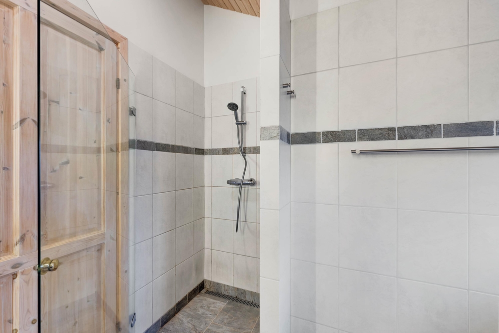 På det ene badeværelse er der lagt op til afslapning og velvære. Efter en spændende og oplevelsesrig dag i naturen kan I nyde varmen i saunaen eller det boblende spabad.