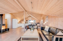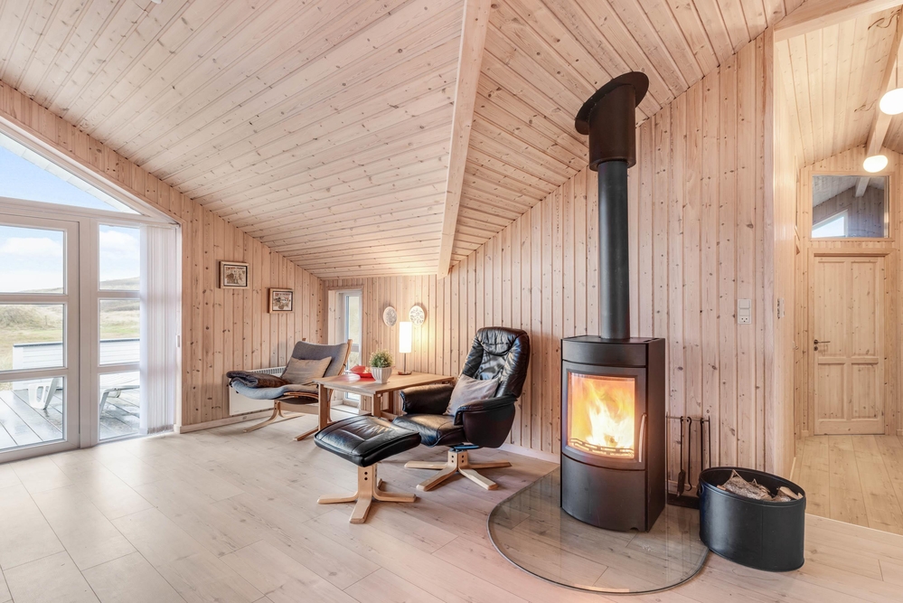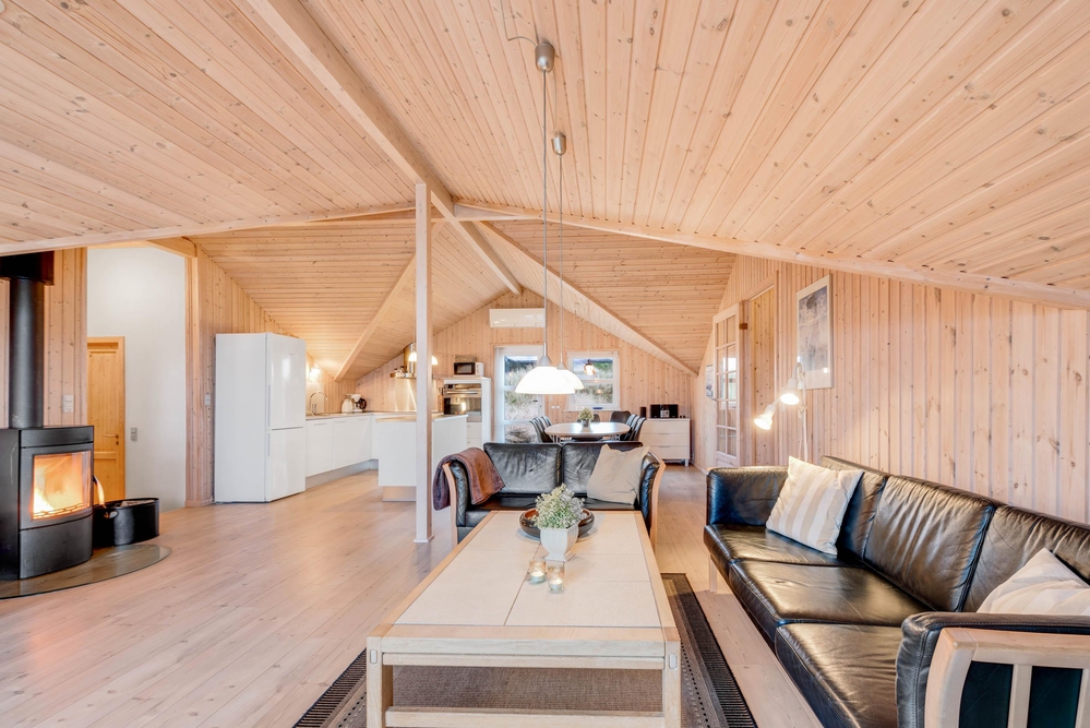 Samlingspunktet i sommerhuset er opholdsrummet, som ligger i åben forbindelse med det veludstyrede køkken. Stuen indbyder til mange hyggelige stunder i familiens selskab, mens brændeovnen sørger for varme på en blæsende efterårsdag. I kan desuden også benytte jer af varmepumpen, som hjælper med at holde temperaturen i rummet behagelig.