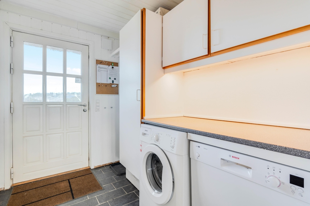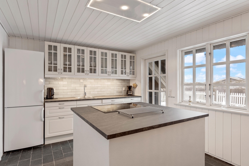 Køkkenalrummet byder på et funktionelt køkken med køkken-ø og med alt det nødvendige til at lave et lækkert måltid. Her kan i lave forskellige aktiviteter både sammen og hver for sig. Sæt dig foran tv-et og se en god film, eller læs en spændende bog foran den knitrende brændeovn.