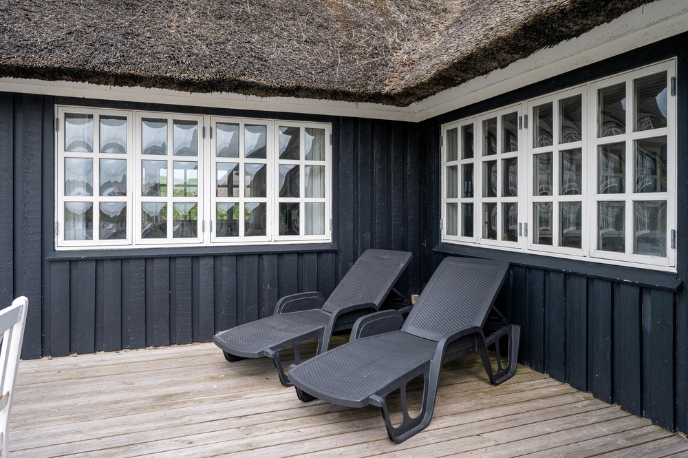 Sommerhuset er omringet af en stor lukket terrasse, hvor der både er området som er overdækket og afskærmet. Her har I altid mulighed for at finde en plet hvor i kan nyde solen i husets solvogne. Når I trænger til en pause fra solen, er der også en parasol hvor i kan søge i skygge.