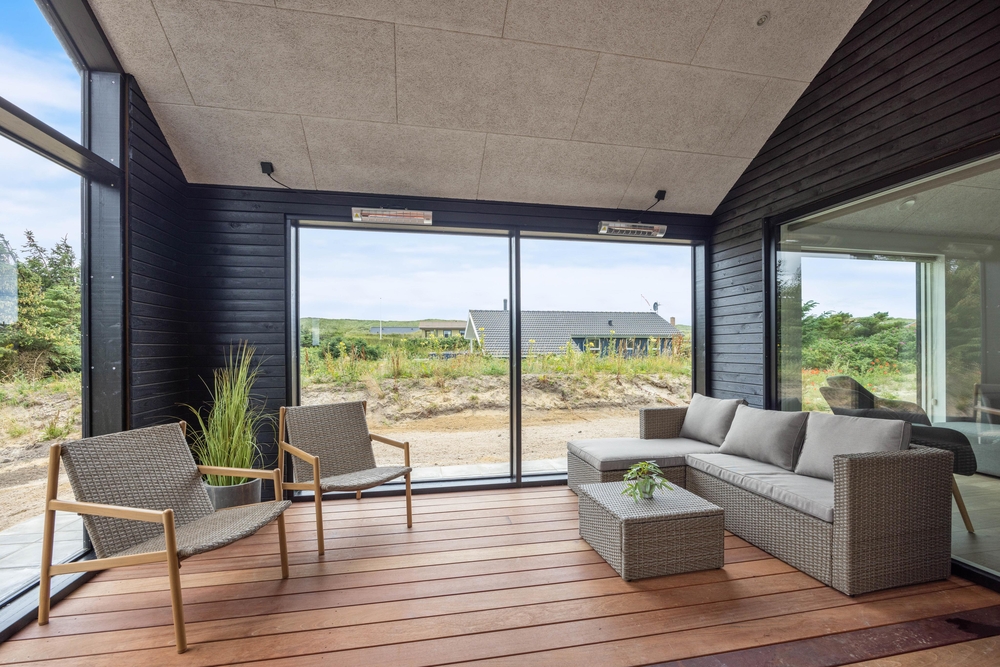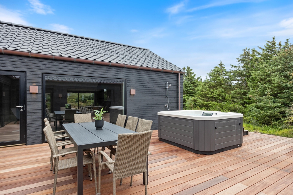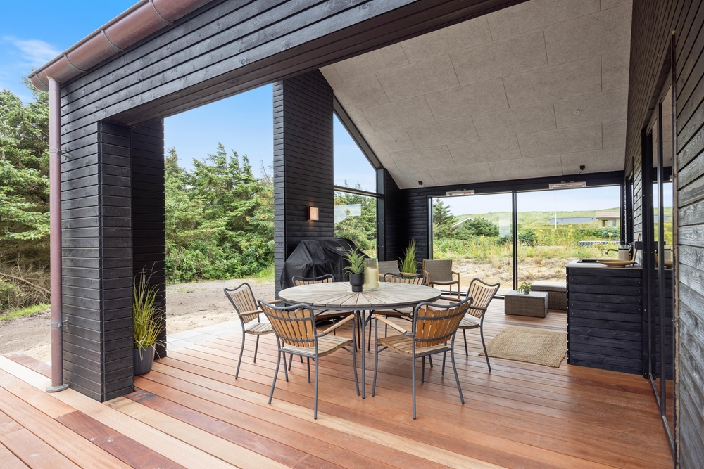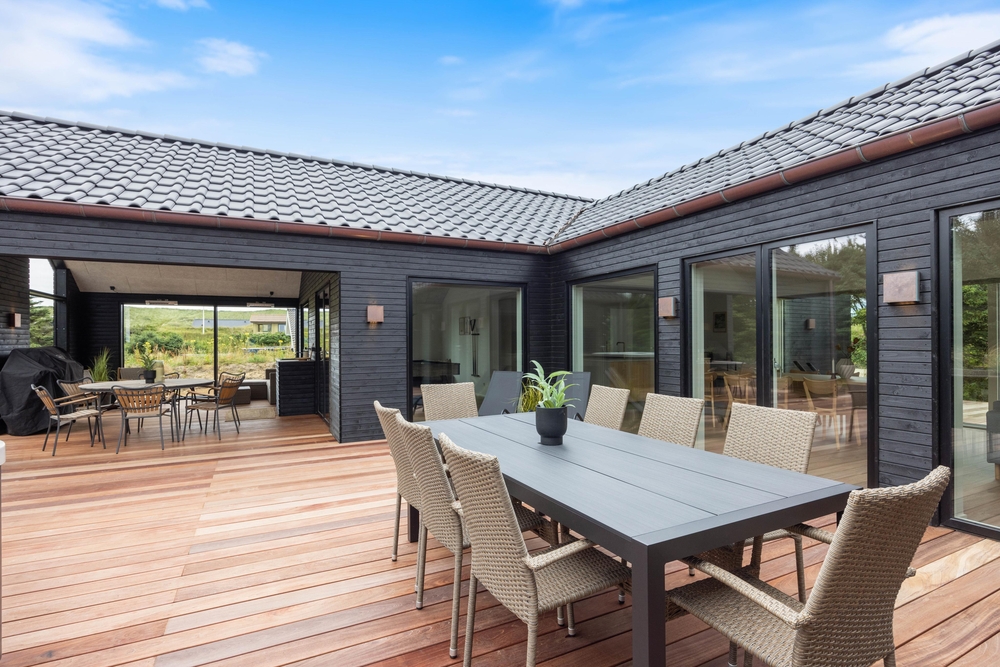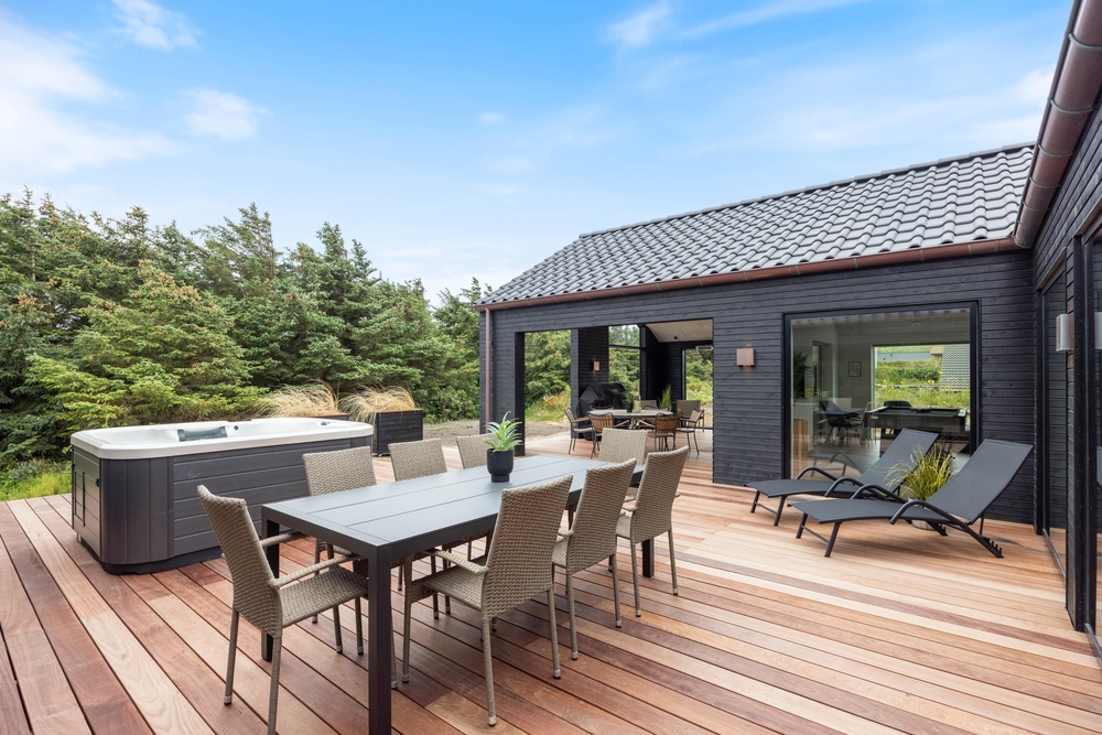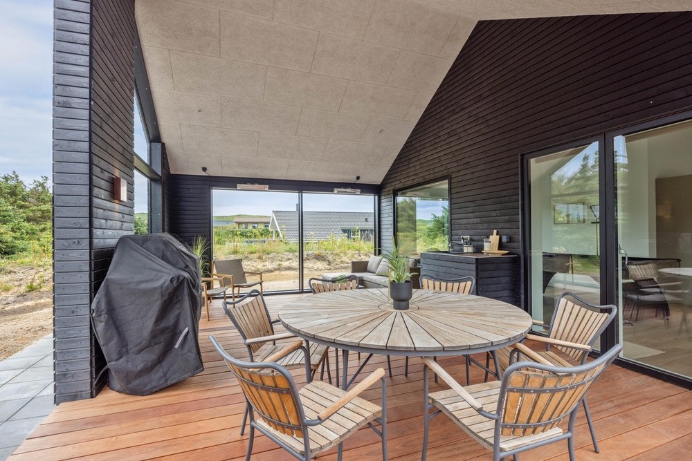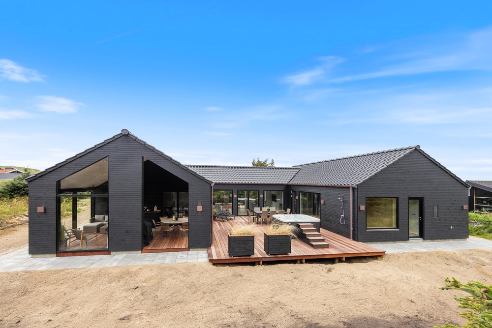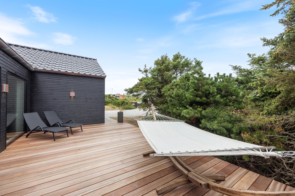 Dette moderne sommerhus er beliggende på en skøn naturgrund, som I kan nyde fra den store terrasse, der er delvist overdækket. Den store terrasse indbyder til mange hyggelige timer, da den blandt andet byder på en udespa, hvor I efter en lang dag kan komme helt ned i gear. Derudover finder I også en udendørs bruser, som I kan bruge fra april til november efter en dejlig tur ved Vesterhavet.