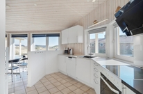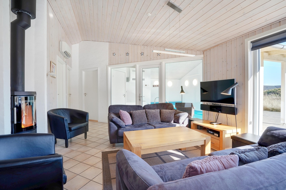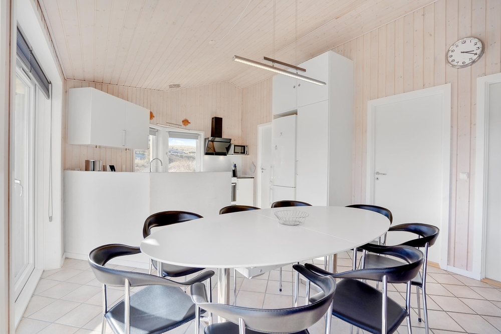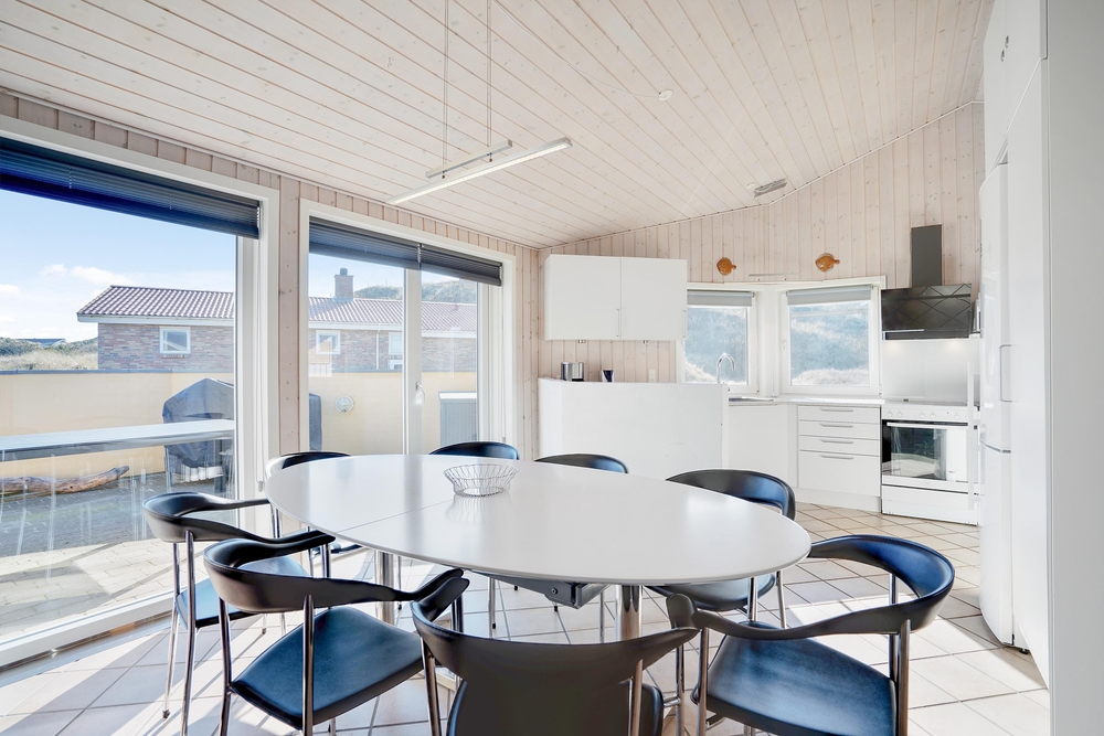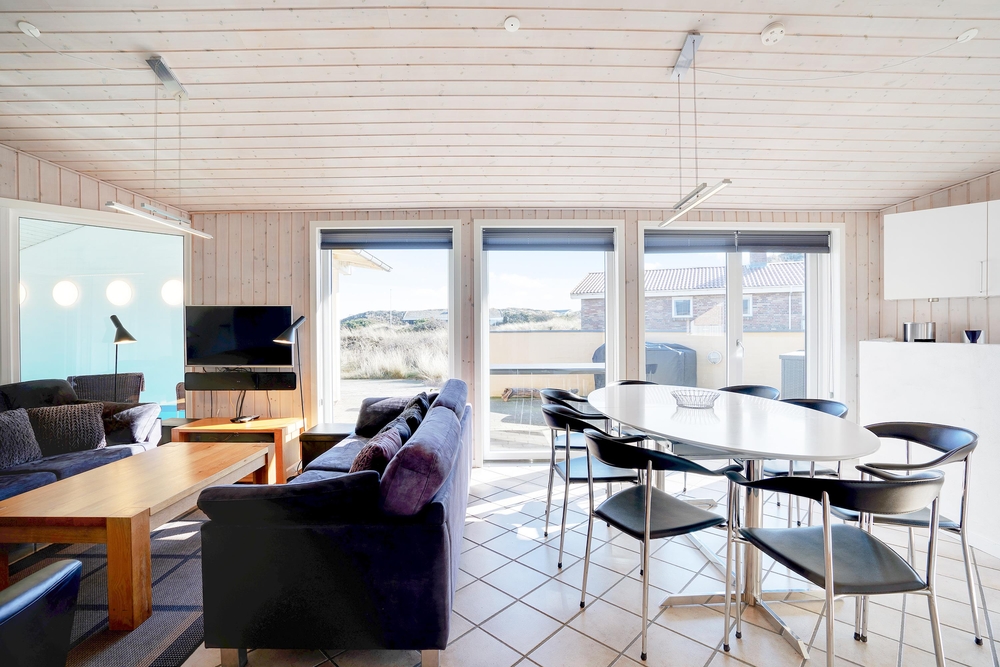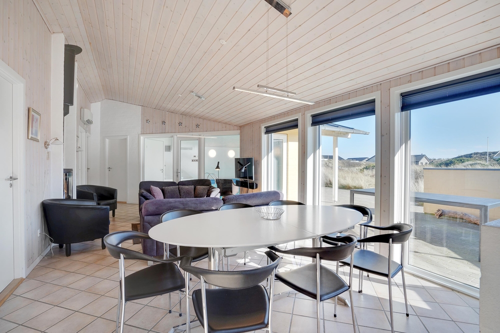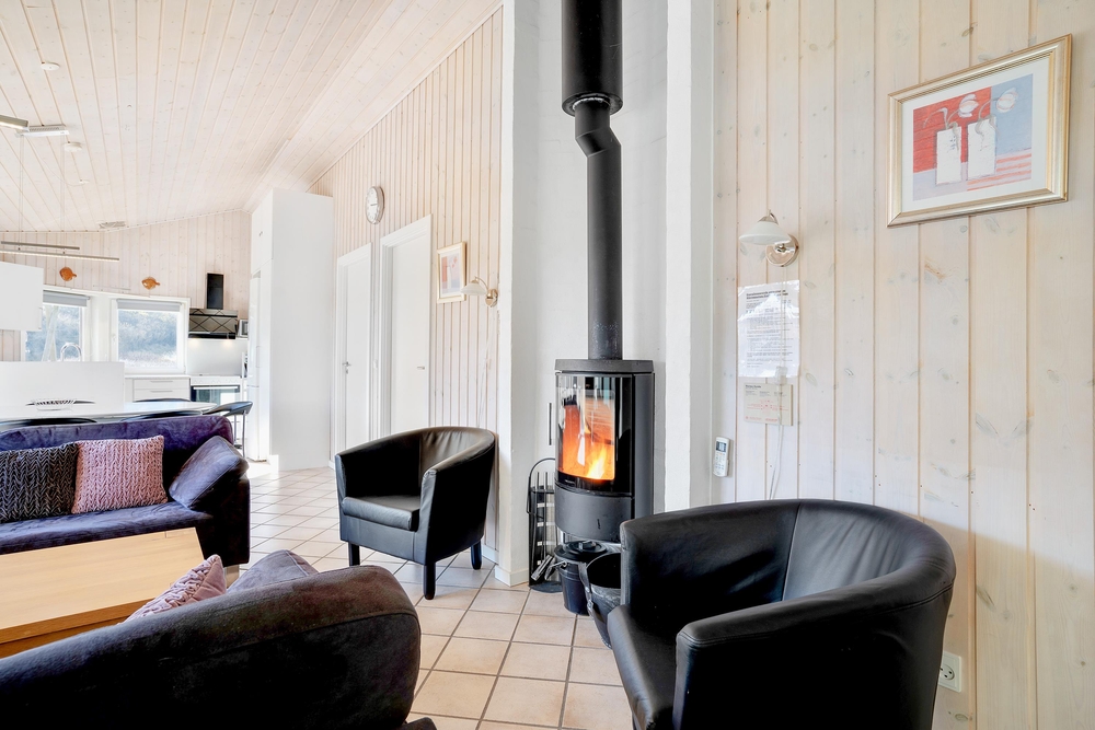Centrum i feriehuset er det store og lyse opholdsrum, hvor der er en praktisk og veludrustet køkkenafdeling i den ene ende, bl.a. med 100 l. fryser, mikroovn og opvaskemaskine. Spisepladsen er i midten af rummet, og stueafdelingen er i den anden ende af rummet. Man kan hygge sig med familiespil eller slappe af med en god bog i sofaen foran den knitrende ild i brændeovnen. Her kan man overalt være en del af fællesskabet.