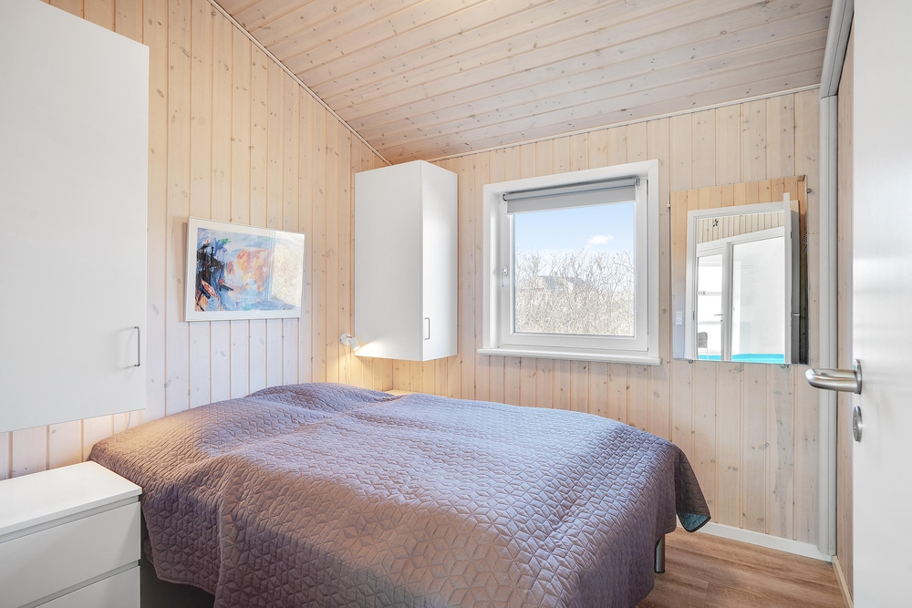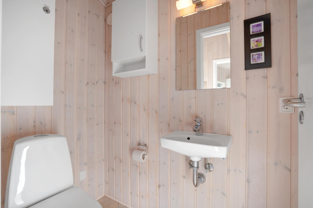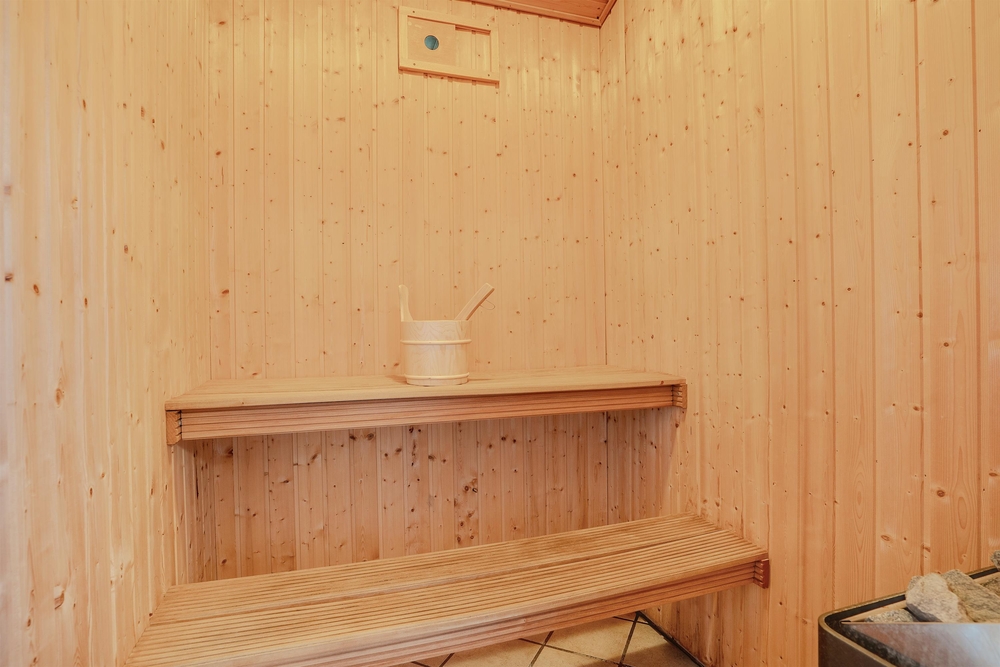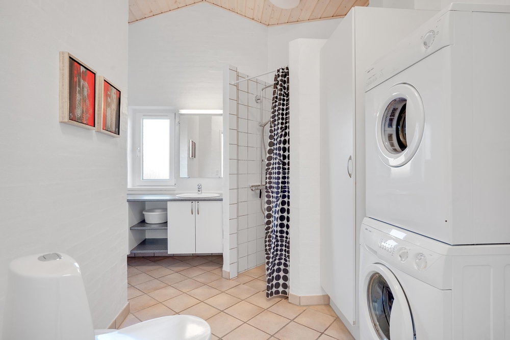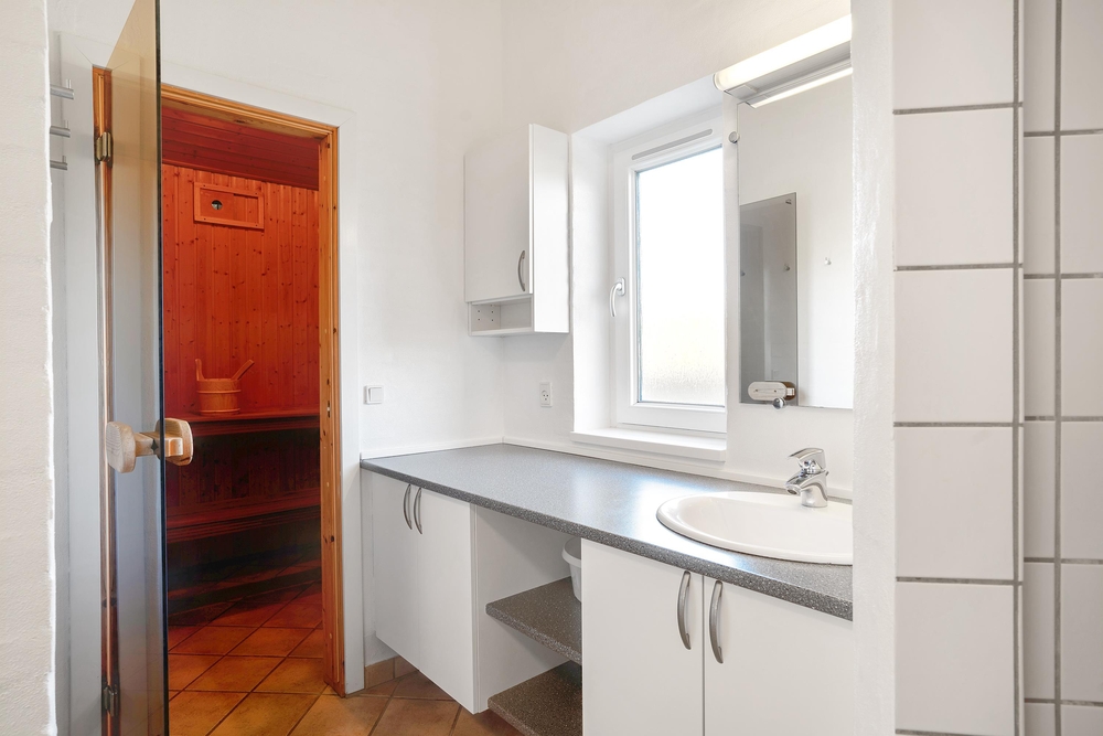 Saunaen finder I i forbindelse med det store badeværelse. Her kan man rigtig kan lade sig gennemvarme efter en spadseretur langs stranden. Det velindrettede badeværelse indeholder desuden vaskemaskine og tørretumbler, som måske især småbørnsfamilier vil sætte pris på.