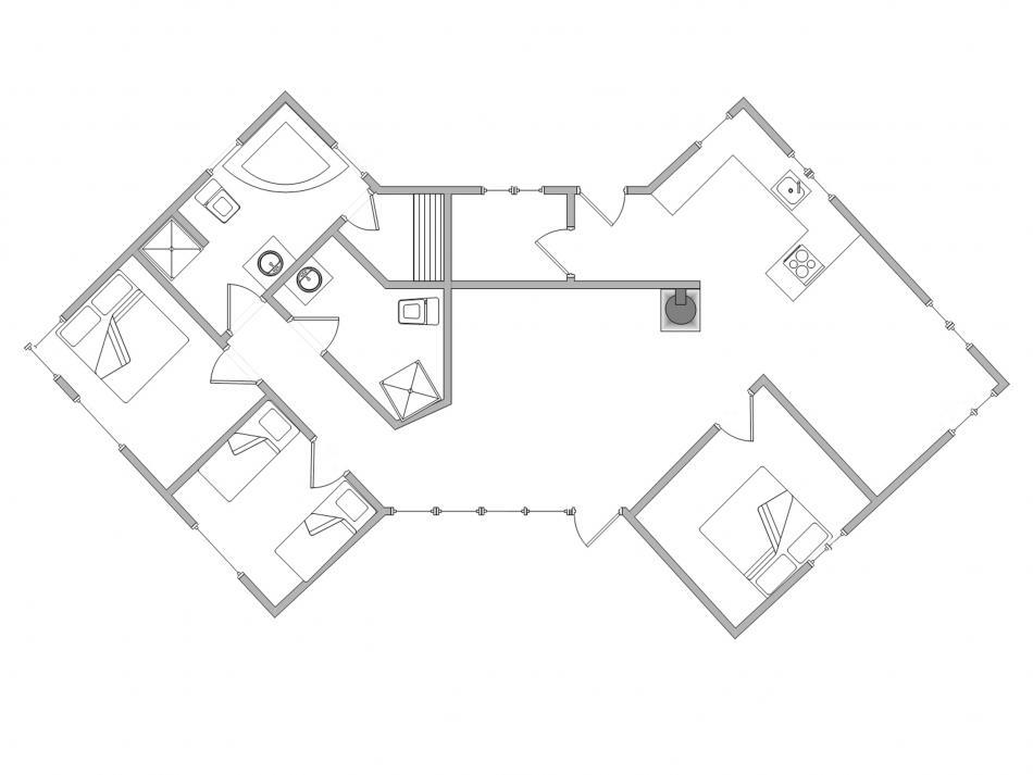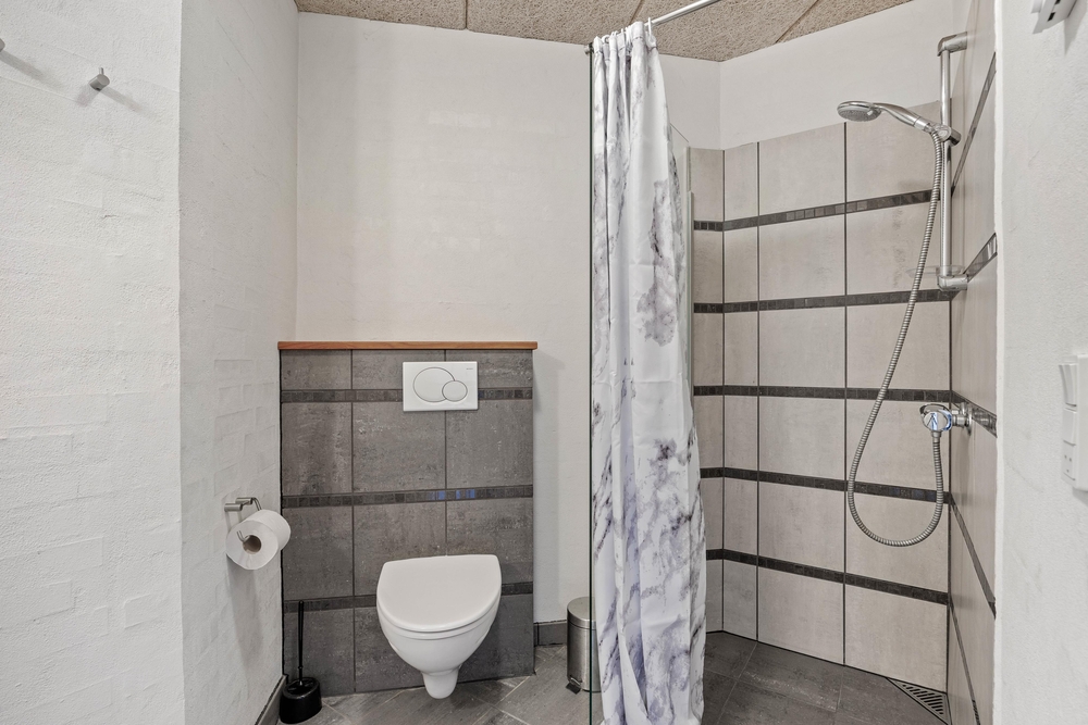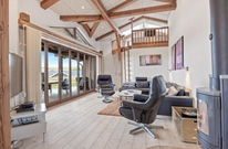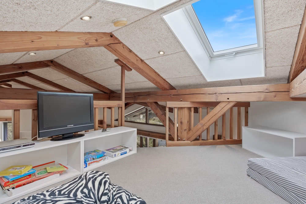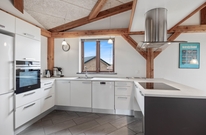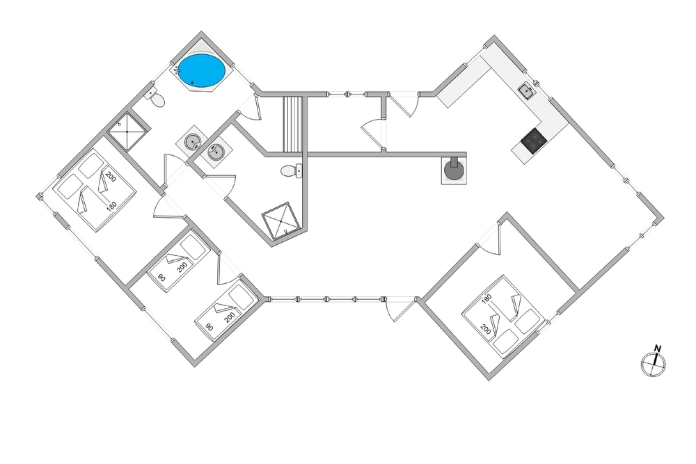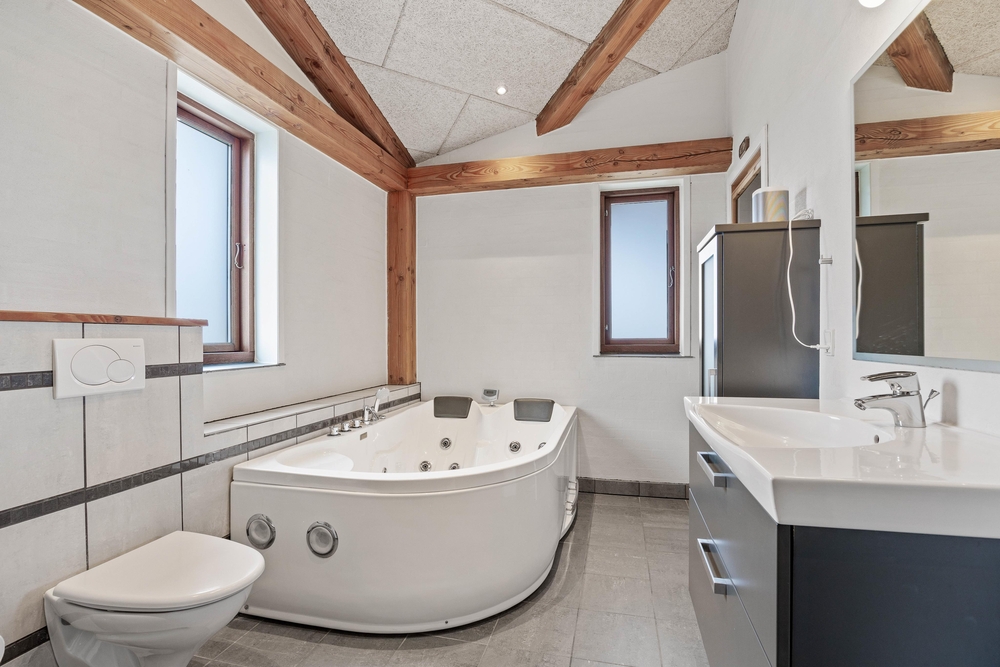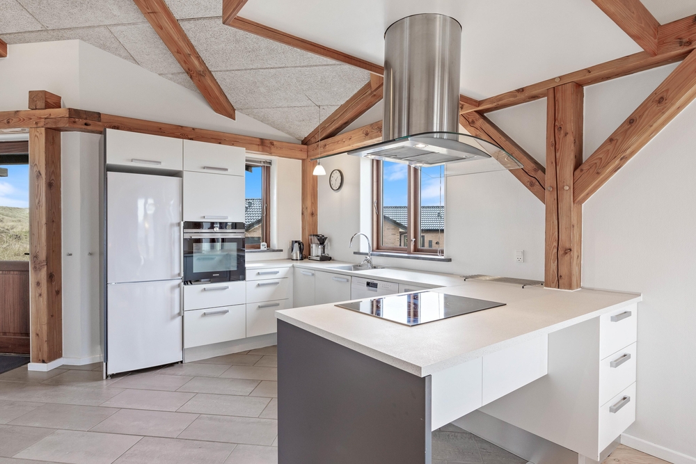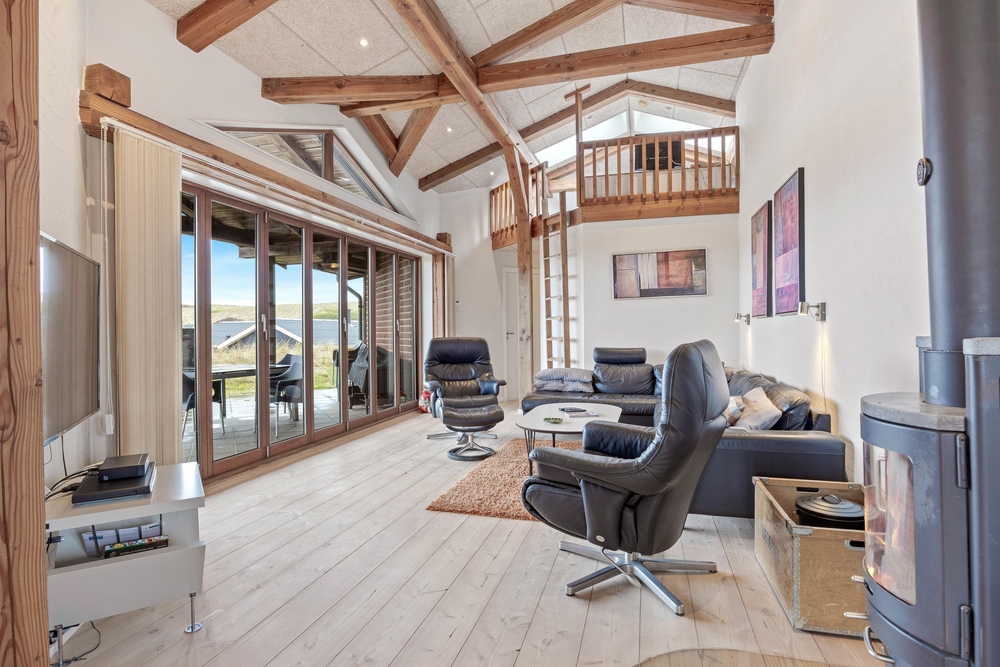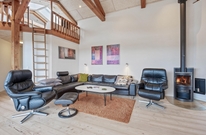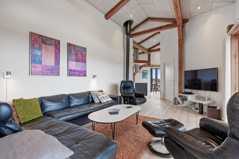 Inde i huset er der heller ikke sparet på detaljerne. De flotte vinkler, kombineret med fritlagte bjælker skaber varme og en hyggelige stemning. Hjerterummet er den store stue i midten. Her er der god plads til at samles med familie og venner, mens ilden knitrer fra brændeovnen. Fra stuen er der adgang til hemsen, som er perfekt til lidt større børn, der gerne vil have deres egne ?hule? ? på ét af de to badeværelser finder I desuden sauna og spa, så I har mulighed for at komme helt ned i gear.