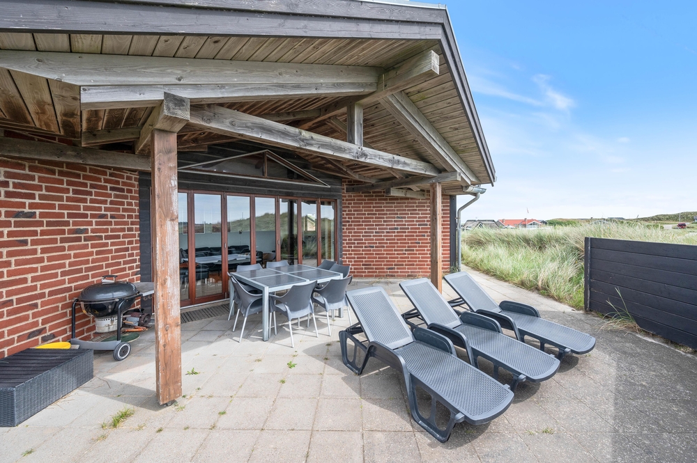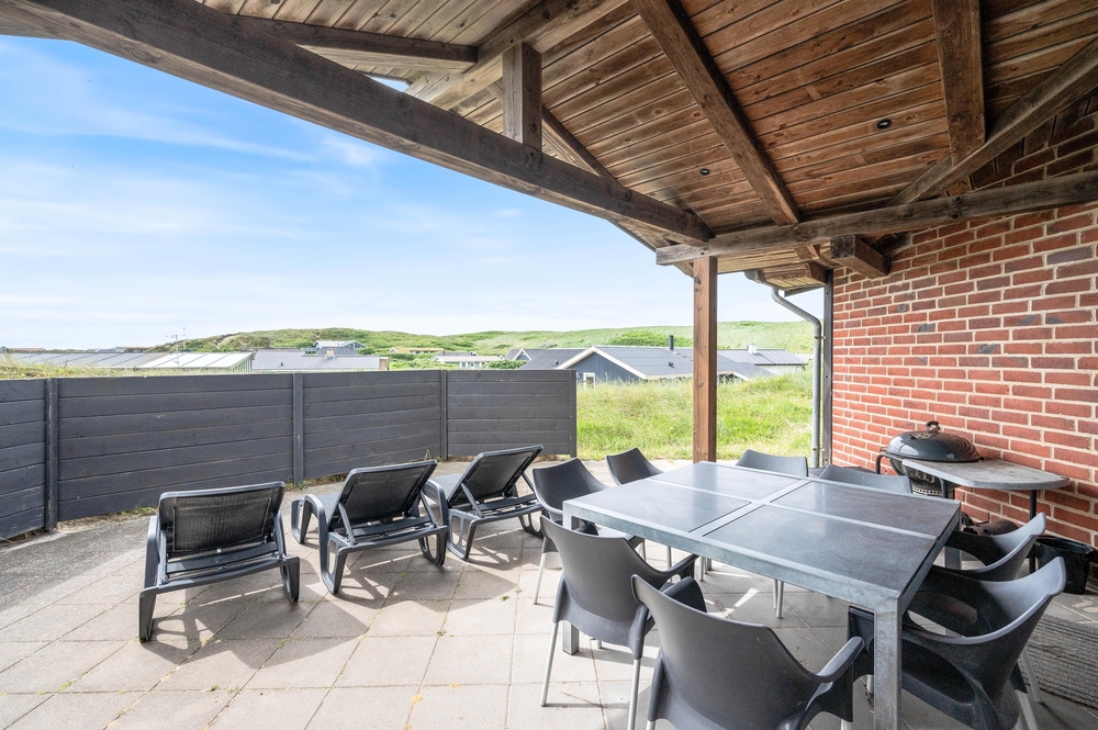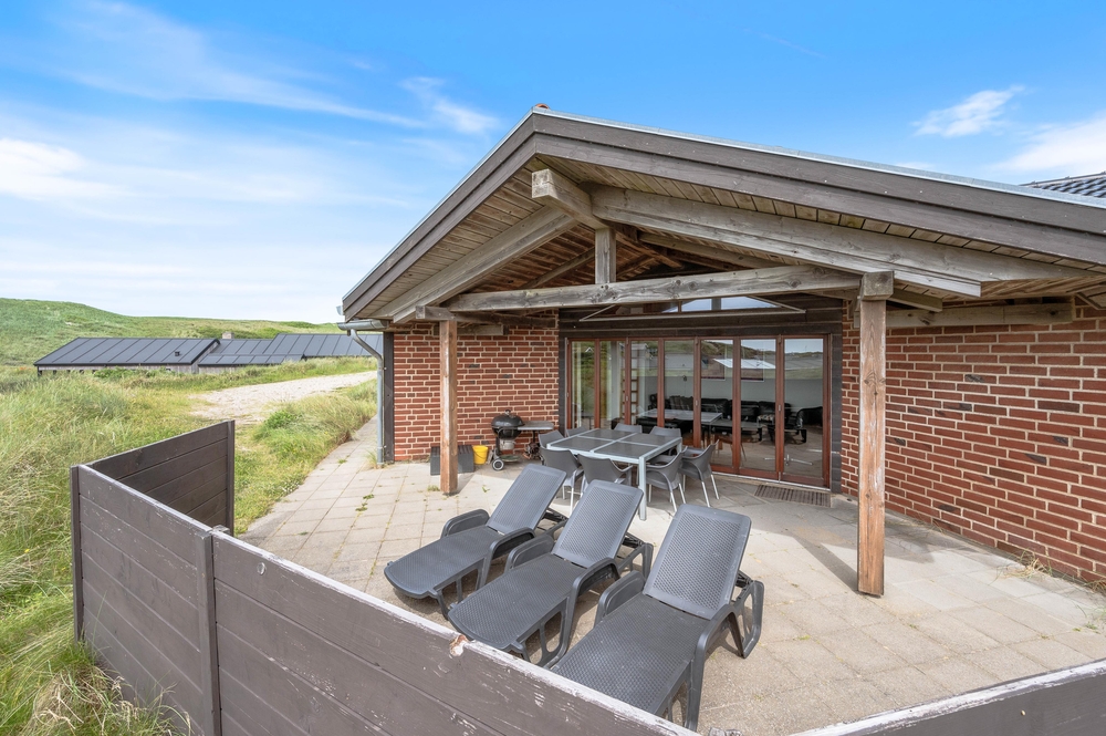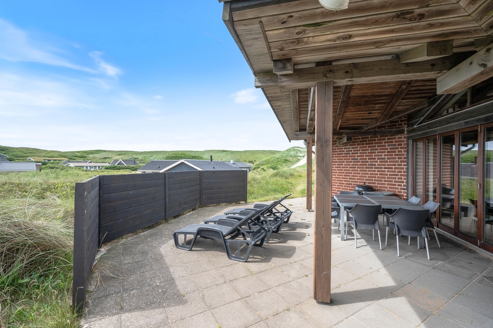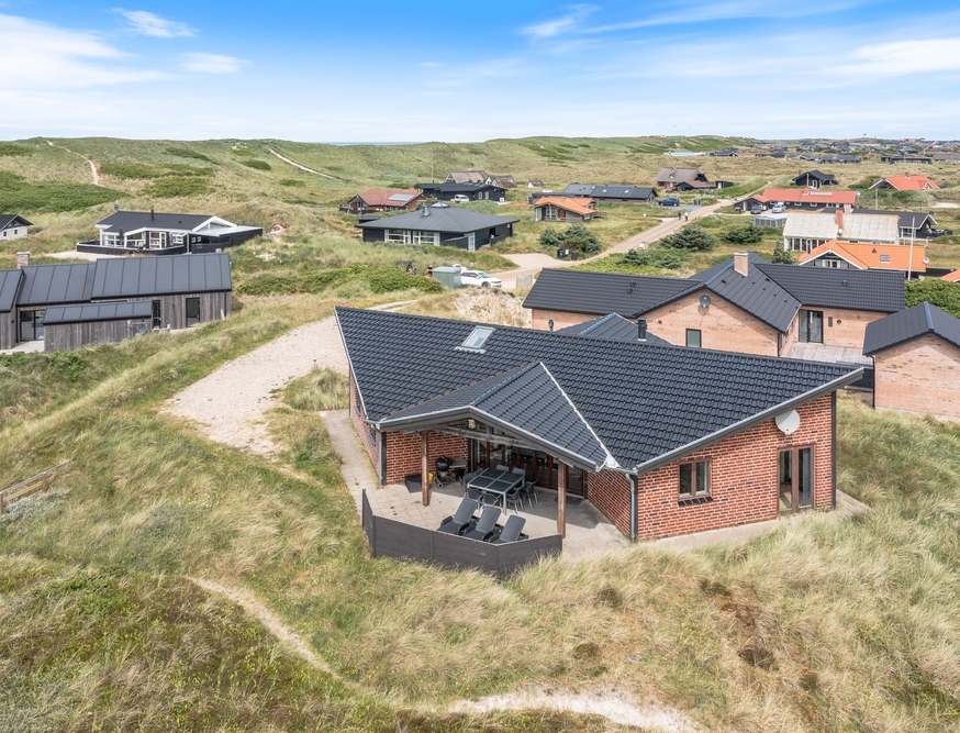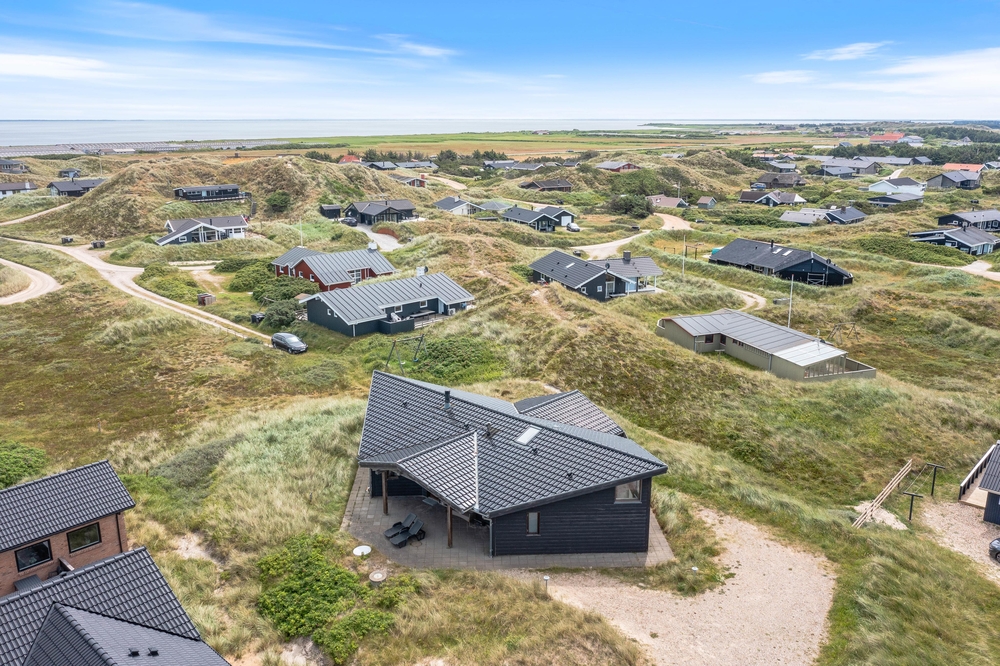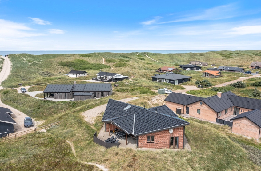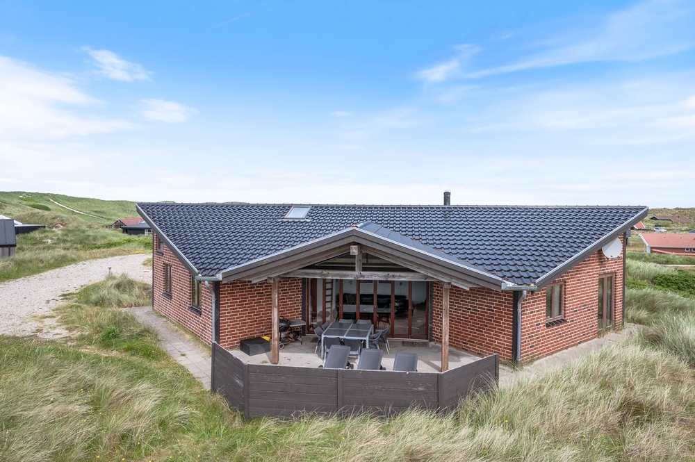 På en skøn, kuperet klitgrund ligger dette helt utroligt flotte og anderledes feriehus, bygget på førsteklassesmaterialer. Fra huset har du en fantastisk udsigt til fjord og klitter, og hele vejen rundt om huset løber en stor terrasse, som er åben såvel som overdækket.
