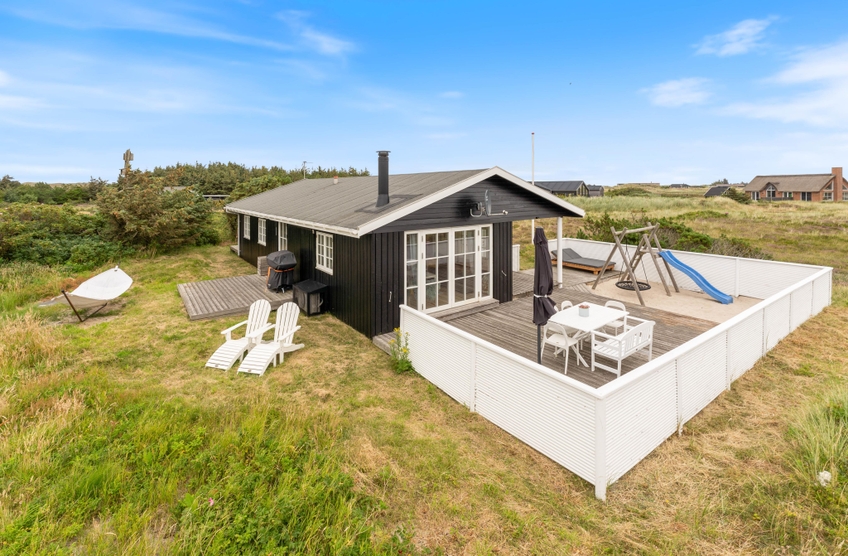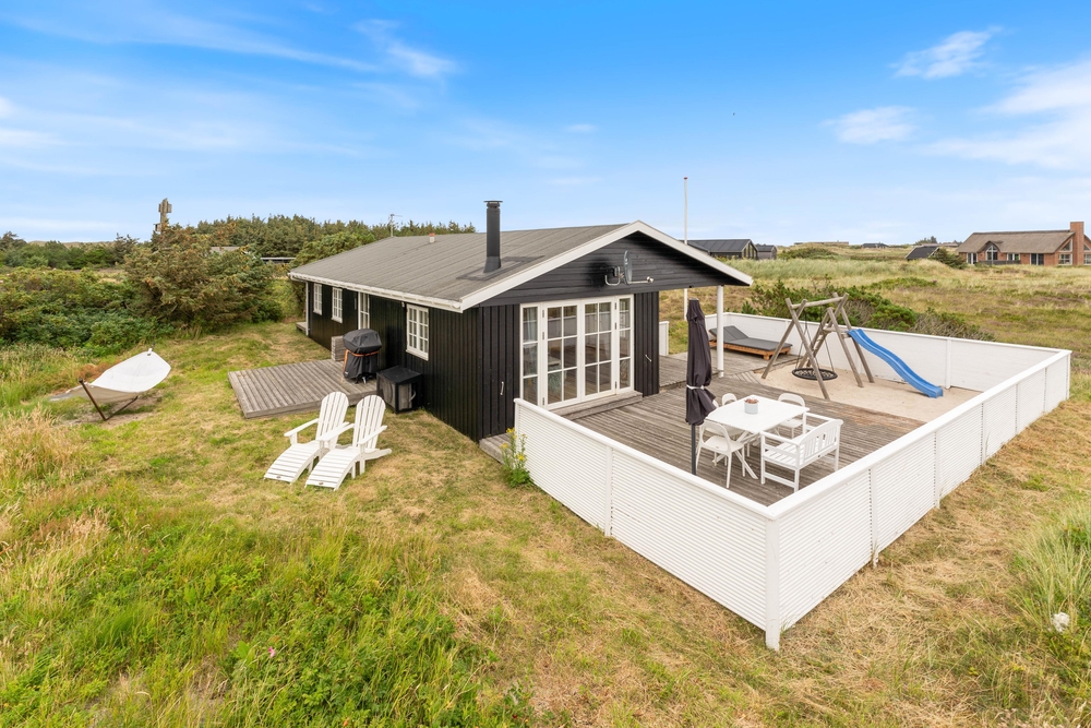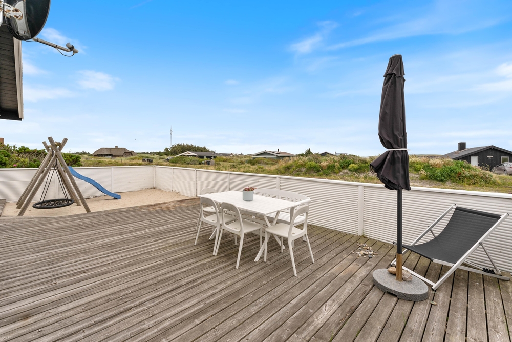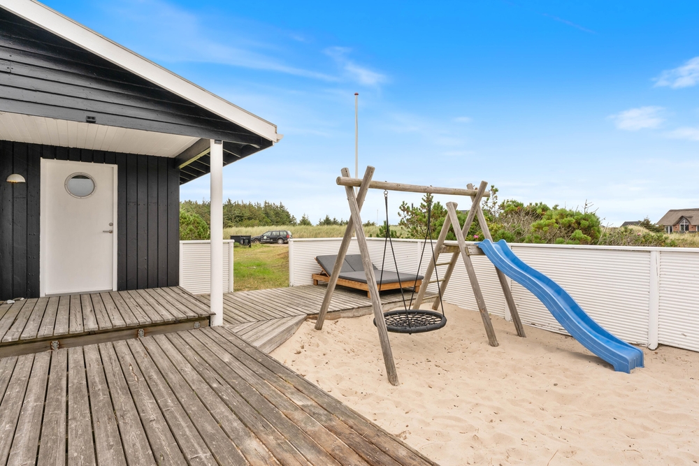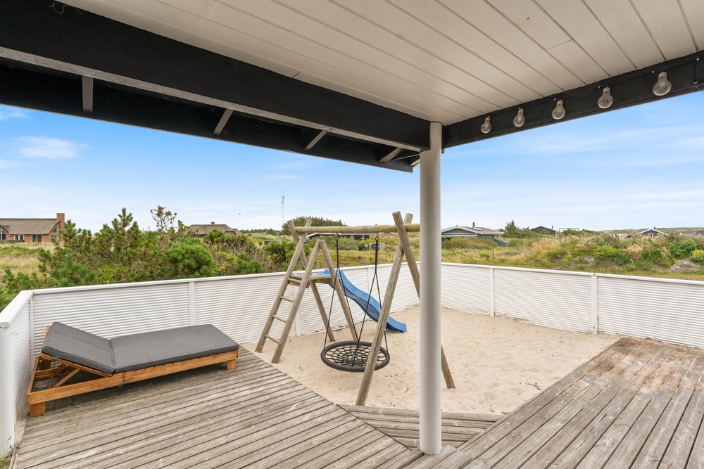 På den store lukkede terrasse er der god plads til hele familien. Der er anlagt en praktisk legeplads på terrassen mod syd med både sansegynge, rutsjebane og sandkasse. Det giver jer mulighed for at nyde solen i liggestolene med en kold drik eller fremtrylle en skøn middag under halvtaget på grillen, alt imens I trygt kan lade børnene lege lige ved siden af.