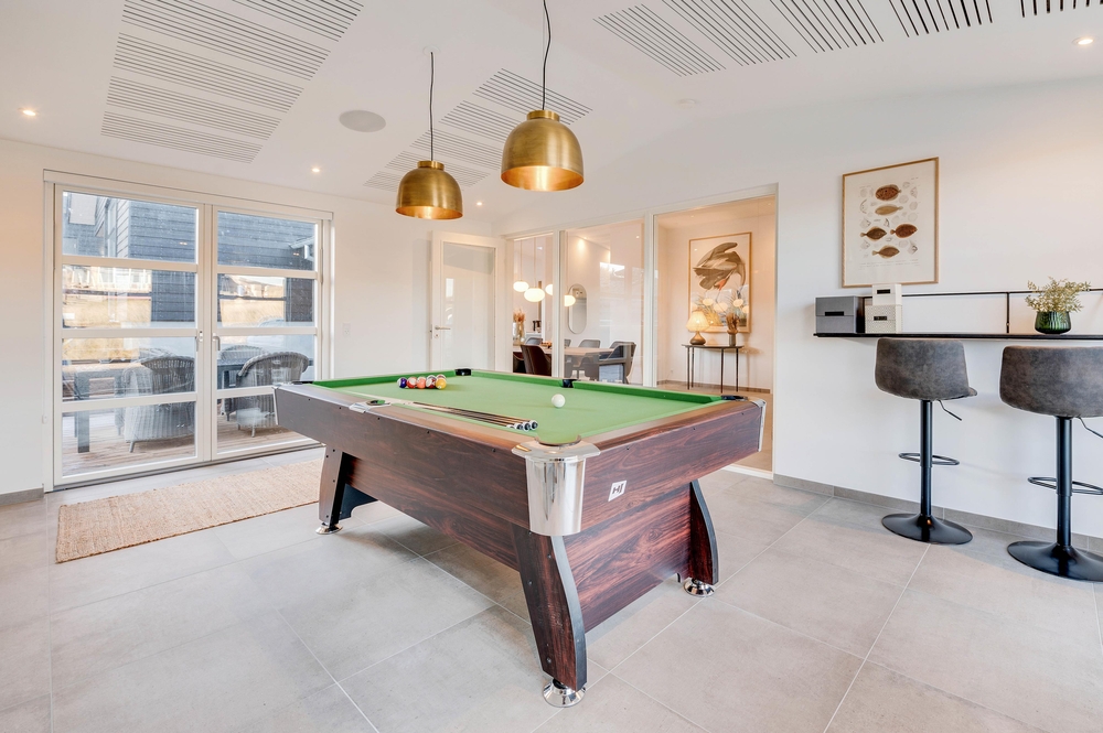 Feriehuset har også et aktivitetsrum med billardbord, hvor I kan snuppe et hyggeligt spil billard over kaffen eller rødvinen. I aktivitetsrummet finder I også en Playstation 5.