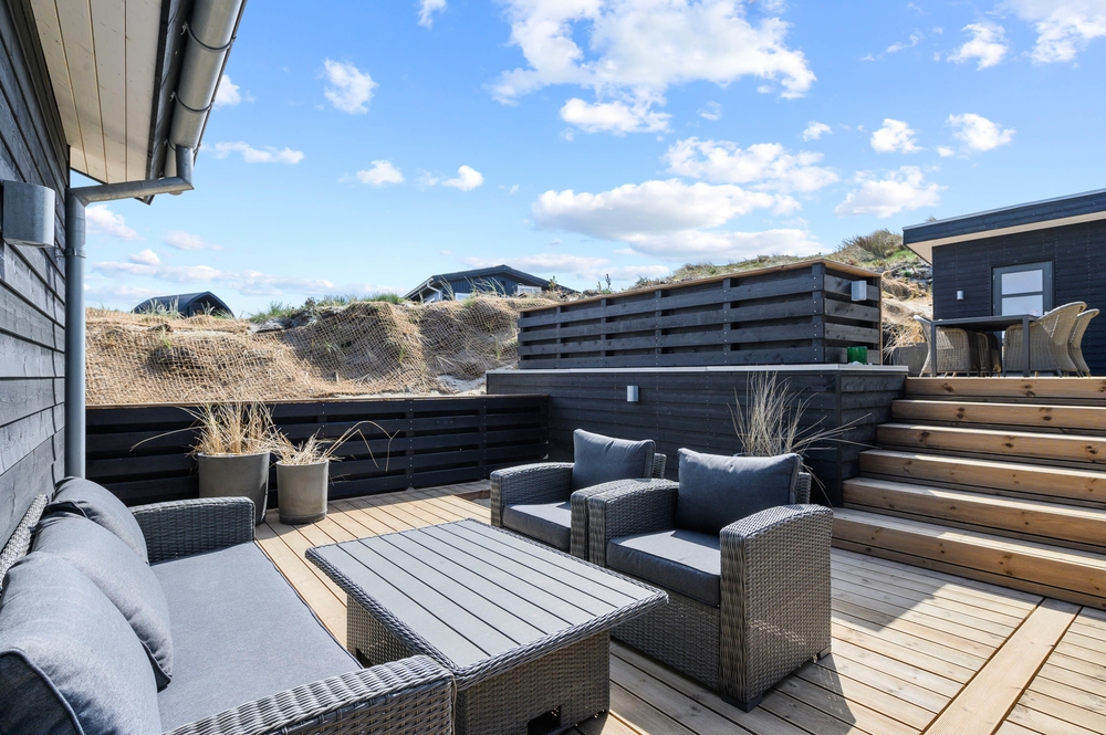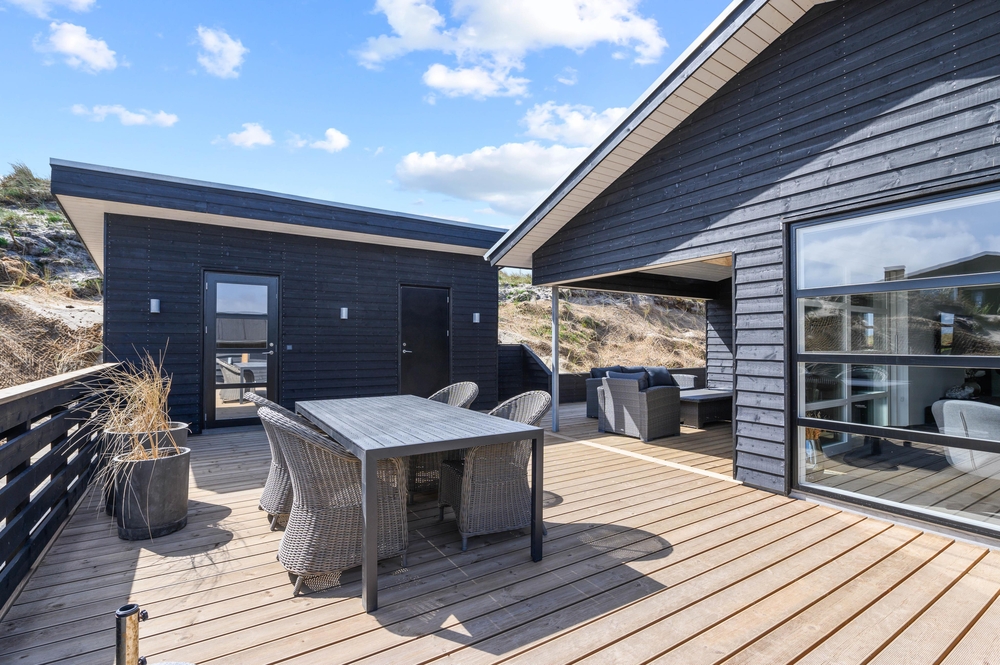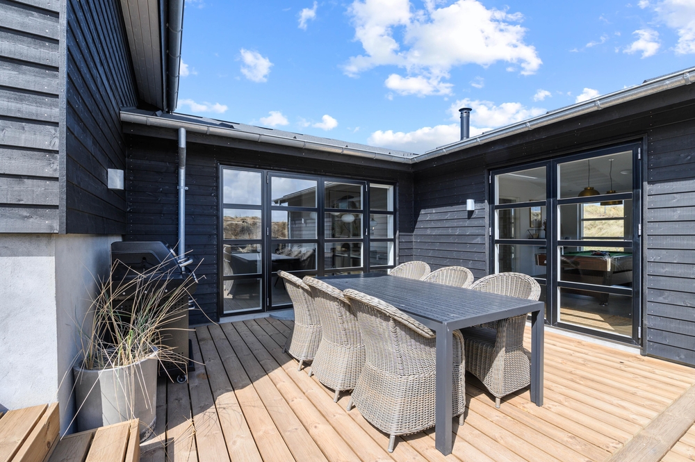 Med til luksushuset hører en fantastisk terrasse, der er lukket hele vejen rundt samt delvist overdækket og afskærmet. Her finder I alle nemt en plads i solen i de gode havemøbler, og om aftenen står grillen klar, så feriekokkene kan slippe deres fantasi løs.