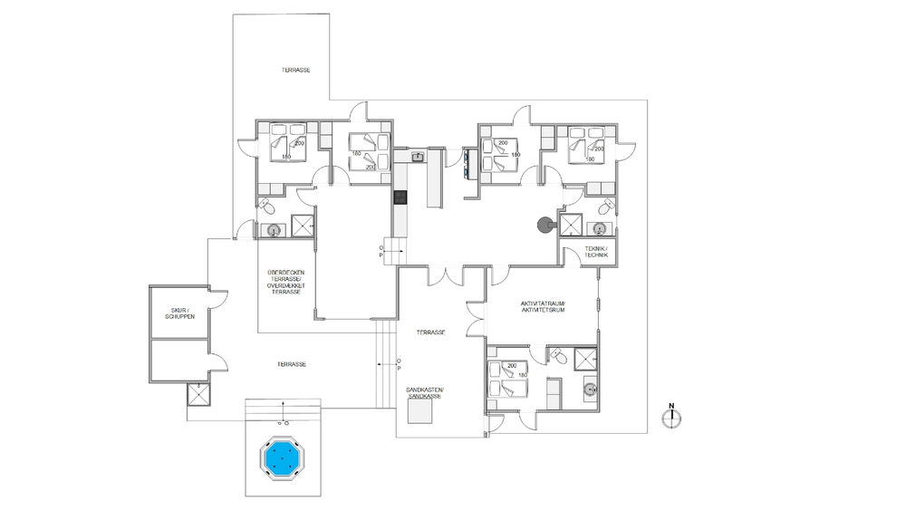 Der er anlagt gulvvarme i både opholdsrummet og de 5 soveværelser, som alle er udstyret med en god, stor 180×200 dobbeltseng. I alt 3 badeværelser står til rådighed, så I slipper for lange køer til badet om morgenen, når I har hele familien eller venneflokken med.