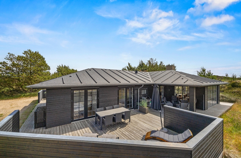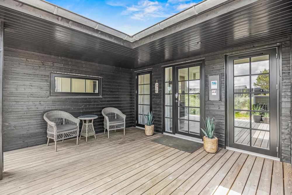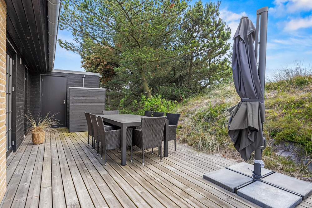 Rundt om luksussommerhuset løber en stor træterrasse, der byder på adskillige muligheder for at nyde den friske luft. På de varme sommerdage er det oplagt at slutte af med en feriemiddag i det fri, og maden er hurtigt tilberedt på feriehusets gasgrill.