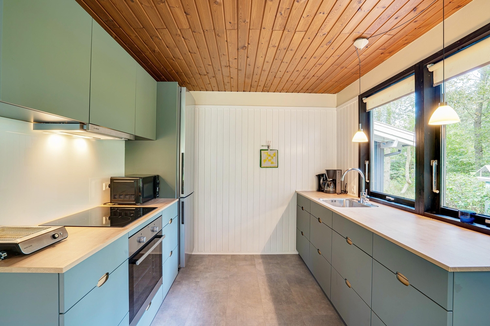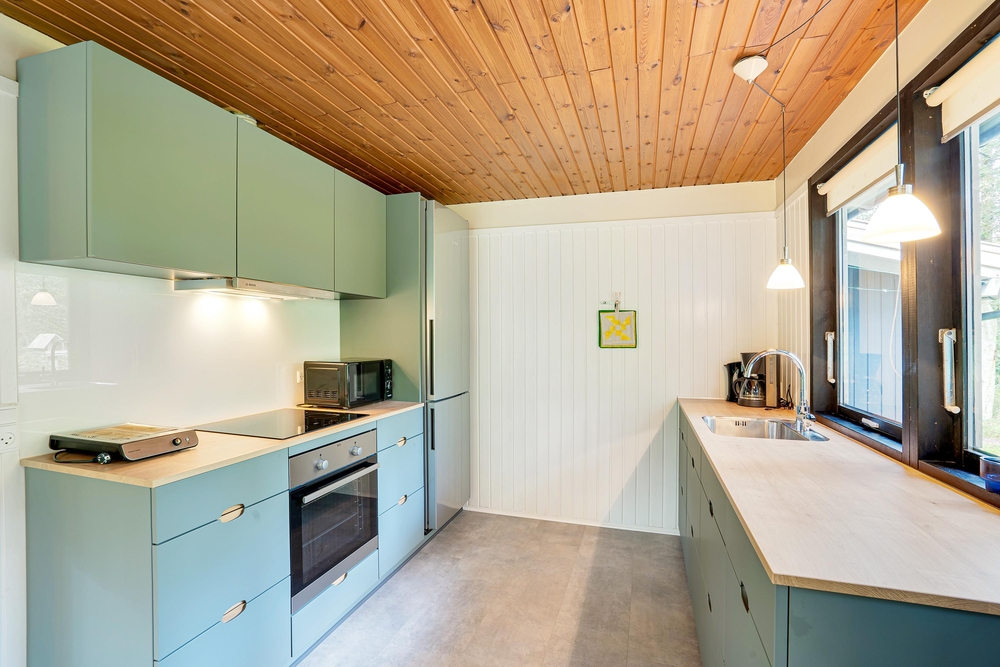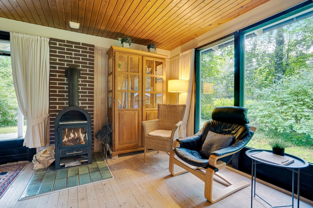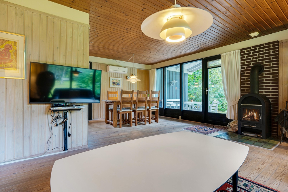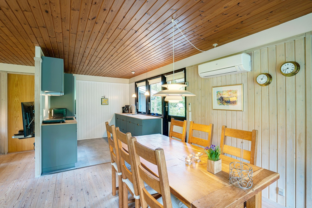 Jeres samlingspunkt i sommerhuset bliver utvivlsomt alrummet, hvor køkken, stue og spiseplads er samlet i ét rum. Her kan I tilbringe mange dejlige feriestunder sammen med madlavning, spil og film. Centralt i alrummet står brændeovnen, der spreder hyggelig stemning og varme i rummet.