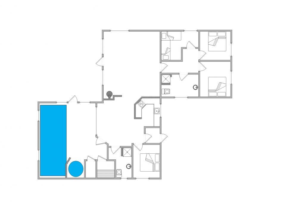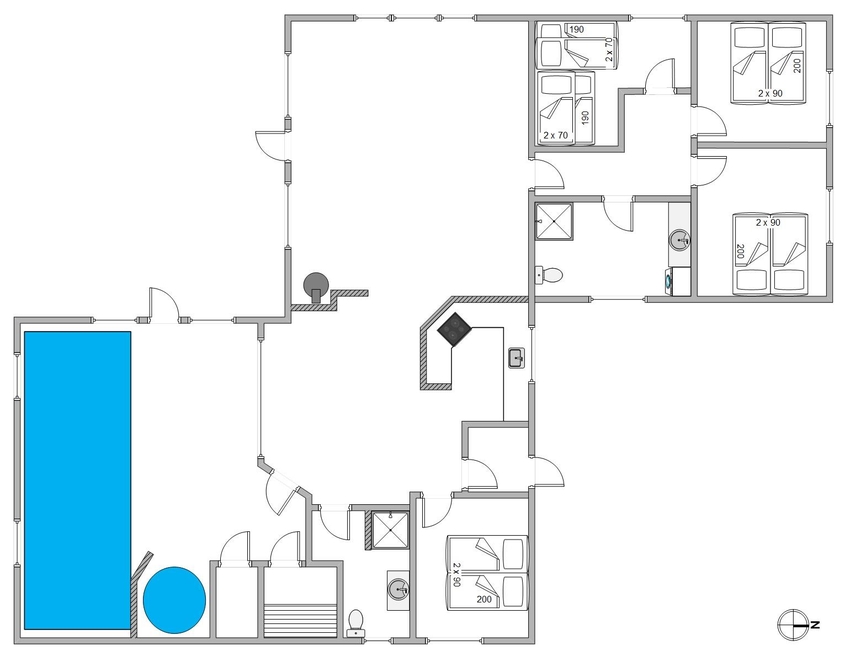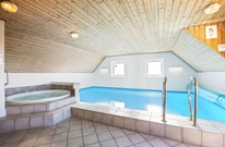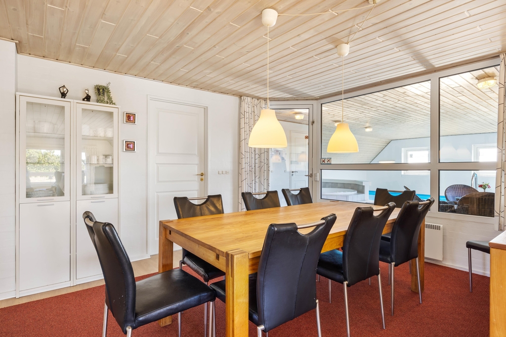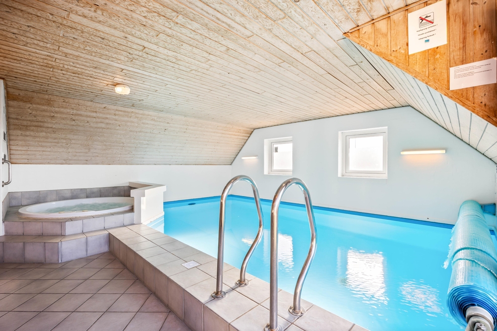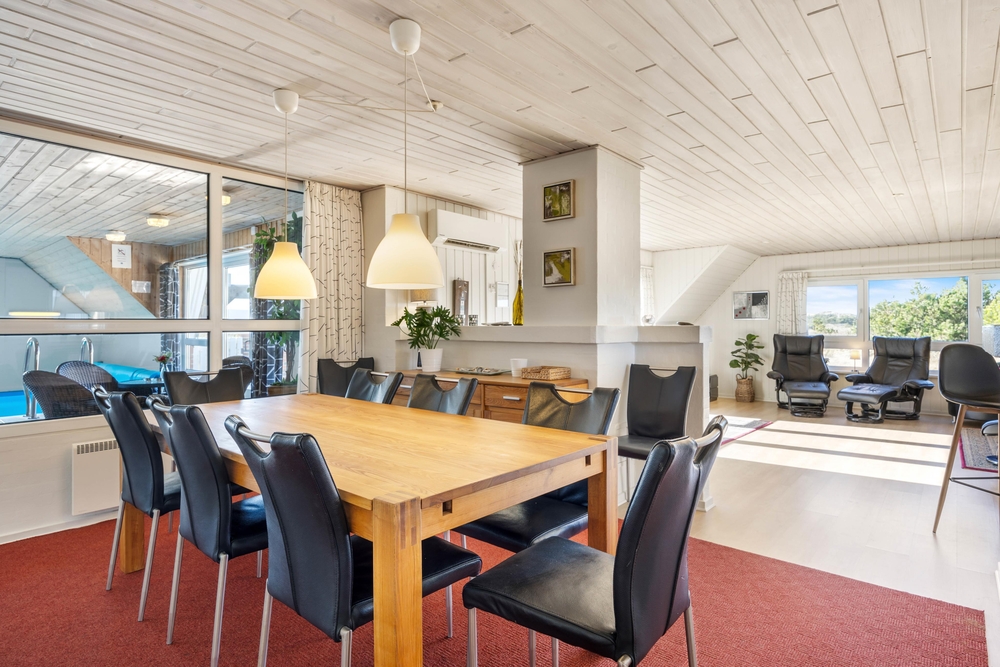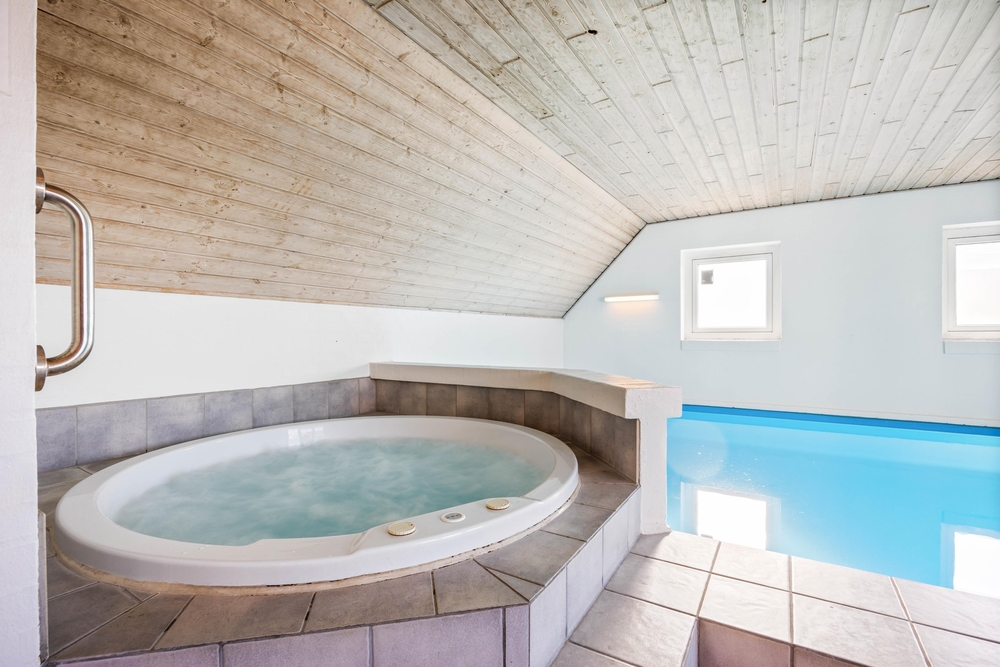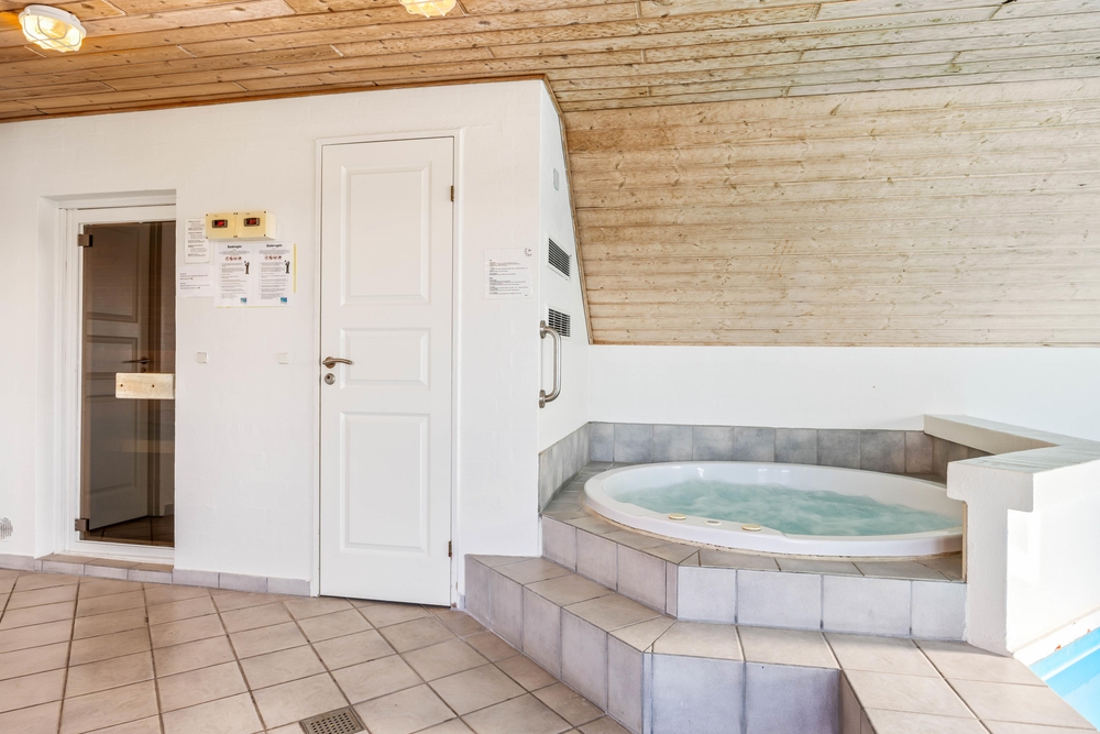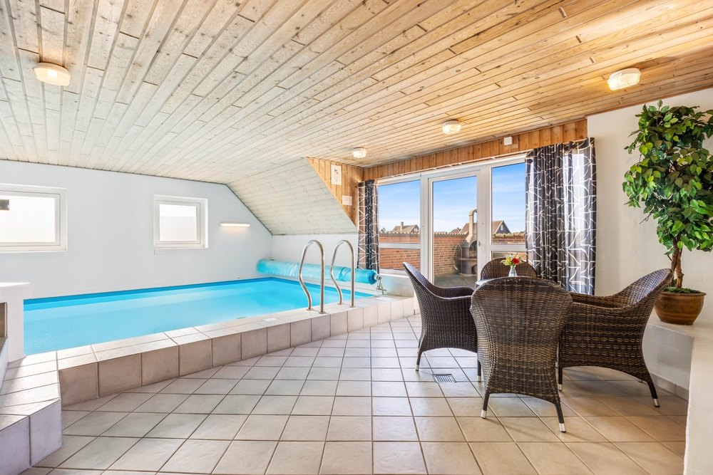 Et af sommerhusets samlingspunkter er poolrummet. Swimmingpoolen på 21 m² har modstrømsanlæg, så der er mulighed for både leg og let motion. Derudover er der en stor spa med plads til 5 personer og en sauna, hvor I kan slappe af efter en aktiv dag. Fra opholdsrummet er der kig til poolområdet, så det er nemt at holde øje med børnene, mens I selv nyder roen i stuen.