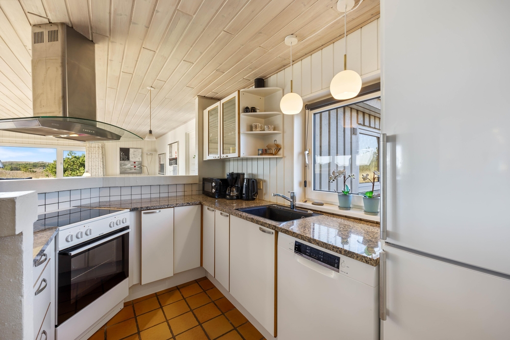 Stranden ligger kun omkring 800 meter fra sommerhuset, og den nærmeste købmand ligger cirka 1 kilometer væk. I nærområdet finder I hede, klitter og stier, der indbyder til både gåture og cykelture. Bjerregård er kendt for sine brede strande og rolige ferieområder, og her får I en god base for jeres ferie.