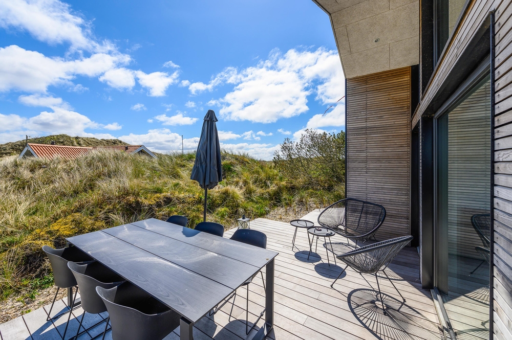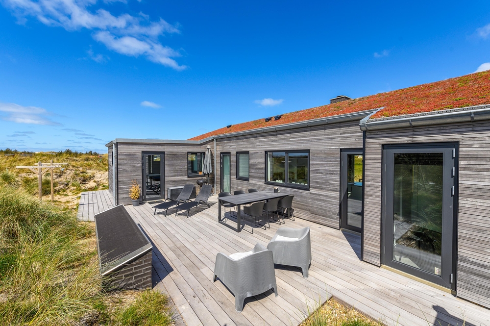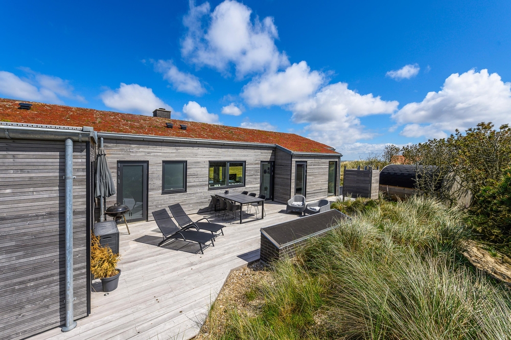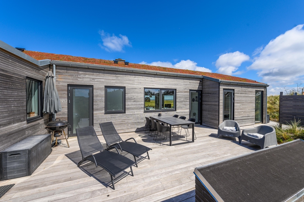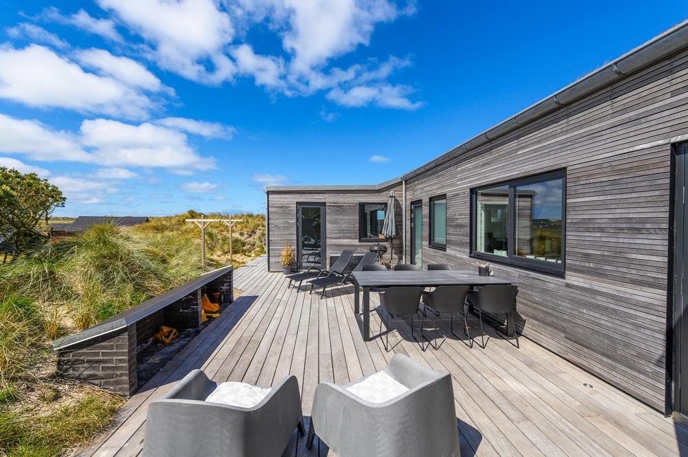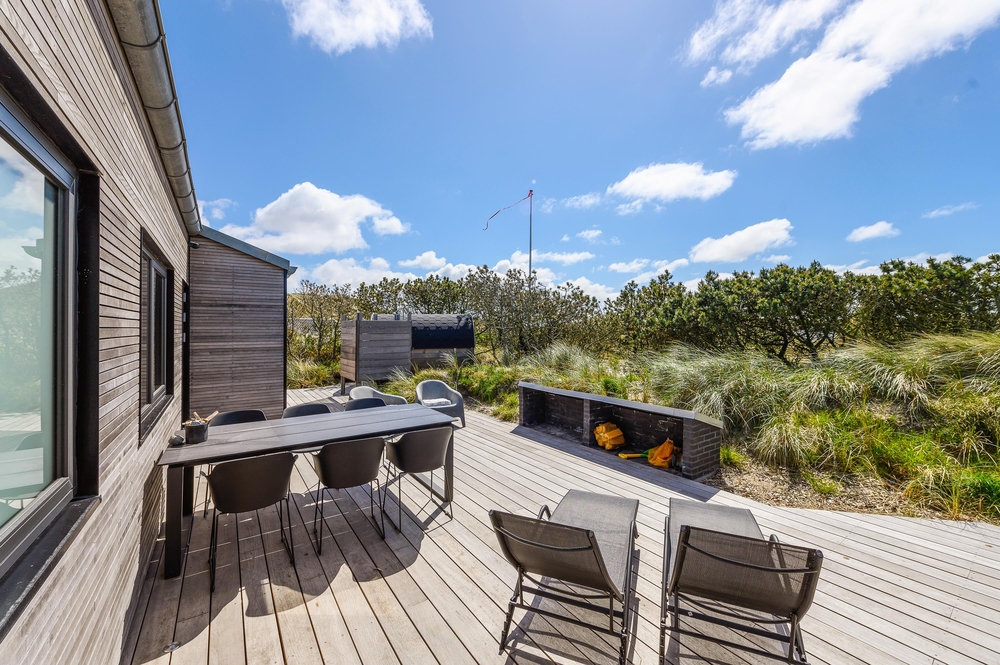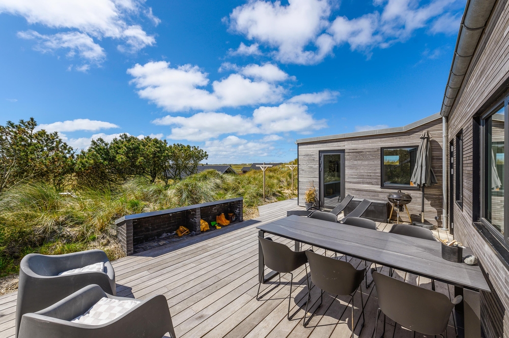 Om aftenen kan man sætte fokus mod sydvest og indtage en hyggelig grillmiddag på husets sydvendte terrasse. ? Her kan man se solnedgangen over klitterne og lytte til Vesterhavets brusen i baggrunden. Det må være den ultimative nydelse og balsam for krop og sjæl, og man kommer garanteret frisk tilbage til hverdagen.