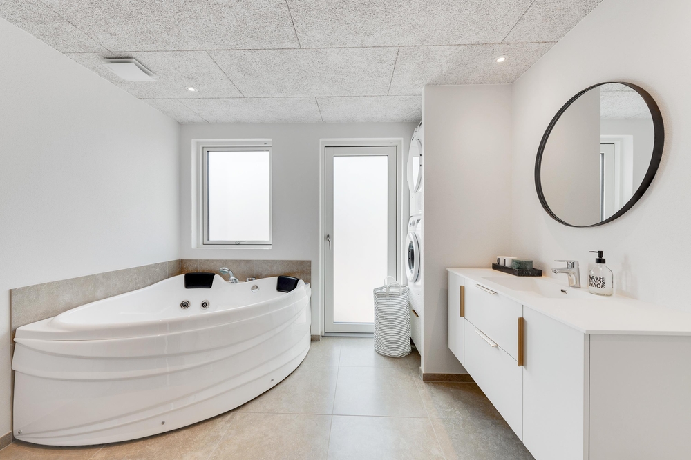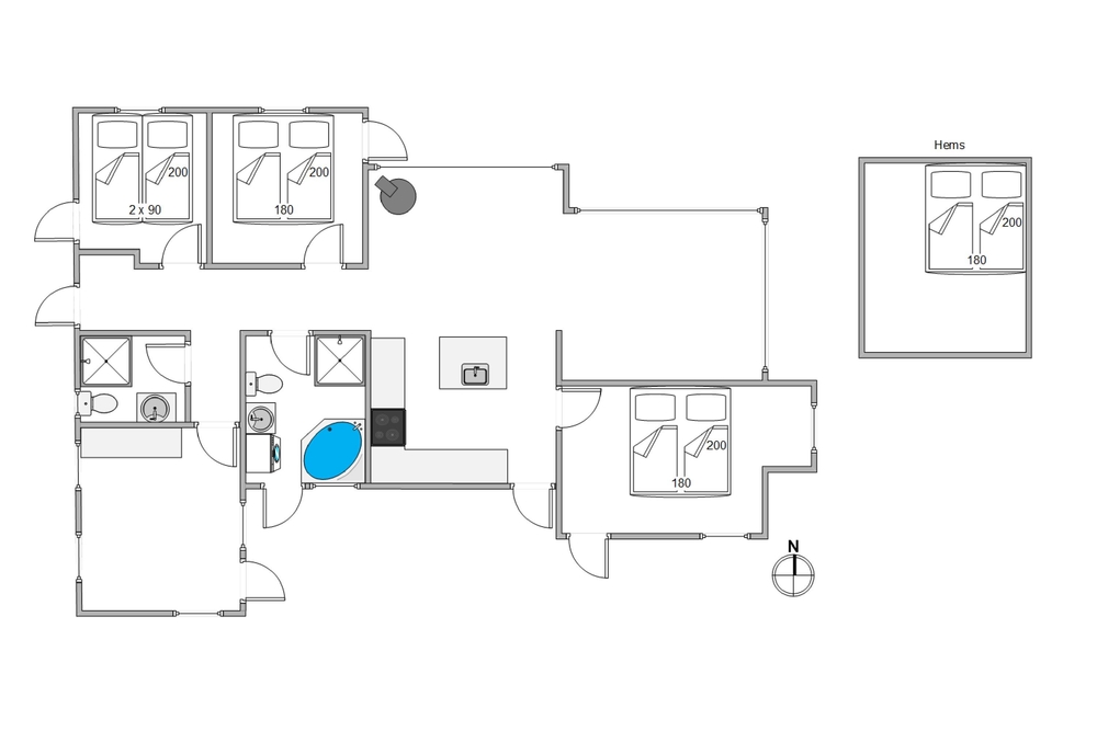 Der er plads til 6 feriegæster her i dette unikke feriehus på Tornbjerrevej 4, fordelt i 3 soverum med hver en dobbeltseng og på en hems, hvor der er yderlig 2 enkeltsenge. Her er også 2 smagfuldt indrettede badeværelser, hvoraf det ene er med en spa.