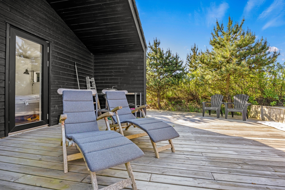 På terrassen finder I desuden et af sommerhusets absolutte highlights. Her står et stort udendørs spabad, som giver jer mulighed for at nyde lidt ekstra wellness på ferien. Forestil jer at slappe af i det varme vand under stjernehimmelen efter en dag fyldt med eventyr.