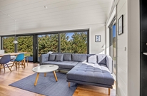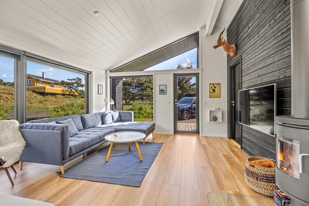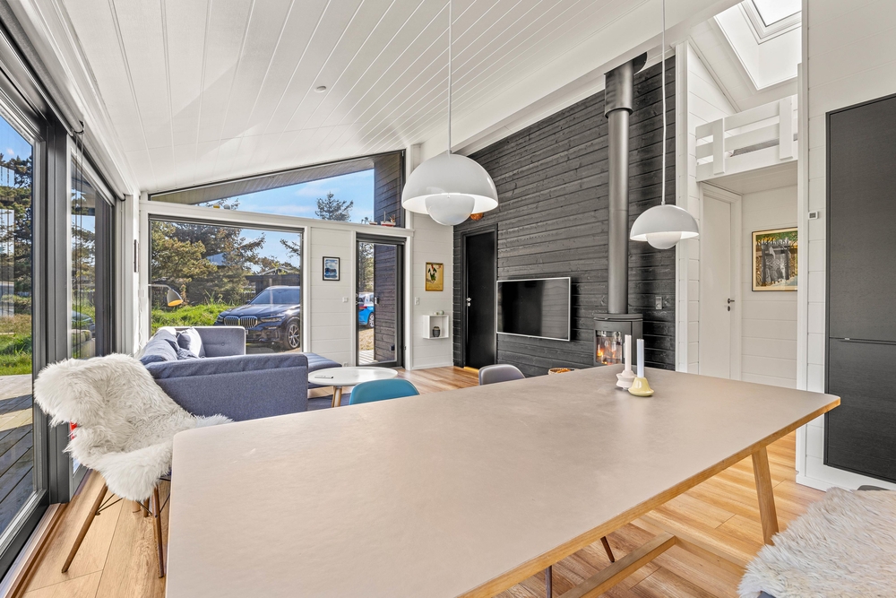 Sommerhusets byder på et charmerende og rummeligt indre, hvor de varme farver og knitrende brændeovn sørger for at skabe den helt rigtige ferieatmosfære. Her er god plads til familielivet ? og I kan både hygge jer med fælles madlavning, brætspil eller dase på sofaen foran tv´et. I rummet sørger en energibesparende varmepumpe for en behagelig indetemperatur året rundt.