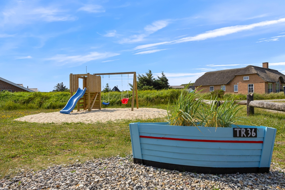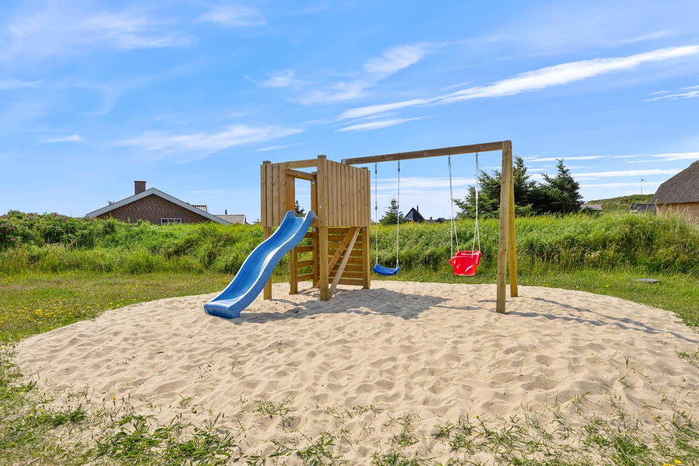 Feriehuset ligger på en dejlig naturgrund, derved har børnene rig mulighed for at lege udenfor på græsplænen, i sandkassen eller ved gyngestativet. I har mulighed for at samles på den lukkede terrasse, hvor der både er havemøbler og solvogne. Bagefter kan I med fordel tænde op i grillen og nyde et godt måltid sammen.