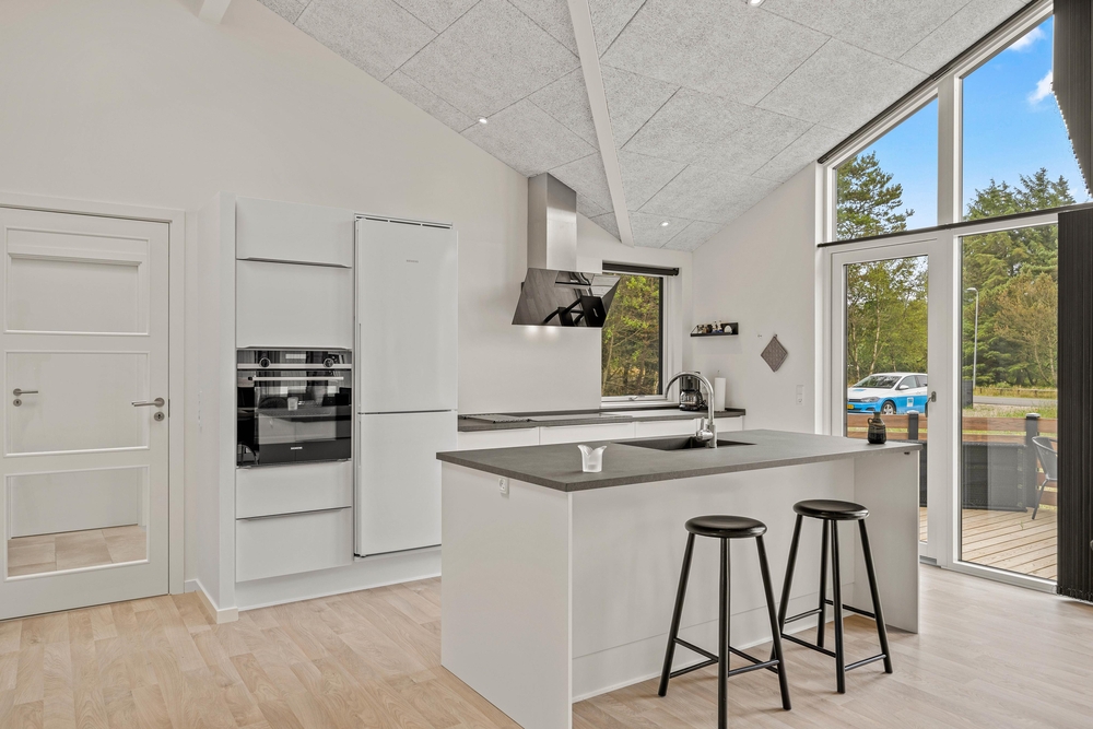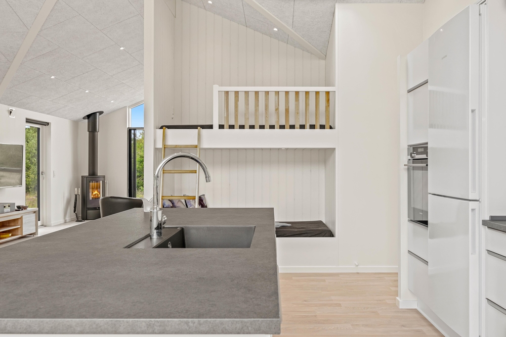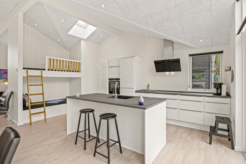 Stuen, som ligger i åben forbindelse med køkkenet, er hjerterummet. Her kan I tilbringe mange hyggelige timer sammen, også selvom I nødvendigvis ikke har gang i de samme ting. I det funktionelle samtalekøkken kan I sammen tilberede et lækkert måltid, eller blot holde kokken med selskab fra barstolene. Tag yndlingsbogen med over i den hyggelige alkove, find brætspillene frem eller måske I mere er til at slå benene op i sofaen. Pop popcornene og find jeres yndlingsfilm frem, så I bare er klar til at have filmhygge. Imens knitrer brændeovnen i baggrunden.
